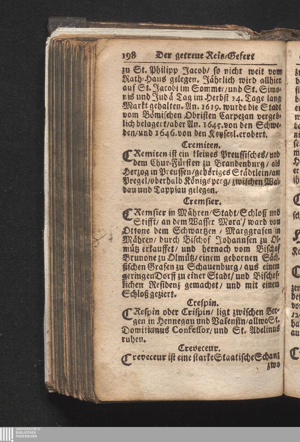 Der getreue Reiß-Gefert durch Ober- und Nieder-Teutschland : Das ist: Grundrichtige und ausführliche Abhandlung derer jenigen Residenzien/ Städte/ Schlösser/ Vestungen/ Städtlein und nahmhafften Markflecken/ welche so wol in Ober- als Nieder-Teutschland/ einem Reisenden sich hin und wieder vorstellig machen und zwar solcher Gestalt/ daß darinn derer Ursprung/ Aufnahm/ Fortification/ Raritäten/ herrliche Gebäue/ und Glück- und Unglücks-Fälle bis auf gegenwärtige Zeit fortgesetzt enthalten. Dabey auch noch über das ein absonderlicher kurz-gefasster Weegweiser angehänget zu finden/ worinnen klärlich zu sehen, wie viel Meilen ein Ort von dem andern entlegen. Alles aus denen bewährtesten Scribenten hervorgesuchet/ zum Nutz-Ergötzen mitgetheilet ...