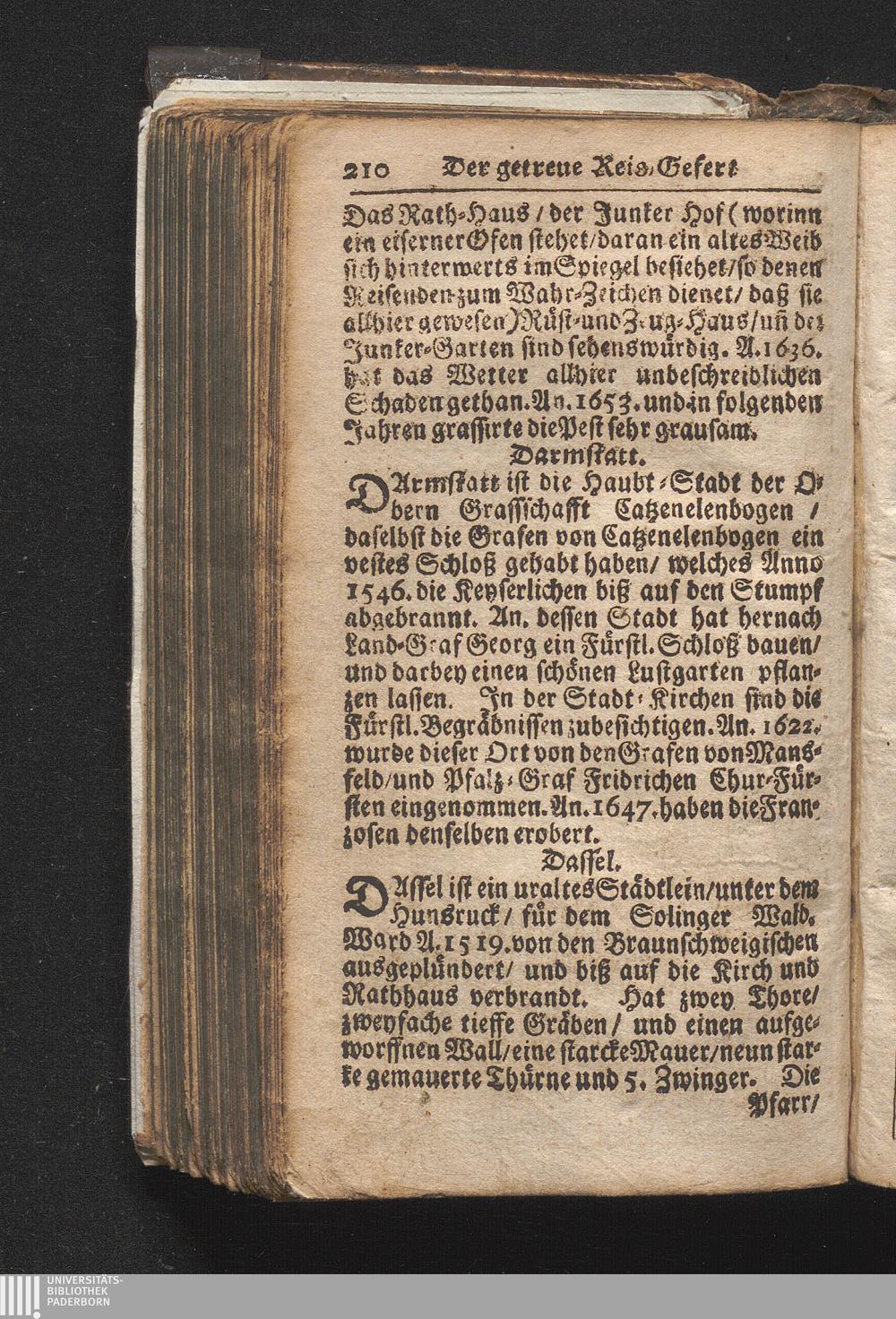 Der getreue Reiß-Gefert durch Ober- und Nieder-Teutschland : Das ist: Grundrichtige und ausführliche Abhandlung derer jenigen Residenzien/ Städte/ Schlösser/ Vestungen/ Städtlein und nahmhafften Markflecken/ welche so wol in Ober- als Nieder-Teutschland/ einem Reisenden sich hin und wieder vorstellig machen und zwar solcher Gestalt/ daß darinn derer Ursprung/ Aufnahm/ Fortification/ Raritäten/ herrliche Gebäue/ und Glück- und Unglücks-Fälle bis auf gegenwärtige Zeit fortgesetzt enthalten. Dabey auch noch über das ein absonderlicher kurz-gefasster Weegweiser angehänget zu finden/ worinnen klärlich zu sehen, wie viel Meilen ein Ort von dem andern entlegen. Alles aus denen bewährtesten Scribenten hervorgesuchet/ zum Nutz-Ergötzen mitgetheilet ...