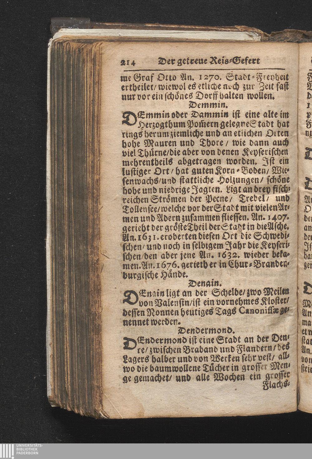 Der getreue Reiß-Gefert durch Ober- und Nieder-Teutschland : Das ist: Grundrichtige und ausführliche Abhandlung derer jenigen Residenzien/ Städte/ Schlösser/ Vestungen/ Städtlein und nahmhafften Markflecken/ welche so wol in Ober- als Nieder-Teutschland/ einem Reisenden sich hin und wieder vorstellig machen und zwar solcher Gestalt/ daß darinn derer Ursprung/ Aufnahm/ Fortification/ Raritäten/ herrliche Gebäue/ und Glück- und Unglücks-Fälle bis auf gegenwärtige Zeit fortgesetzt enthalten. Dabey auch noch über das ein absonderlicher kurz-gefasster Weegweiser angehänget zu finden/ worinnen klärlich zu sehen, wie viel Meilen ein Ort von dem andern entlegen. Alles aus denen bewährtesten Scribenten hervorgesuchet/ zum Nutz-Ergötzen mitgetheilet ...