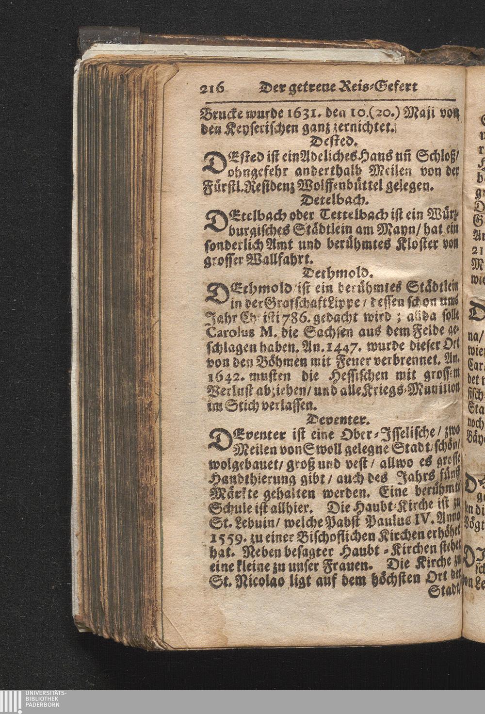 Der getreue Reiß-Gefert durch Ober- und Nieder-Teutschland : Das ist: Grundrichtige und ausführliche Abhandlung derer jenigen Residenzien/ Städte/ Schlösser/ Vestungen/ Städtlein und nahmhafften Markflecken/ welche so wol in Ober- als Nieder-Teutschland/ einem Reisenden sich hin und wieder vorstellig machen und zwar solcher Gestalt/ daß darinn derer Ursprung/ Aufnahm/ Fortification/ Raritäten/ herrliche Gebäue/ und Glück- und Unglücks-Fälle bis auf gegenwärtige Zeit fortgesetzt enthalten. Dabey auch noch über das ein absonderlicher kurz-gefasster Weegweiser angehänget zu finden/ worinnen klärlich zu sehen, wie viel Meilen ein Ort von dem andern entlegen. Alles aus denen bewährtesten Scribenten hervorgesuchet/ zum Nutz-Ergötzen mitgetheilet ...