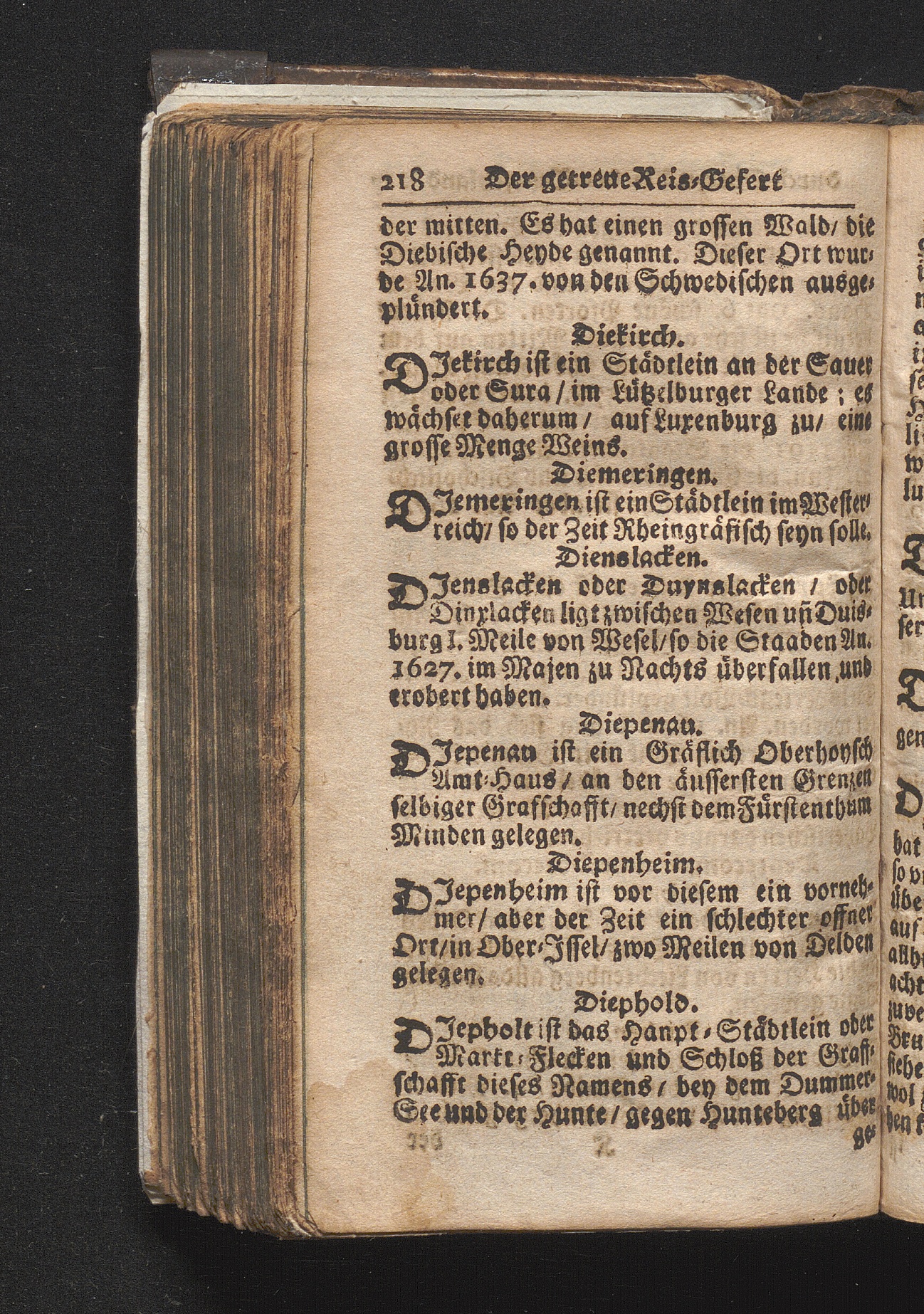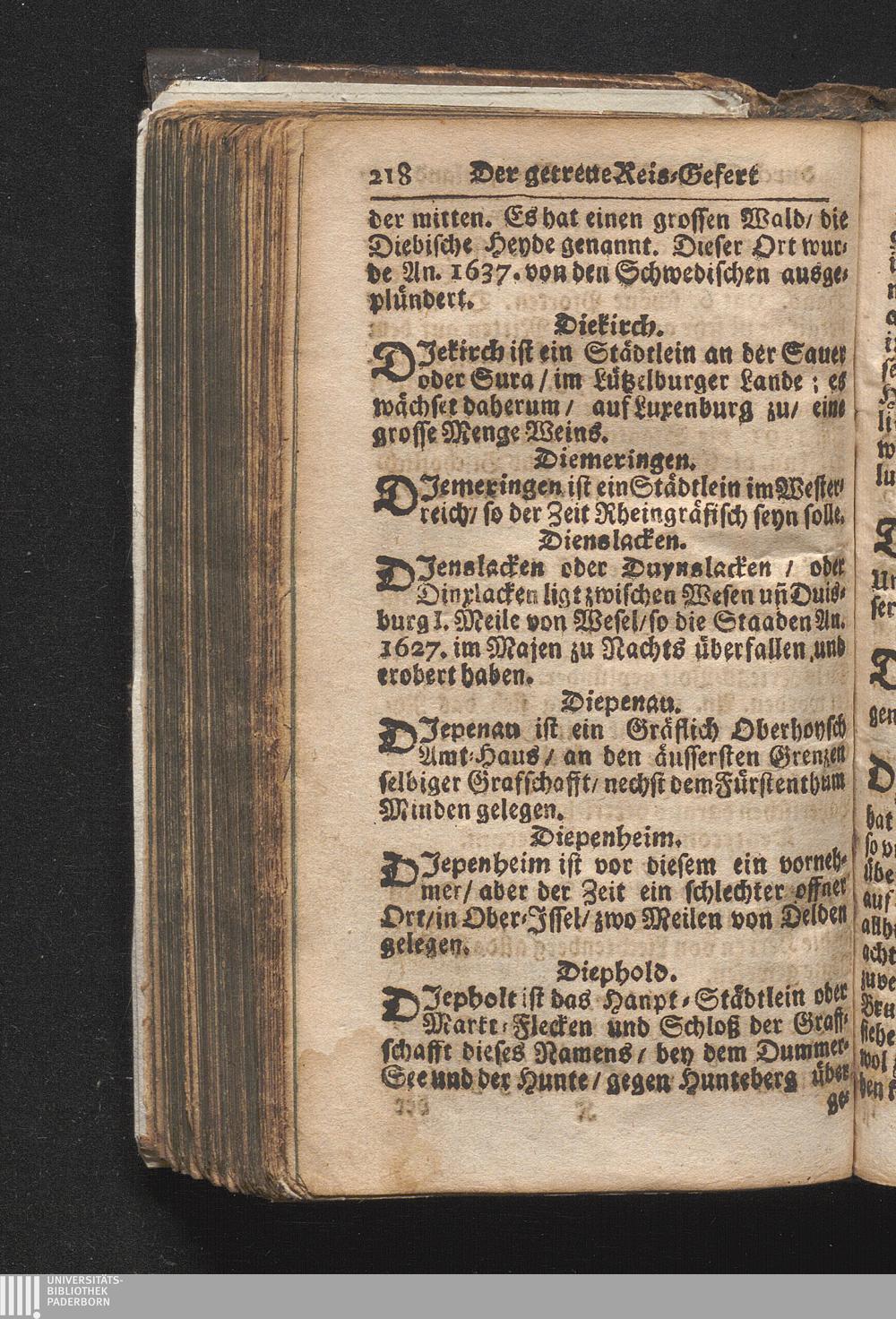 Der getreue Reiß-Gefert durch Ober- und Nieder-Teutschland : Das ist: Grundrichtige und ausführliche Abhandlung derer jenigen Residenzien/ Städte/ Schlösser/ Vestungen/ Städtlein und nahmhafften Markflecken/ welche so wol in Ober- als Nieder-Teutschland/ einem Reisenden sich hin und wieder vorstellig machen und zwar solcher Gestalt/ daß darinn derer Ursprung/ Aufnahm/ Fortification/ Raritäten/ herrliche Gebäue/ und Glück- und Unglücks-Fälle bis auf gegenwärtige Zeit fortgesetzt enthalten. Dabey auch noch über das ein absonderlicher kurz-gefasster Weegweiser angehänget zu finden/ worinnen klärlich zu sehen, wie viel Meilen ein Ort von dem andern entlegen. Alles aus denen bewährtesten Scribenten hervorgesuchet/ zum Nutz-Ergötzen mitgetheilet ...