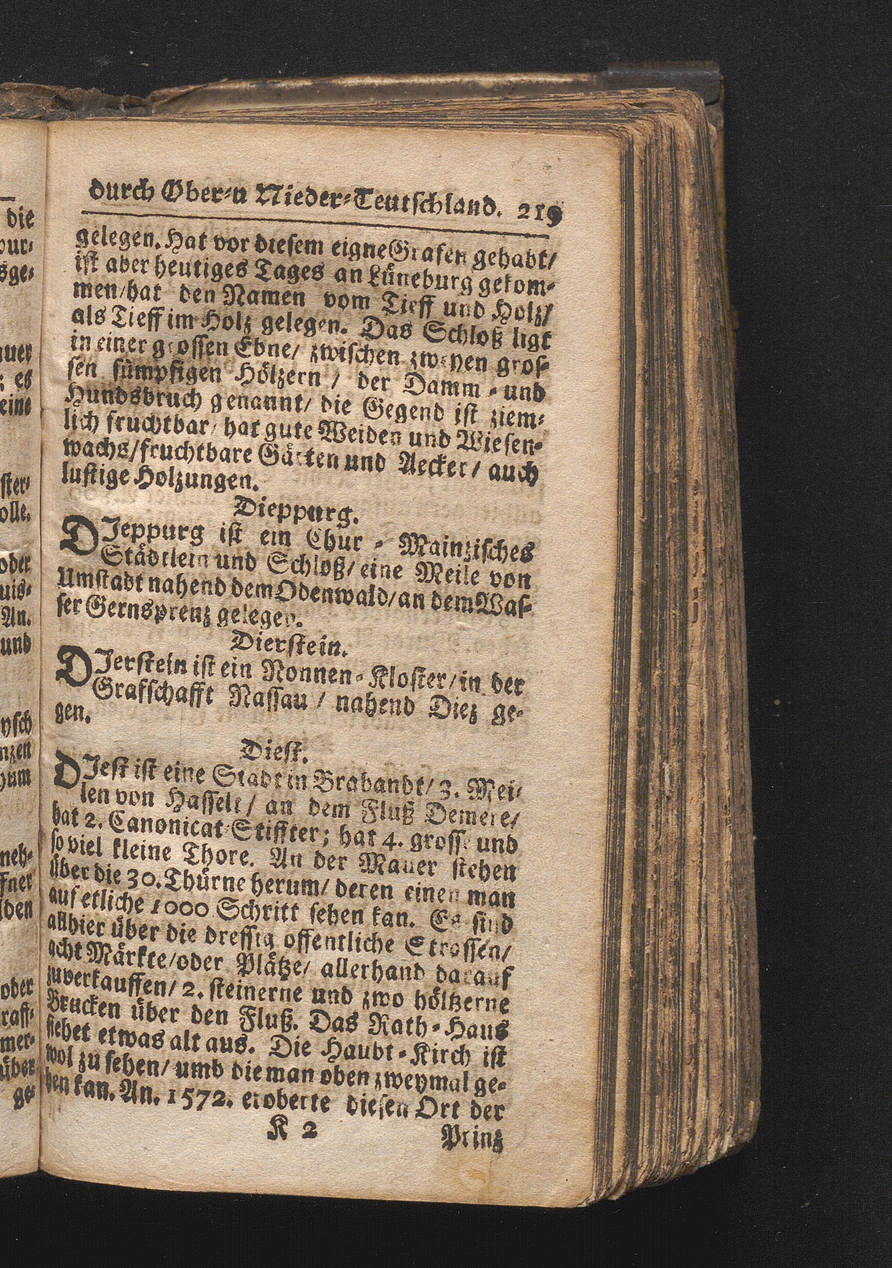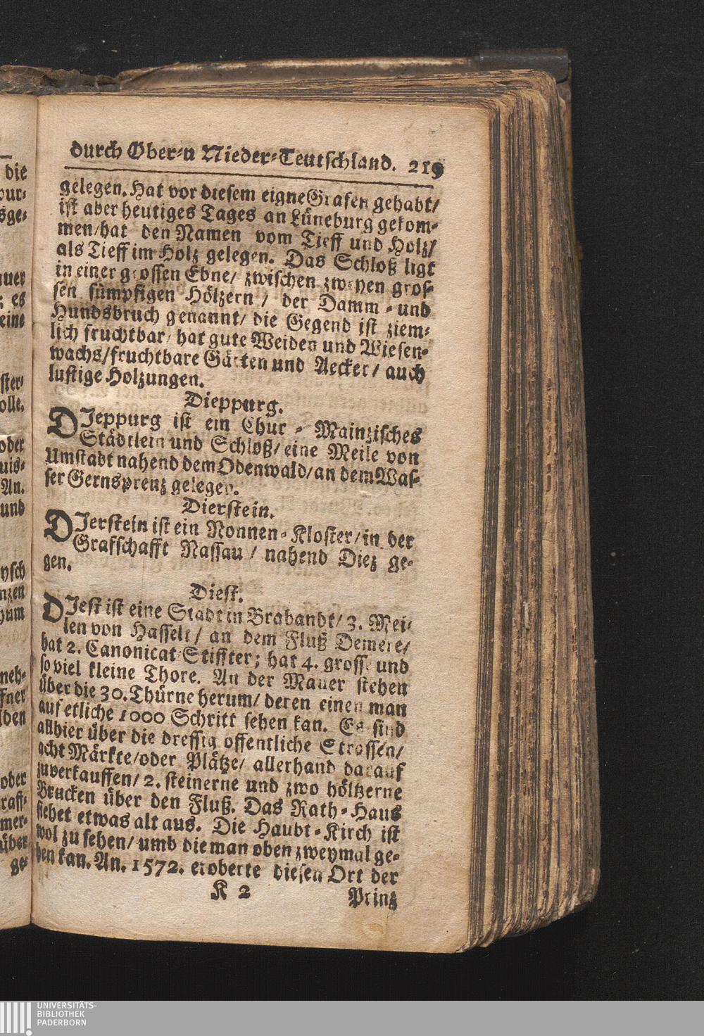 Der getreue Reiß-Gefert durch Ober- und Nieder-Teutschland : Das ist: Grundrichtige und ausführliche Abhandlung derer jenigen Residenzien/ Städte/ Schlösser/ Vestungen/ Städtlein und nahmhafften Markflecken/ welche so wol in Ober- als Nieder-Teutschland/ einem Reisenden sich hin und wieder vorstellig machen und zwar solcher Gestalt/ daß darinn derer Ursprung/ Aufnahm/ Fortification/ Raritäten/ herrliche Gebäue/ und Glück- und Unglücks-Fälle bis auf gegenwärtige Zeit fortgesetzt enthalten. Dabey auch noch über das ein absonderlicher kurz-gefasster Weegweiser angehänget zu finden/ worinnen klärlich zu sehen, wie viel Meilen ein Ort von dem andern entlegen. Alles aus denen bewährtesten Scribenten hervorgesuchet/ zum Nutz-Ergötzen mitgetheilet ...