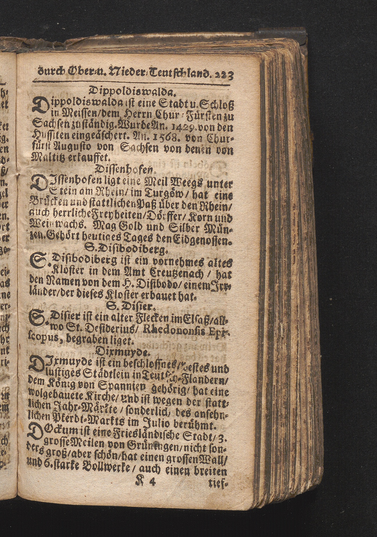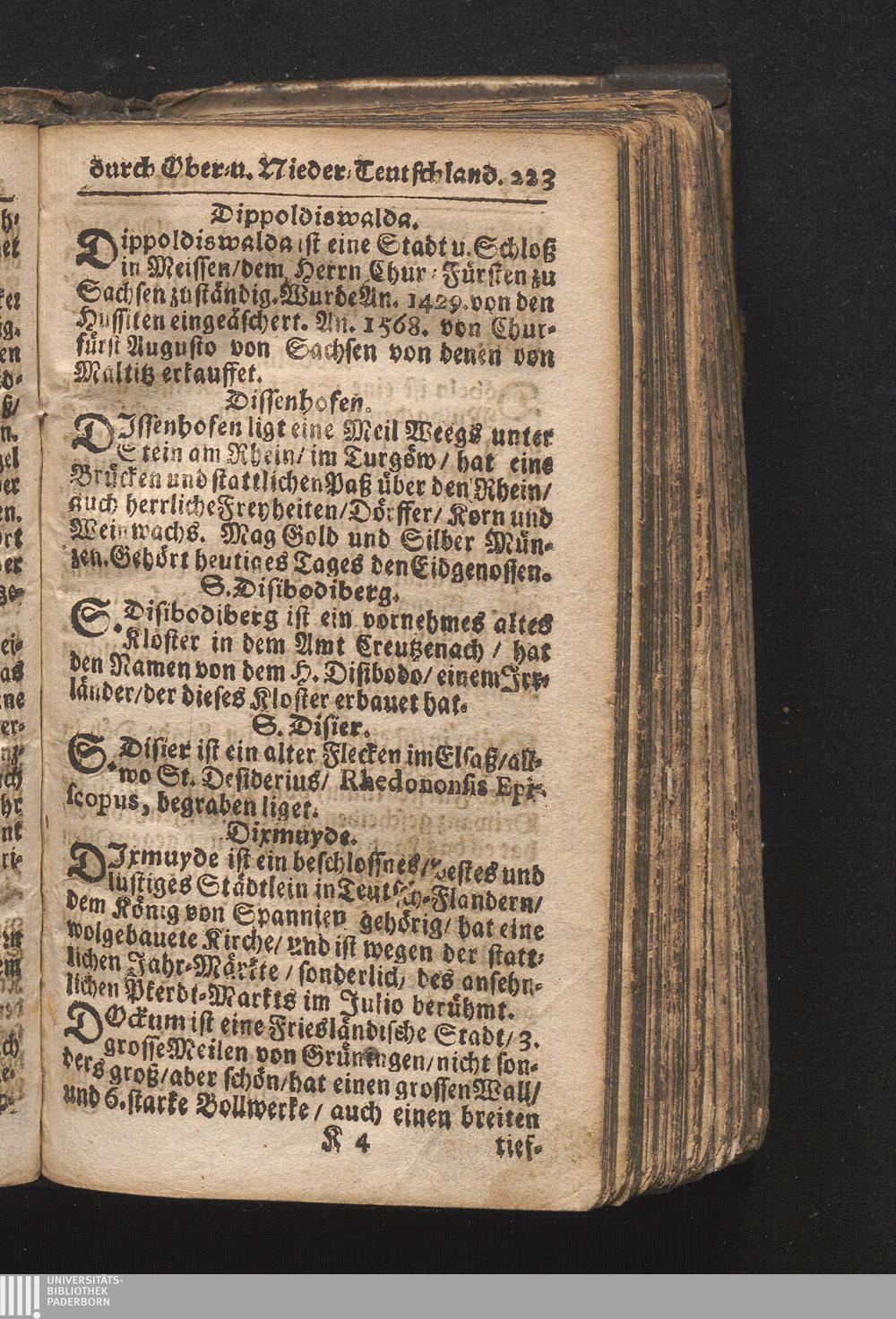 Der getreue Reiß-Gefert durch Ober- und Nieder-Teutschland : Das ist: Grundrichtige und ausführliche Abhandlung derer jenigen Residenzien/ Städte/ Schlösser/ Vestungen/ Städtlein und nahmhafften Markflecken/ welche so wol in Ober- als Nieder-Teutschland/ einem Reisenden sich hin und wieder vorstellig machen und zwar solcher Gestalt/ daß darinn derer Ursprung/ Aufnahm/ Fortification/ Raritäten/ herrliche Gebäue/ und Glück- und Unglücks-Fälle bis auf gegenwärtige Zeit fortgesetzt enthalten. Dabey auch noch über das ein absonderlicher kurz-gefasster Weegweiser angehänget zu finden/ worinnen klärlich zu sehen, wie viel Meilen ein Ort von dem andern entlegen. Alles aus denen bewährtesten Scribenten hervorgesuchet/ zum Nutz-Ergötzen mitgetheilet ...