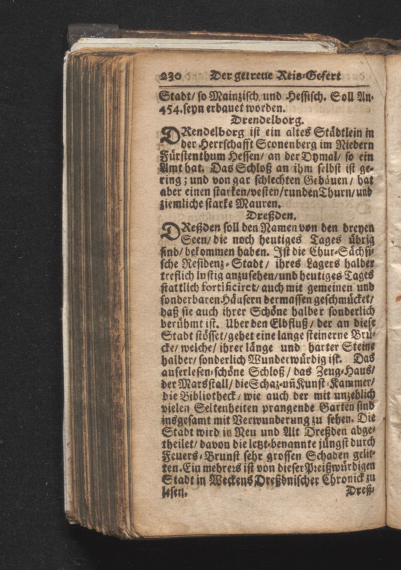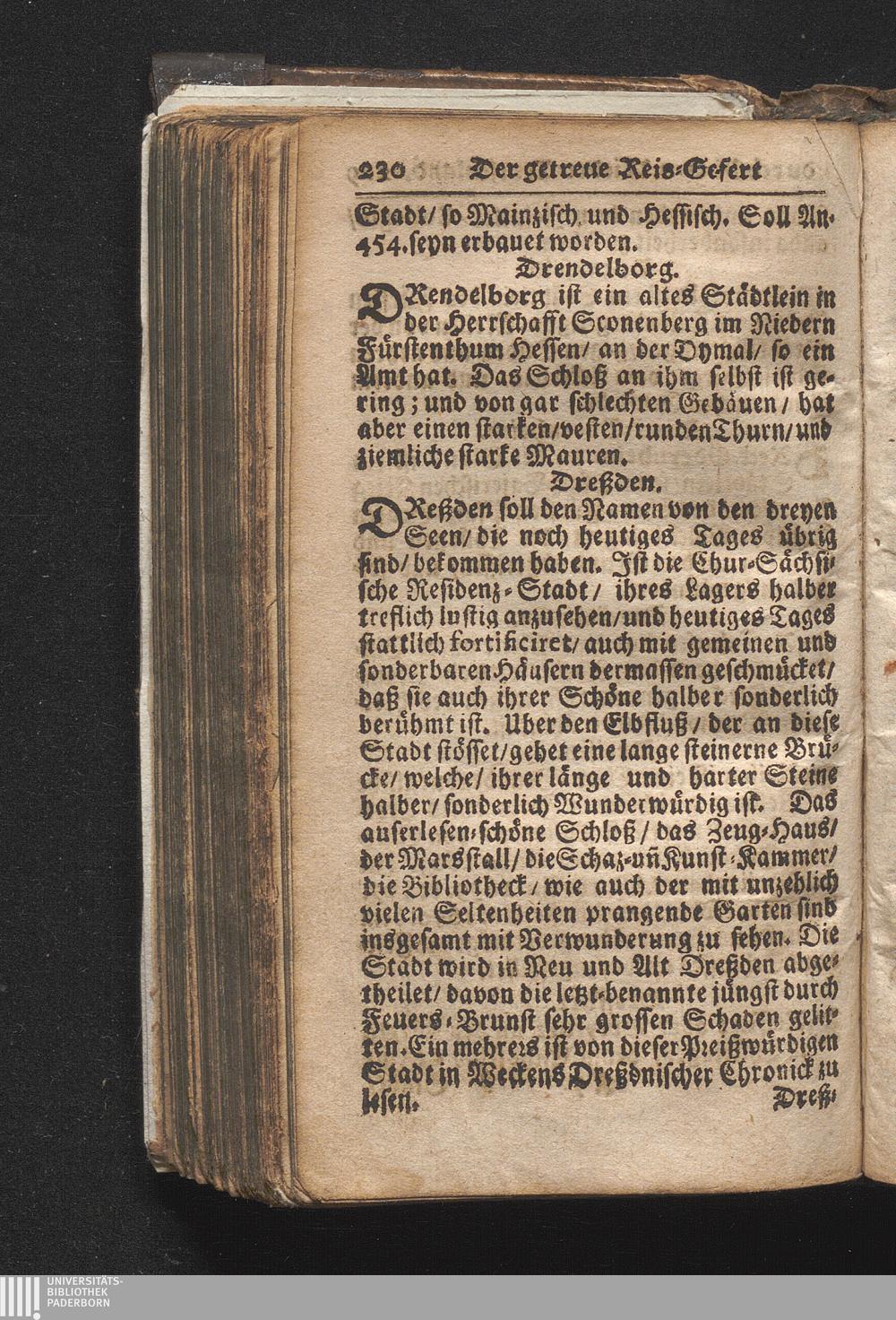 Der getreue Reiß-Gefert durch Ober- und Nieder-Teutschland : Das ist: Grundrichtige und ausführliche Abhandlung derer jenigen Residenzien/ Städte/ Schlösser/ Vestungen/ Städtlein und nahmhafften Markflecken/ welche so wol in Ober- als Nieder-Teutschland/ einem Reisenden sich hin und wieder vorstellig machen und zwar solcher Gestalt/ daß darinn derer Ursprung/ Aufnahm/ Fortification/ Raritäten/ herrliche Gebäue/ und Glück- und Unglücks-Fälle bis auf gegenwärtige Zeit fortgesetzt enthalten. Dabey auch noch über das ein absonderlicher kurz-gefasster Weegweiser angehänget zu finden/ worinnen klärlich zu sehen, wie viel Meilen ein Ort von dem andern entlegen. Alles aus denen bewährtesten Scribenten hervorgesuchet/ zum Nutz-Ergötzen mitgetheilet ...