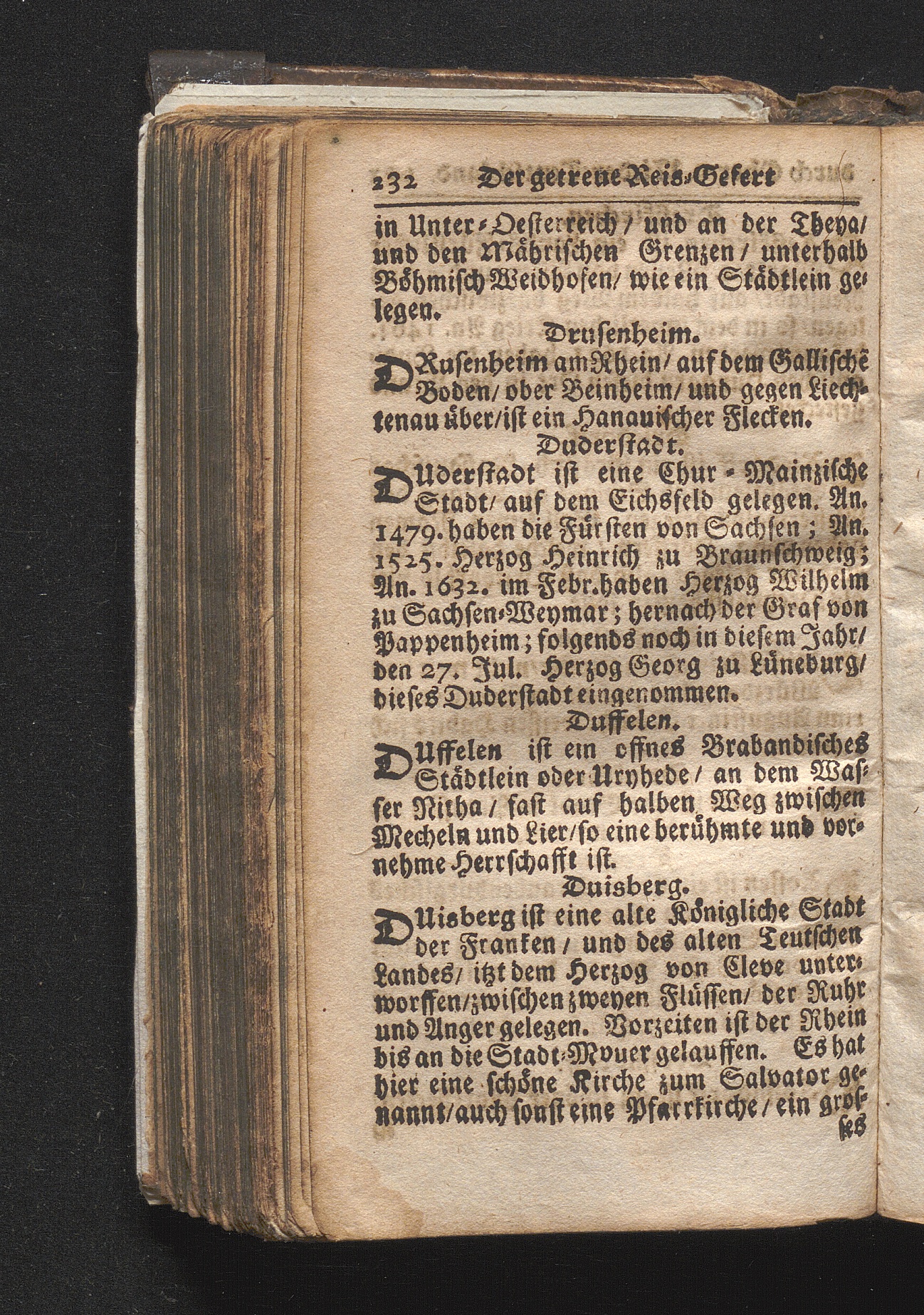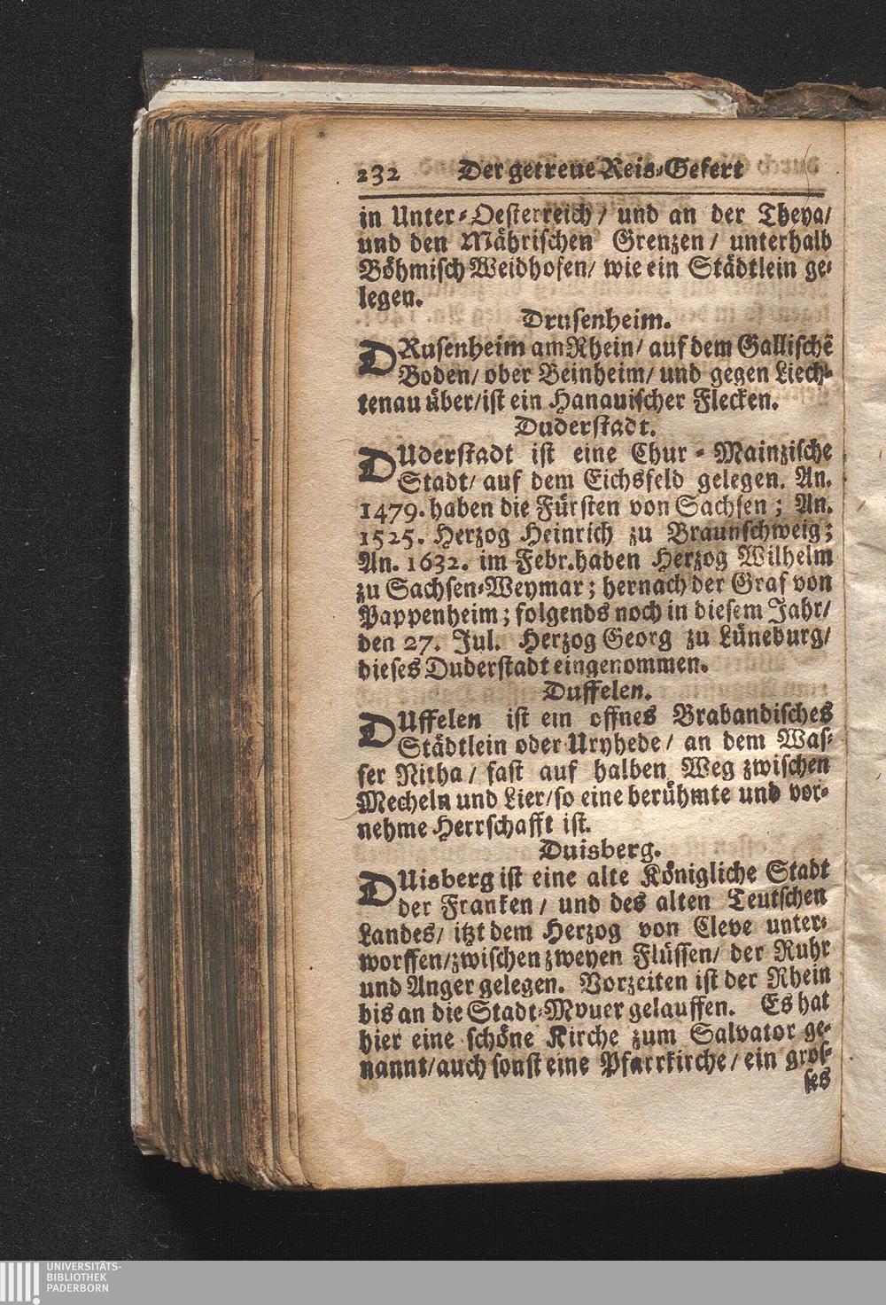Der getreue Reiß-Gefert durch Ober- und Nieder-Teutschland : Das ist: Grundrichtige und ausführliche Abhandlung derer jenigen Residenzien/ Städte/ Schlösser/ Vestungen/ Städtlein und nahmhafften Markflecken/ welche so wol in Ober- als Nieder-Teutschland/ einem Reisenden sich hin und wieder vorstellig machen und zwar solcher Gestalt/ daß darinn derer Ursprung/ Aufnahm/ Fortification/ Raritäten/ herrliche Gebäue/ und Glück- und Unglücks-Fälle bis auf gegenwärtige Zeit fortgesetzt enthalten. Dabey auch noch über das ein absonderlicher kurz-gefasster Weegweiser angehänget zu finden/ worinnen klärlich zu sehen, wie viel Meilen ein Ort von dem andern entlegen. Alles aus denen bewährtesten Scribenten hervorgesuchet/ zum Nutz-Ergötzen mitgetheilet ...