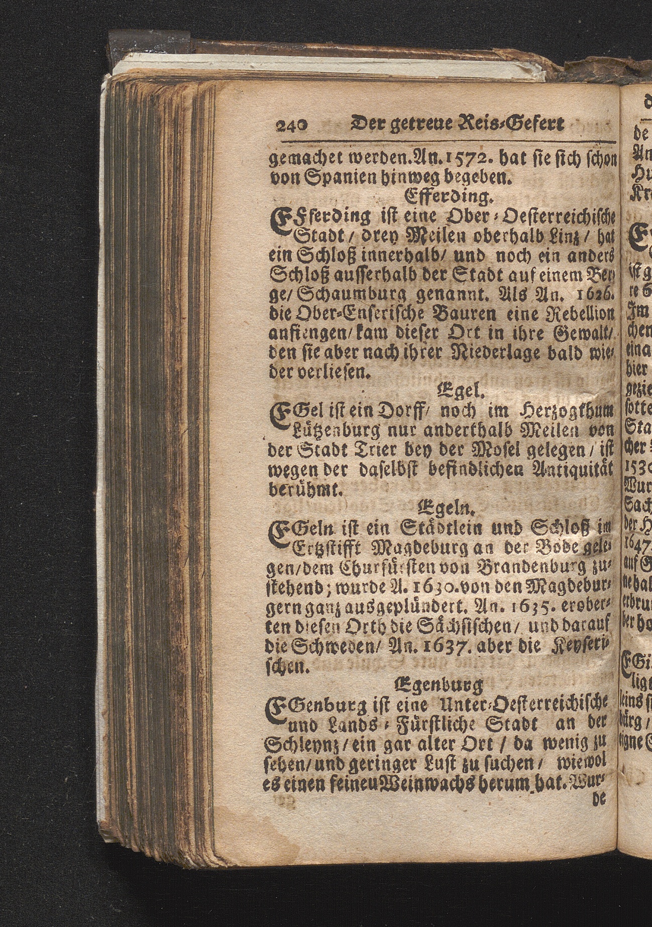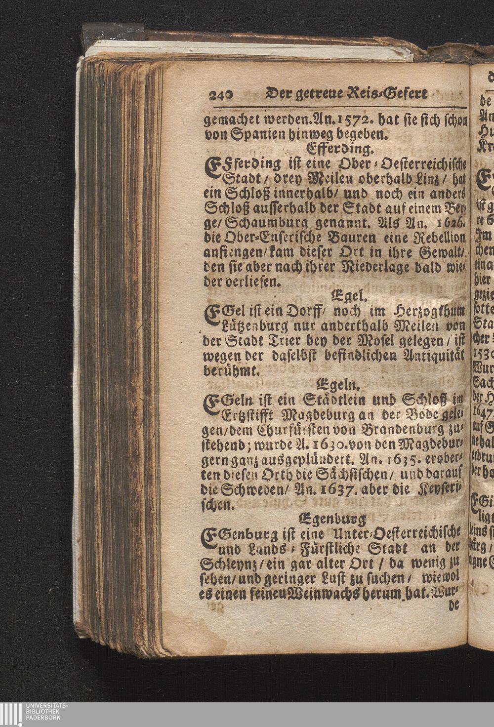 Der getreue Reiß-Gefert durch Ober- und Nieder-Teutschland : Das ist: Grundrichtige und ausführliche Abhandlung derer jenigen Residenzien/ Städte/ Schlösser/ Vestungen/ Städtlein und nahmhafften Markflecken/ welche so wol in Ober- als Nieder-Teutschland/ einem Reisenden sich hin und wieder vorstellig machen und zwar solcher Gestalt/ daß darinn derer Ursprung/ Aufnahm/ Fortification/ Raritäten/ herrliche Gebäue/ und Glück- und Unglücks-Fälle bis auf gegenwärtige Zeit fortgesetzt enthalten. Dabey auch noch über das ein absonderlicher kurz-gefasster Weegweiser angehänget zu finden/ worinnen klärlich zu sehen, wie viel Meilen ein Ort von dem andern entlegen. Alles aus denen bewährtesten Scribenten hervorgesuchet/ zum Nutz-Ergötzen mitgetheilet ...