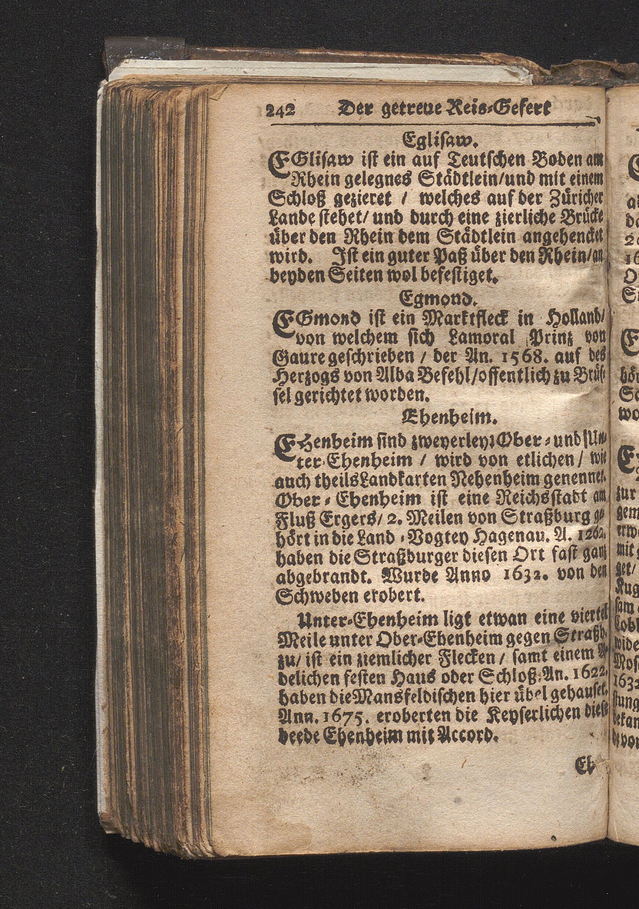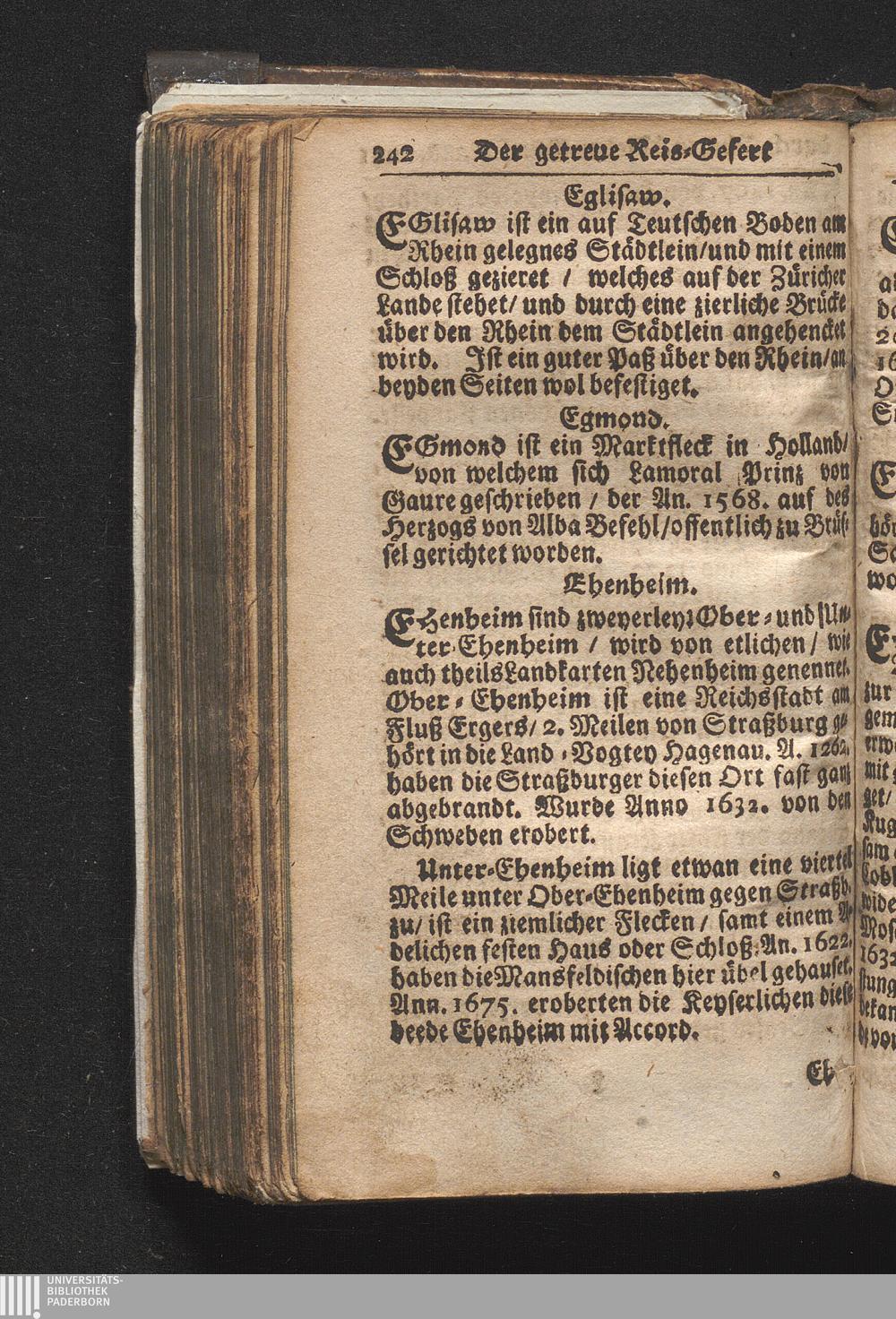 Der getreue Reiß-Gefert durch Ober- und Nieder-Teutschland : Das ist: Grundrichtige und ausführliche Abhandlung derer jenigen Residenzien/ Städte/ Schlösser/ Vestungen/ Städtlein und nahmhafften Markflecken/ welche so wol in Ober- als Nieder-Teutschland/ einem Reisenden sich hin und wieder vorstellig machen und zwar solcher Gestalt/ daß darinn derer Ursprung/ Aufnahm/ Fortification/ Raritäten/ herrliche Gebäue/ und Glück- und Unglücks-Fälle bis auf gegenwärtige Zeit fortgesetzt enthalten. Dabey auch noch über das ein absonderlicher kurz-gefasster Weegweiser angehänget zu finden/ worinnen klärlich zu sehen, wie viel Meilen ein Ort von dem andern entlegen. Alles aus denen bewährtesten Scribenten hervorgesuchet/ zum Nutz-Ergötzen mitgetheilet ...