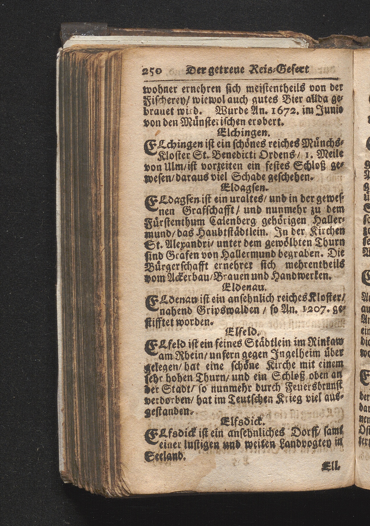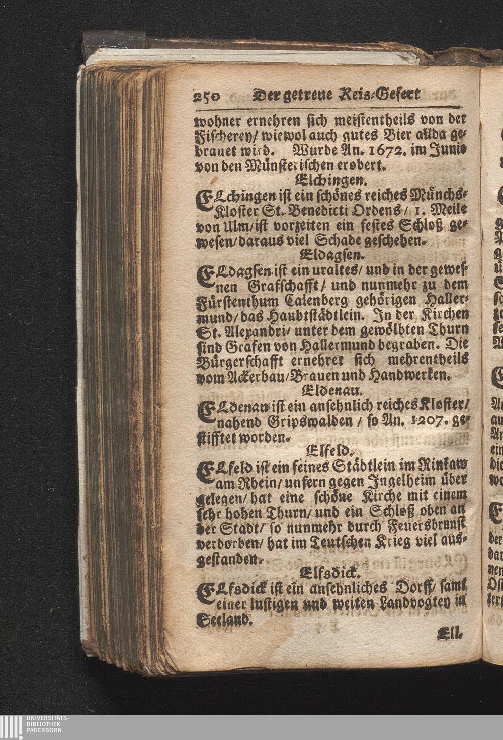 Der getreue Reiß-Gefert durch Ober- und Nieder-Teutschland : Das ist: Grundrichtige und ausführliche Abhandlung derer jenigen Residenzien/ Städte/ Schlösser/ Vestungen/ Städtlein und nahmhafften Markflecken/ welche so wol in Ober- als Nieder-Teutschland/ einem Reisenden sich hin und wieder vorstellig machen und zwar solcher Gestalt/ daß darinn derer Ursprung/ Aufnahm/ Fortification/ Raritäten/ herrliche Gebäue/ und Glück- und Unglücks-Fälle bis auf gegenwärtige Zeit fortgesetzt enthalten. Dabey auch noch über das ein absonderlicher kurz-gefasster Weegweiser angehänget zu finden/ worinnen klärlich zu sehen, wie viel Meilen ein Ort von dem andern entlegen. Alles aus denen bewährtesten Scribenten hervorgesuchet/ zum Nutz-Ergötzen mitgetheilet ...