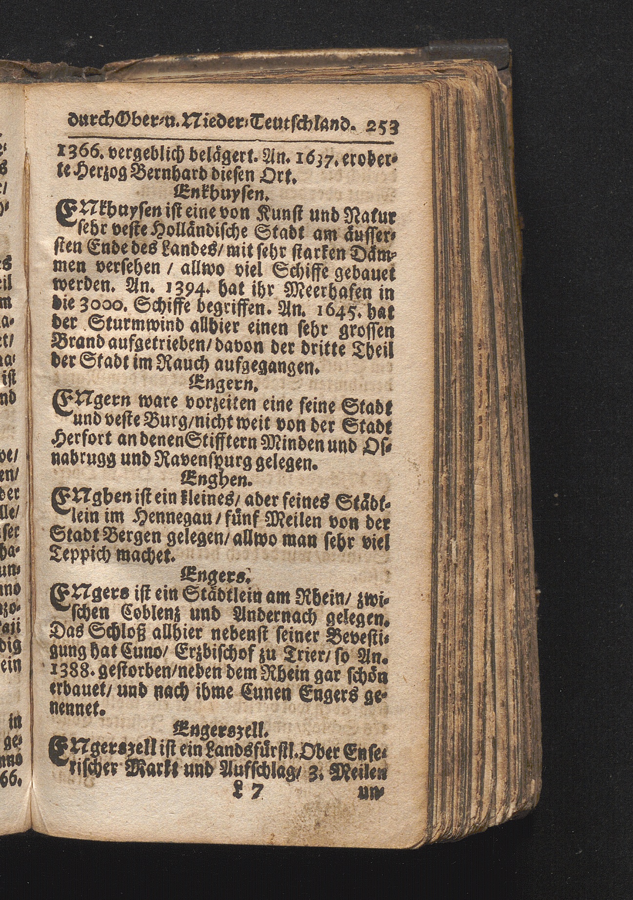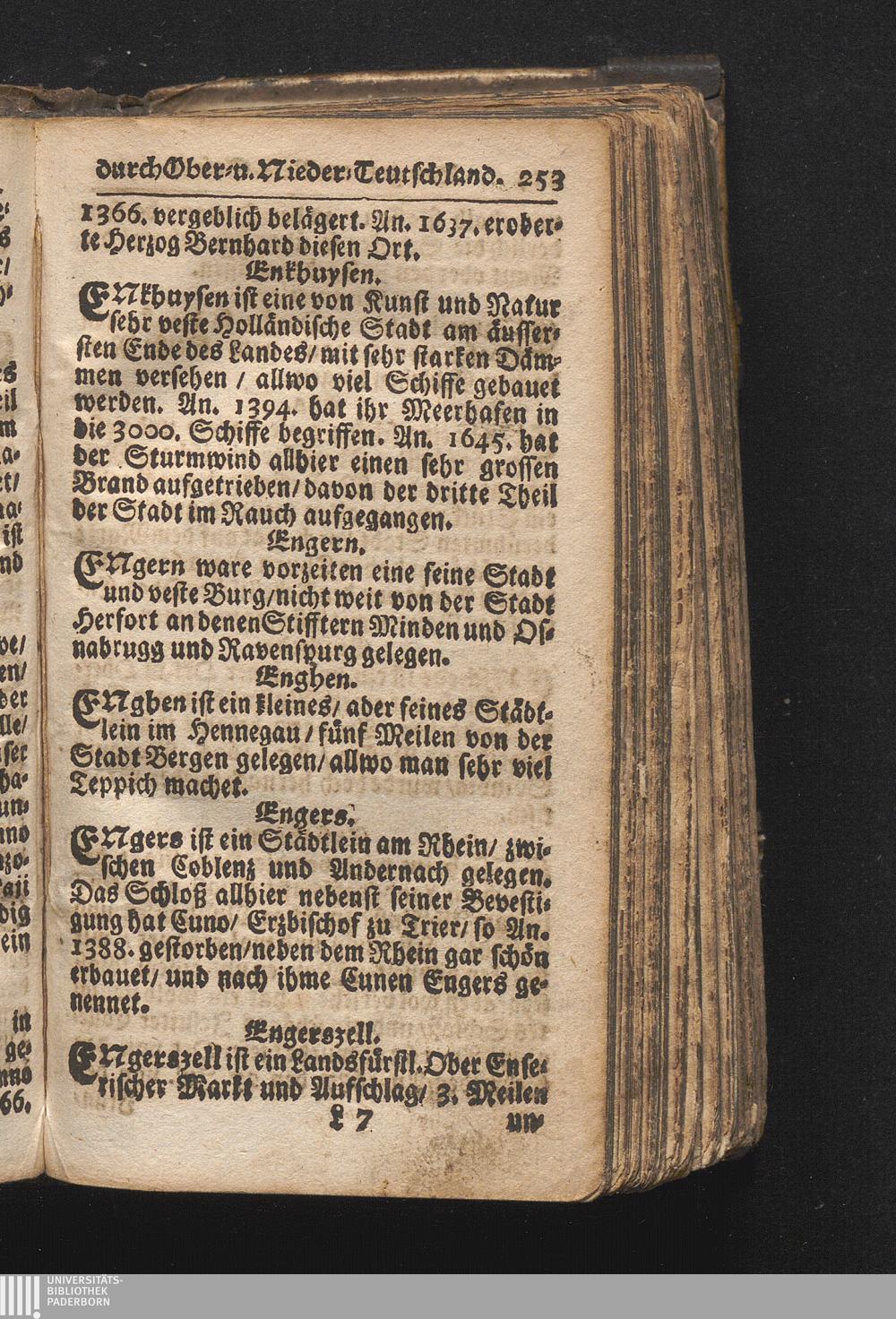Der getreue Reiß-Gefert durch Ober- und Nieder-Teutschland : Das ist: Grundrichtige und ausführliche Abhandlung derer jenigen Residenzien/ Städte/ Schlösser/ Vestungen/ Städtlein und nahmhafften Markflecken/ welche so wol in Ober- als Nieder-Teutschland/ einem Reisenden sich hin und wieder vorstellig machen und zwar solcher Gestalt/ daß darinn derer Ursprung/ Aufnahm/ Fortification/ Raritäten/ herrliche Gebäue/ und Glück- und Unglücks-Fälle bis auf gegenwärtige Zeit fortgesetzt enthalten. Dabey auch noch über das ein absonderlicher kurz-gefasster Weegweiser angehänget zu finden/ worinnen klärlich zu sehen, wie viel Meilen ein Ort von dem andern entlegen. Alles aus denen bewährtesten Scribenten hervorgesuchet/ zum Nutz-Ergötzen mitgetheilet ...