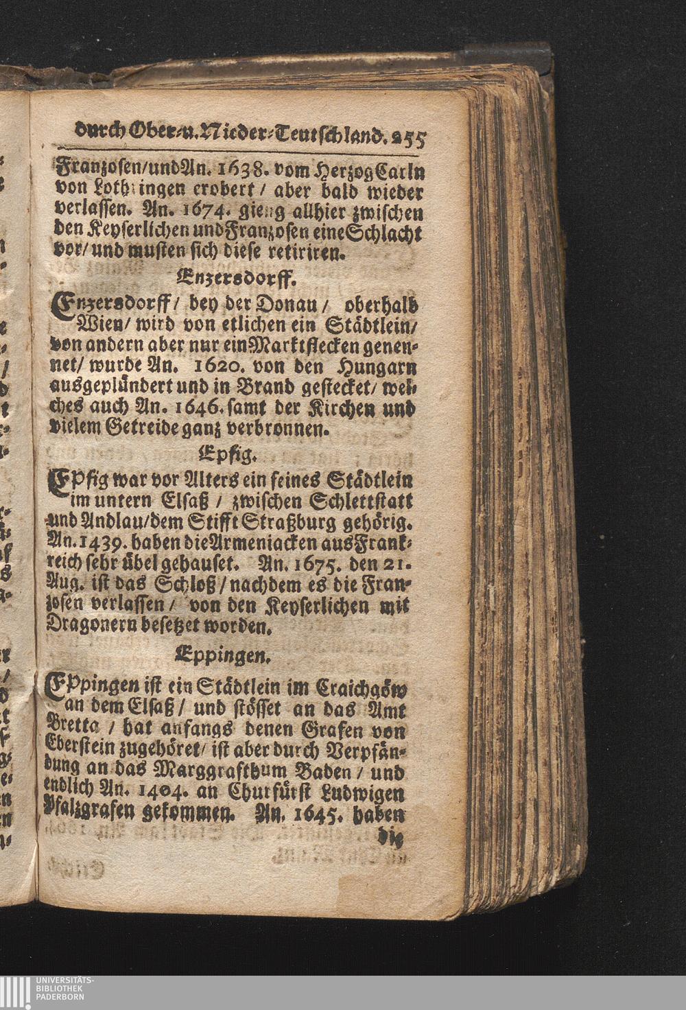 Der getreue Reiß-Gefert durch Ober- und Nieder-Teutschland : Das ist: Grundrichtige und ausführliche Abhandlung derer jenigen Residenzien/ Städte/ Schlösser/ Vestungen/ Städtlein und nahmhafften Markflecken/ welche so wol in Ober- als Nieder-Teutschland/ einem Reisenden sich hin und wieder vorstellig machen und zwar solcher Gestalt/ daß darinn derer Ursprung/ Aufnahm/ Fortification/ Raritäten/ herrliche Gebäue/ und Glück- und Unglücks-Fälle bis auf gegenwärtige Zeit fortgesetzt enthalten. Dabey auch noch über das ein absonderlicher kurz-gefasster Weegweiser angehänget zu finden/ worinnen klärlich zu sehen, wie viel Meilen ein Ort von dem andern entlegen. Alles aus denen bewährtesten Scribenten hervorgesuchet/ zum Nutz-Ergötzen mitgetheilet ...