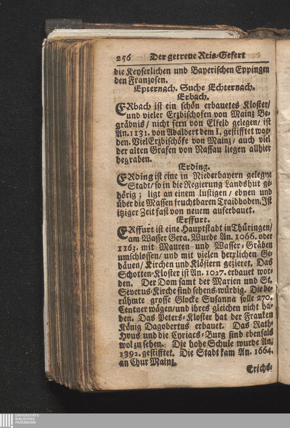 Der getreue Reiß-Gefert durch Ober- und Nieder-Teutschland : Das ist: Grundrichtige und ausführliche Abhandlung derer jenigen Residenzien/ Städte/ Schlösser/ Vestungen/ Städtlein und nahmhafften Markflecken/ welche so wol in Ober- als Nieder-Teutschland/ einem Reisenden sich hin und wieder vorstellig machen und zwar solcher Gestalt/ daß darinn derer Ursprung/ Aufnahm/ Fortification/ Raritäten/ herrliche Gebäue/ und Glück- und Unglücks-Fälle bis auf gegenwärtige Zeit fortgesetzt enthalten. Dabey auch noch über das ein absonderlicher kurz-gefasster Weegweiser angehänget zu finden/ worinnen klärlich zu sehen, wie viel Meilen ein Ort von dem andern entlegen. Alles aus denen bewährtesten Scribenten hervorgesuchet/ zum Nutz-Ergötzen mitgetheilet ...