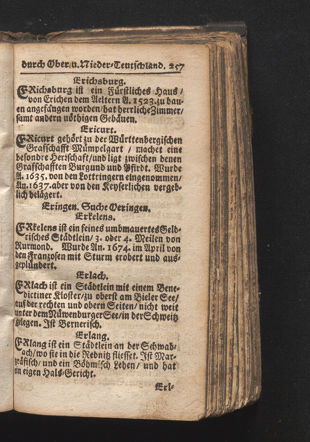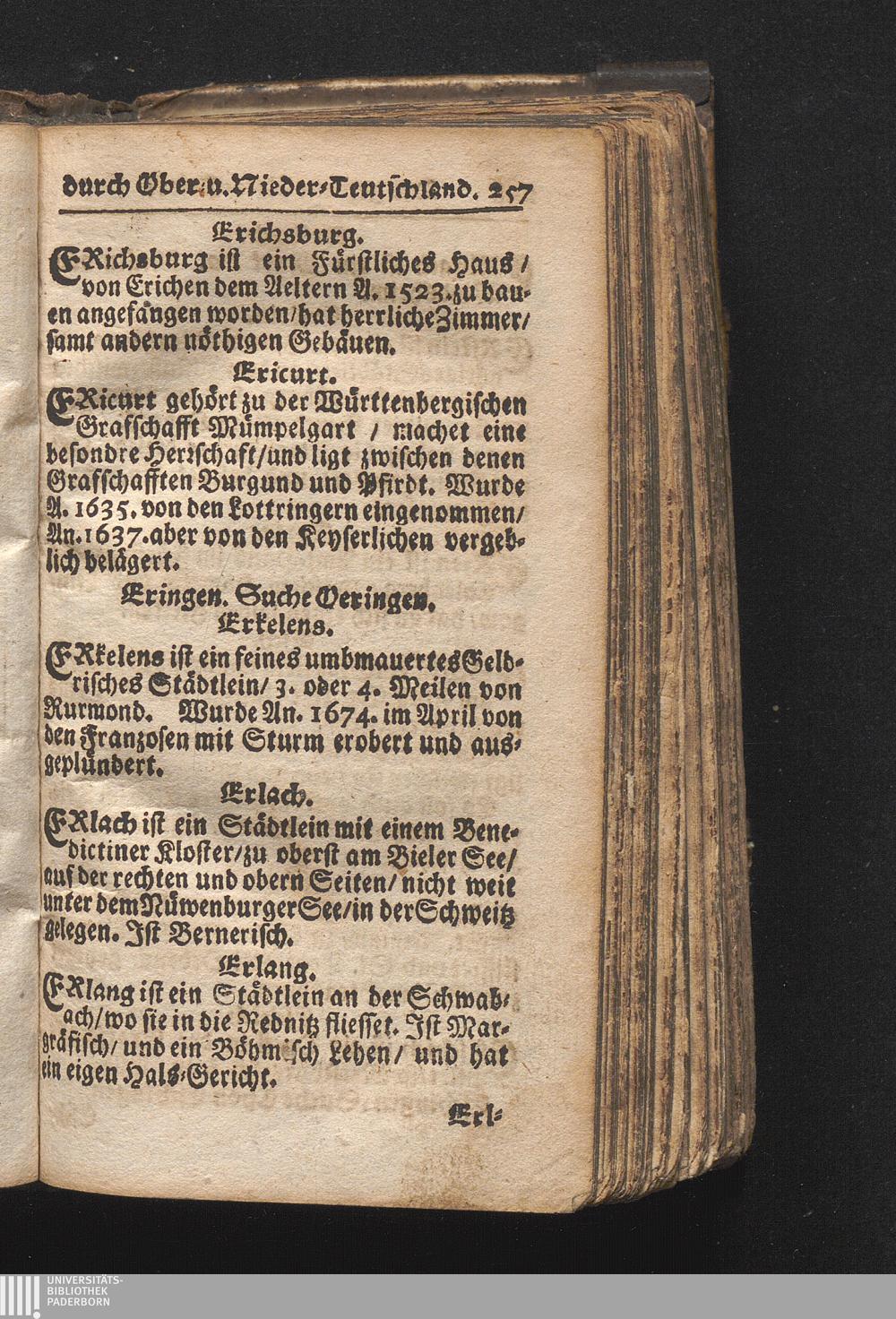 Der getreue Reiß-Gefert durch Ober- und Nieder-Teutschland : Das ist: Grundrichtige und ausführliche Abhandlung derer jenigen Residenzien/ Städte/ Schlösser/ Vestungen/ Städtlein und nahmhafften Markflecken/ welche so wol in Ober- als Nieder-Teutschland/ einem Reisenden sich hin und wieder vorstellig machen und zwar solcher Gestalt/ daß darinn derer Ursprung/ Aufnahm/ Fortification/ Raritäten/ herrliche Gebäue/ und Glück- und Unglücks-Fälle bis auf gegenwärtige Zeit fortgesetzt enthalten. Dabey auch noch über das ein absonderlicher kurz-gefasster Weegweiser angehänget zu finden/ worinnen klärlich zu sehen, wie viel Meilen ein Ort von dem andern entlegen. Alles aus denen bewährtesten Scribenten hervorgesuchet/ zum Nutz-Ergötzen mitgetheilet ...