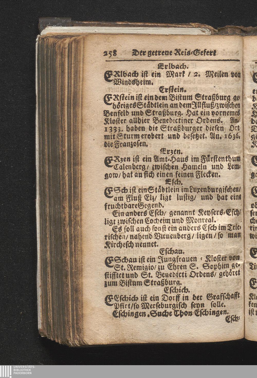 Der getreue Reiß-Gefert durch Ober- und Nieder-Teutschland : Das ist: Grundrichtige und ausführliche Abhandlung derer jenigen Residenzien/ Städte/ Schlösser/ Vestungen/ Städtlein und nahmhafften Markflecken/ welche so wol in Ober- als Nieder-Teutschland/ einem Reisenden sich hin und wieder vorstellig machen und zwar solcher Gestalt/ daß darinn derer Ursprung/ Aufnahm/ Fortification/ Raritäten/ herrliche Gebäue/ und Glück- und Unglücks-Fälle bis auf gegenwärtige Zeit fortgesetzt enthalten. Dabey auch noch über das ein absonderlicher kurz-gefasster Weegweiser angehänget zu finden/ worinnen klärlich zu sehen, wie viel Meilen ein Ort von dem andern entlegen. Alles aus denen bewährtesten Scribenten hervorgesuchet/ zum Nutz-Ergötzen mitgetheilet ...