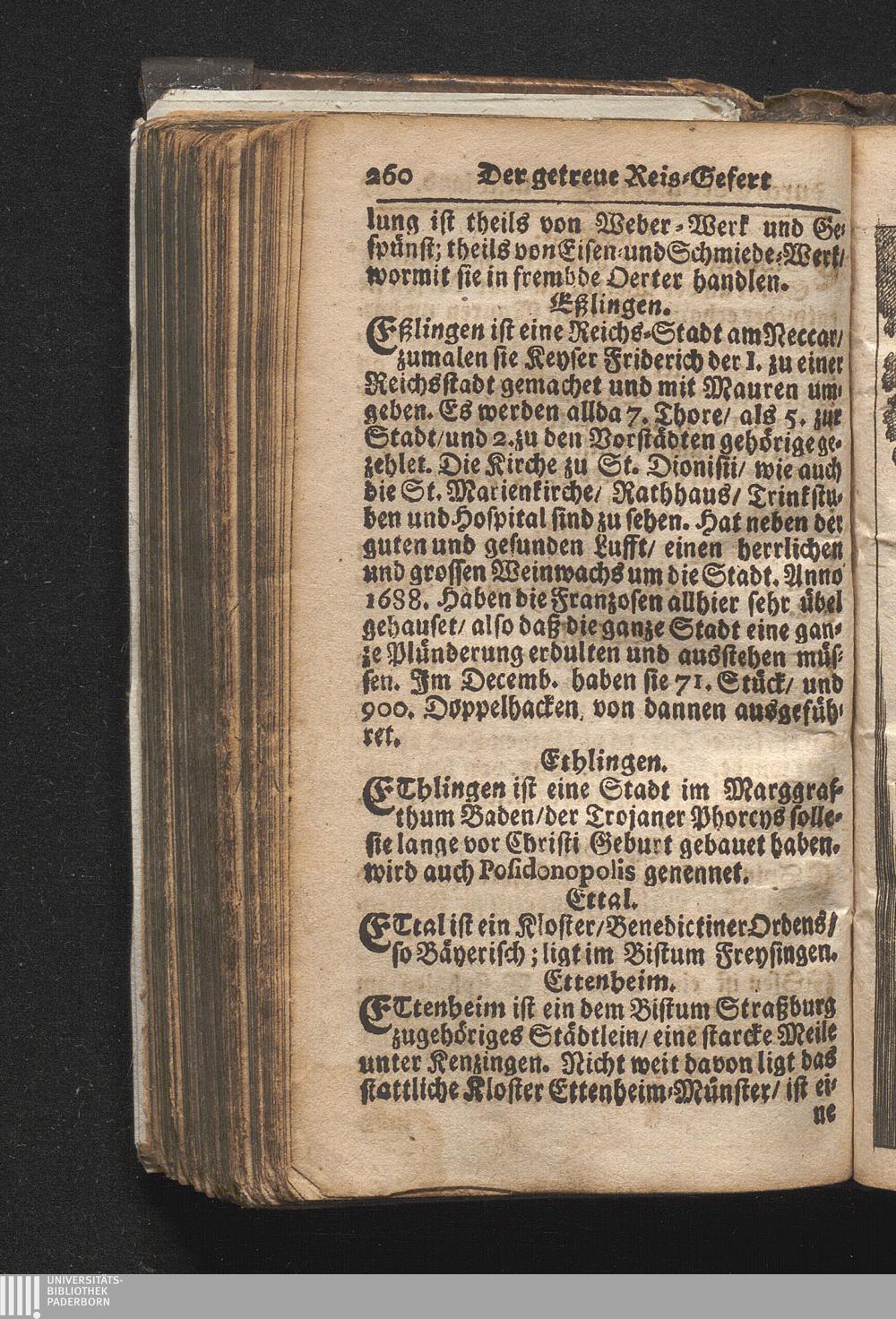 Der getreue Reiß-Gefert durch Ober- und Nieder-Teutschland : Das ist: Grundrichtige und ausführliche Abhandlung derer jenigen Residenzien/ Städte/ Schlösser/ Vestungen/ Städtlein und nahmhafften Markflecken/ welche so wol in Ober- als Nieder-Teutschland/ einem Reisenden sich hin und wieder vorstellig machen und zwar solcher Gestalt/ daß darinn derer Ursprung/ Aufnahm/ Fortification/ Raritäten/ herrliche Gebäue/ und Glück- und Unglücks-Fälle bis auf gegenwärtige Zeit fortgesetzt enthalten. Dabey auch noch über das ein absonderlicher kurz-gefasster Weegweiser angehänget zu finden/ worinnen klärlich zu sehen, wie viel Meilen ein Ort von dem andern entlegen. Alles aus denen bewährtesten Scribenten hervorgesuchet/ zum Nutz-Ergötzen mitgetheilet ...