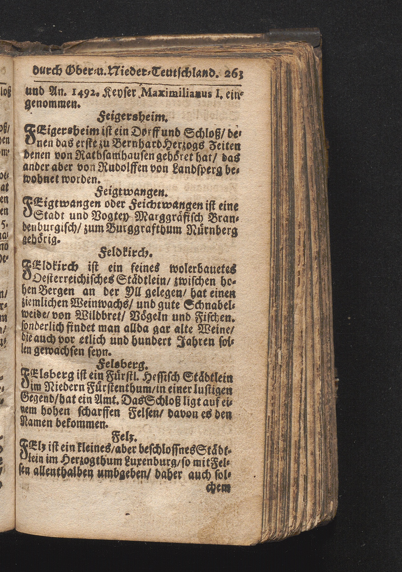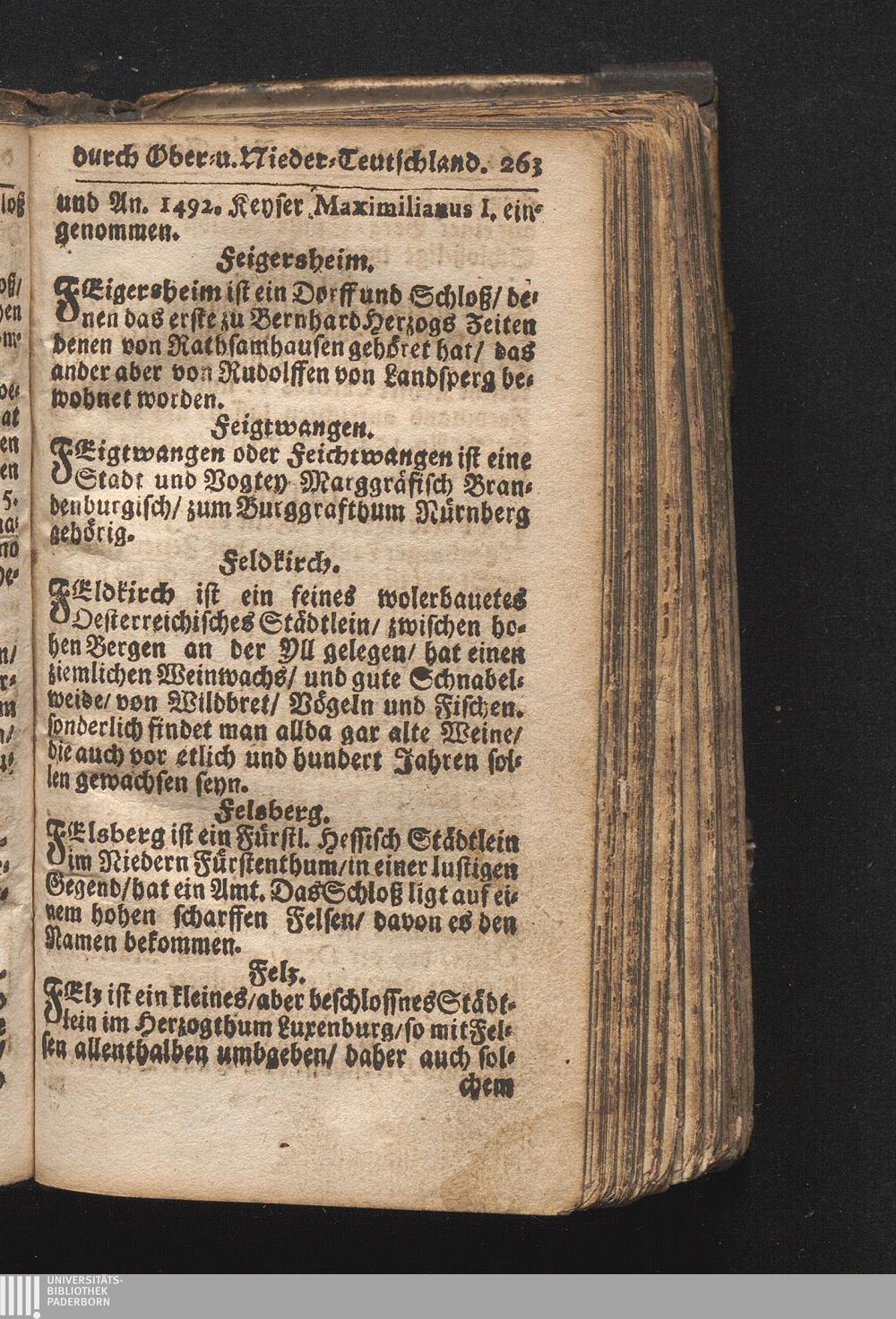 Der getreue Reiß-Gefert durch Ober- und Nieder-Teutschland : Das ist: Grundrichtige und ausführliche Abhandlung derer jenigen Residenzien/ Städte/ Schlösser/ Vestungen/ Städtlein und nahmhafften Markflecken/ welche so wol in Ober- als Nieder-Teutschland/ einem Reisenden sich hin und wieder vorstellig machen und zwar solcher Gestalt/ daß darinn derer Ursprung/ Aufnahm/ Fortification/ Raritäten/ herrliche Gebäue/ und Glück- und Unglücks-Fälle bis auf gegenwärtige Zeit fortgesetzt enthalten. Dabey auch noch über das ein absonderlicher kurz-gefasster Weegweiser angehänget zu finden/ worinnen klärlich zu sehen, wie viel Meilen ein Ort von dem andern entlegen. Alles aus denen bewährtesten Scribenten hervorgesuchet/ zum Nutz-Ergötzen mitgetheilet ...