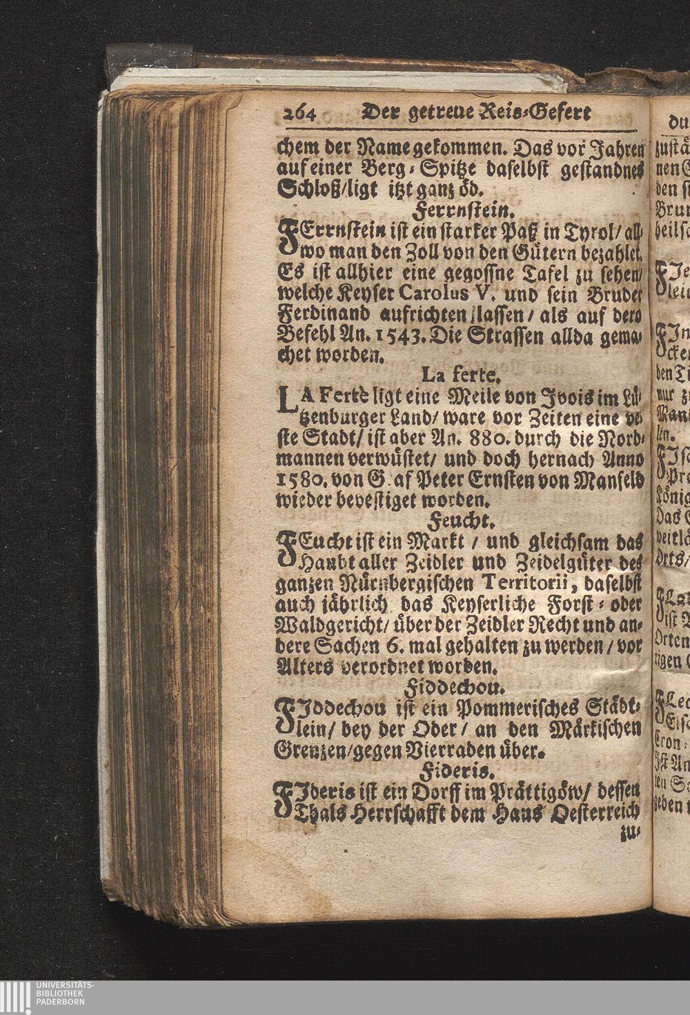 Der getreue Reiß-Gefert durch Ober- und Nieder-Teutschland : Das ist: Grundrichtige und ausführliche Abhandlung derer jenigen Residenzien/ Städte/ Schlösser/ Vestungen/ Städtlein und nahmhafften Markflecken/ welche so wol in Ober- als Nieder-Teutschland/ einem Reisenden sich hin und wieder vorstellig machen und zwar solcher Gestalt/ daß darinn derer Ursprung/ Aufnahm/ Fortification/ Raritäten/ herrliche Gebäue/ und Glück- und Unglücks-Fälle bis auf gegenwärtige Zeit fortgesetzt enthalten. Dabey auch noch über das ein absonderlicher kurz-gefasster Weegweiser angehänget zu finden/ worinnen klärlich zu sehen, wie viel Meilen ein Ort von dem andern entlegen. Alles aus denen bewährtesten Scribenten hervorgesuchet/ zum Nutz-Ergötzen mitgetheilet ...
