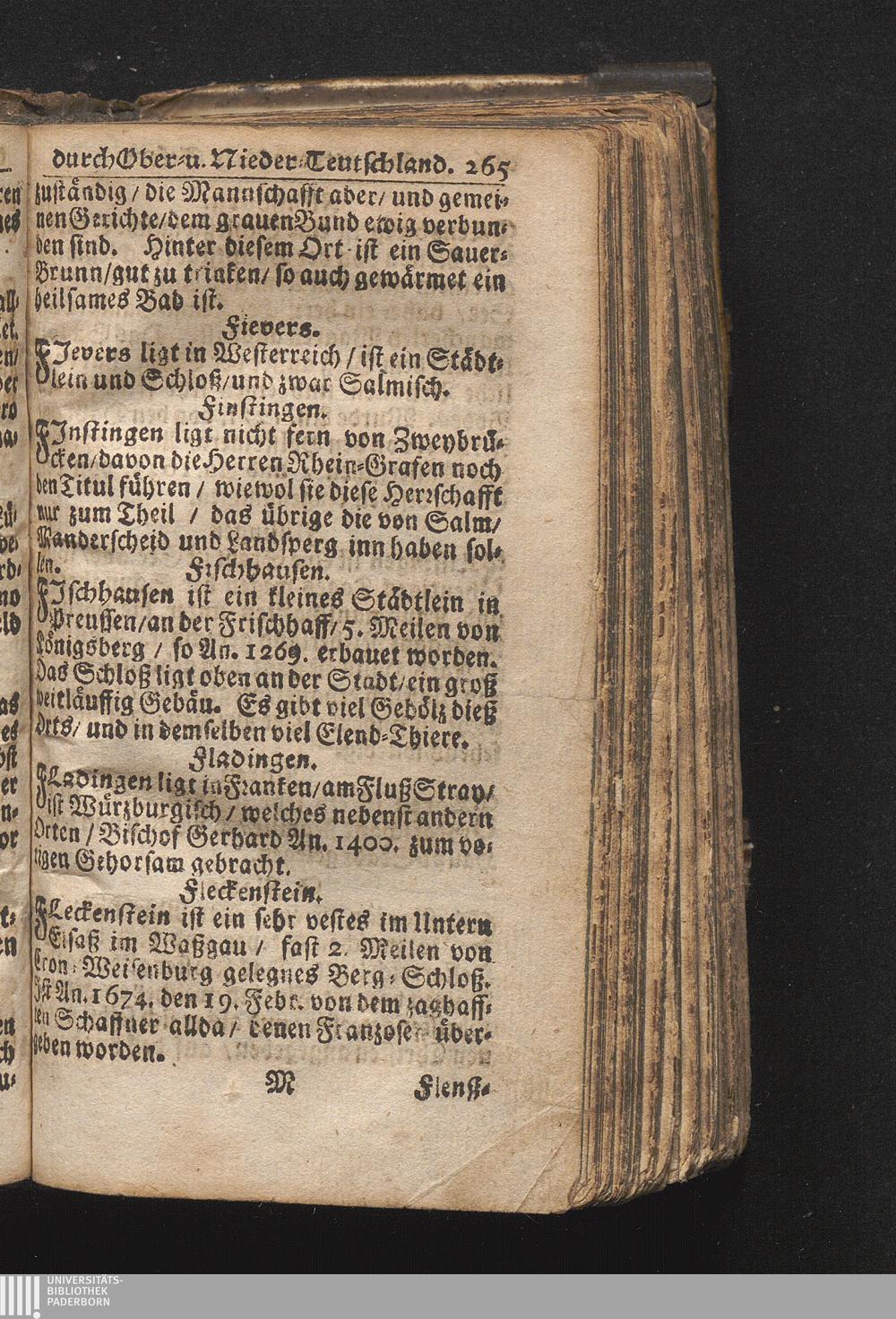 Der getreue Reiß-Gefert durch Ober- und Nieder-Teutschland : Das ist: Grundrichtige und ausführliche Abhandlung derer jenigen Residenzien/ Städte/ Schlösser/ Vestungen/ Städtlein und nahmhafften Markflecken/ welche so wol in Ober- als Nieder-Teutschland/ einem Reisenden sich hin und wieder vorstellig machen und zwar solcher Gestalt/ daß darinn derer Ursprung/ Aufnahm/ Fortification/ Raritäten/ herrliche Gebäue/ und Glück- und Unglücks-Fälle bis auf gegenwärtige Zeit fortgesetzt enthalten. Dabey auch noch über das ein absonderlicher kurz-gefasster Weegweiser angehänget zu finden/ worinnen klärlich zu sehen, wie viel Meilen ein Ort von dem andern entlegen. Alles aus denen bewährtesten Scribenten hervorgesuchet/ zum Nutz-Ergötzen mitgetheilet ...
