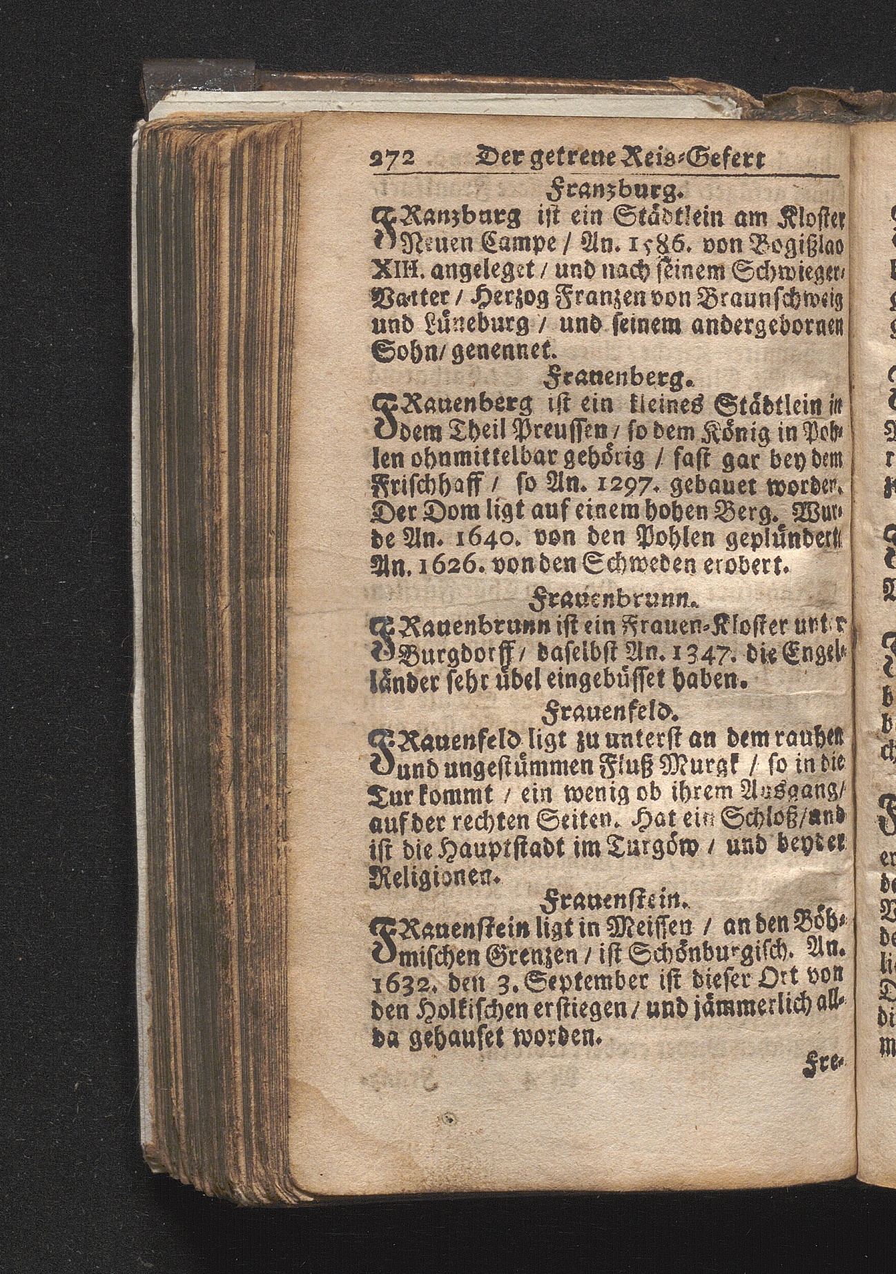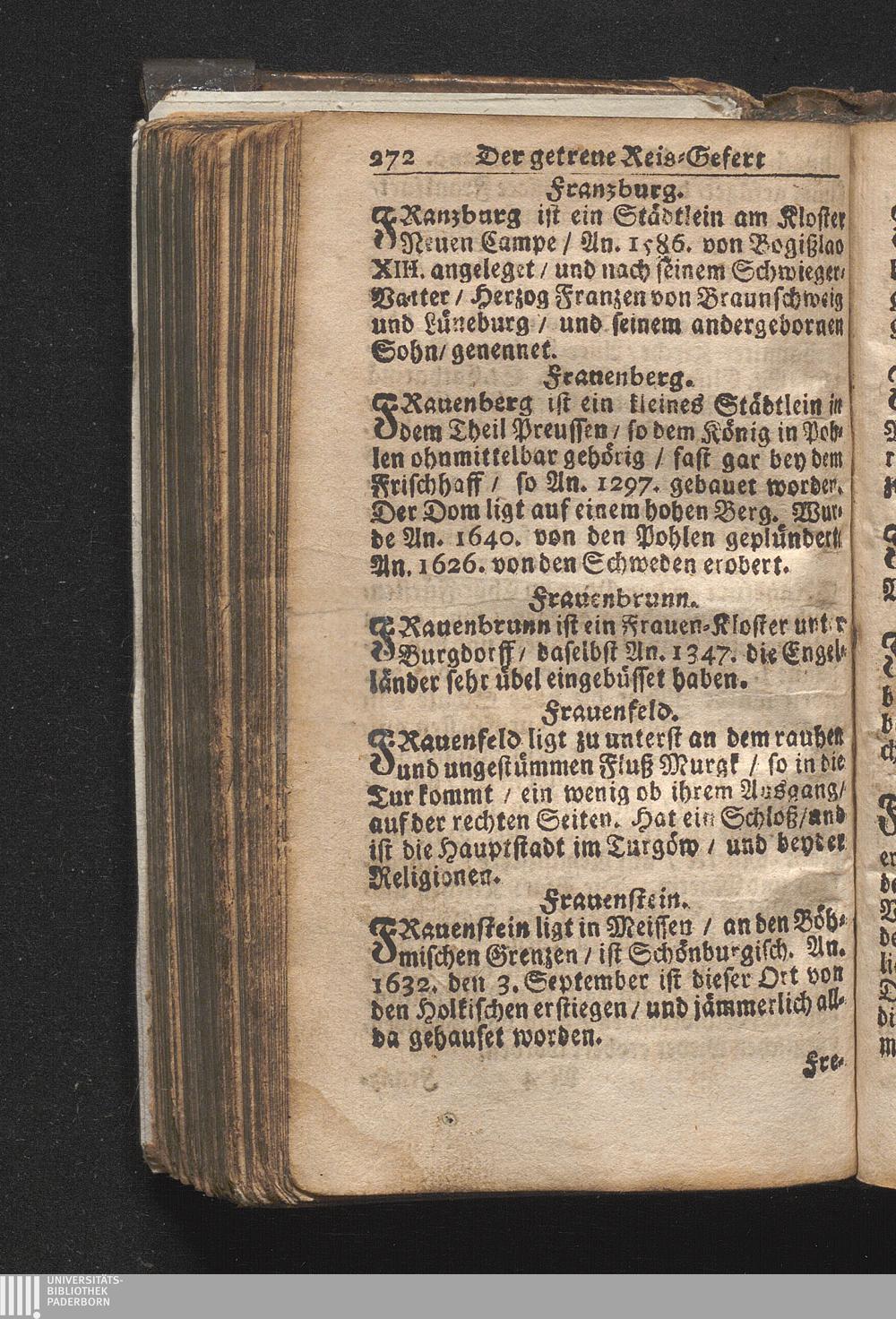 Der getreue Reiß-Gefert durch Ober- und Nieder-Teutschland : Das ist: Grundrichtige und ausführliche Abhandlung derer jenigen Residenzien/ Städte/ Schlösser/ Vestungen/ Städtlein und nahmhafften Markflecken/ welche so wol in Ober- als Nieder-Teutschland/ einem Reisenden sich hin und wieder vorstellig machen und zwar solcher Gestalt/ daß darinn derer Ursprung/ Aufnahm/ Fortification/ Raritäten/ herrliche Gebäue/ und Glück- und Unglücks-Fälle bis auf gegenwärtige Zeit fortgesetzt enthalten. Dabey auch noch über das ein absonderlicher kurz-gefasster Weegweiser angehänget zu finden/ worinnen klärlich zu sehen, wie viel Meilen ein Ort von dem andern entlegen. Alles aus denen bewährtesten Scribenten hervorgesuchet/ zum Nutz-Ergötzen mitgetheilet ...
