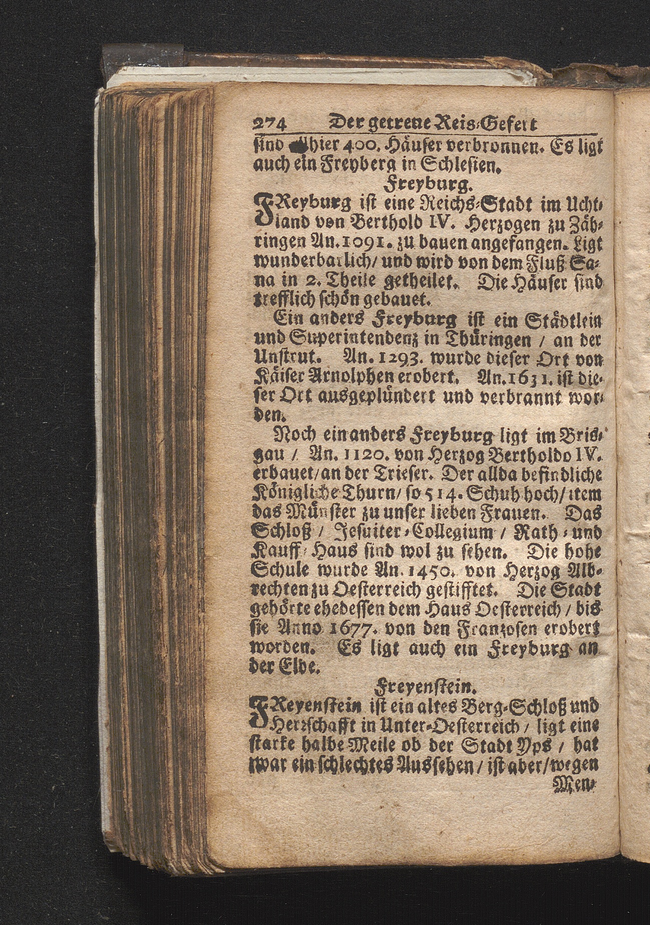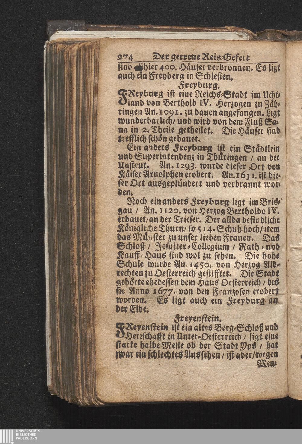 Der getreue Reiß-Gefert durch Ober- und Nieder-Teutschland : Das ist: Grundrichtige und ausführliche Abhandlung derer jenigen Residenzien/ Städte/ Schlösser/ Vestungen/ Städtlein und nahmhafften Markflecken/ welche so wol in Ober- als Nieder-Teutschland/ einem Reisenden sich hin und wieder vorstellig machen und zwar solcher Gestalt/ daß darinn derer Ursprung/ Aufnahm/ Fortification/ Raritäten/ herrliche Gebäue/ und Glück- und Unglücks-Fälle bis auf gegenwärtige Zeit fortgesetzt enthalten. Dabey auch noch über das ein absonderlicher kurz-gefasster Weegweiser angehänget zu finden/ worinnen klärlich zu sehen, wie viel Meilen ein Ort von dem andern entlegen. Alles aus denen bewährtesten Scribenten hervorgesuchet/ zum Nutz-Ergötzen mitgetheilet ...
