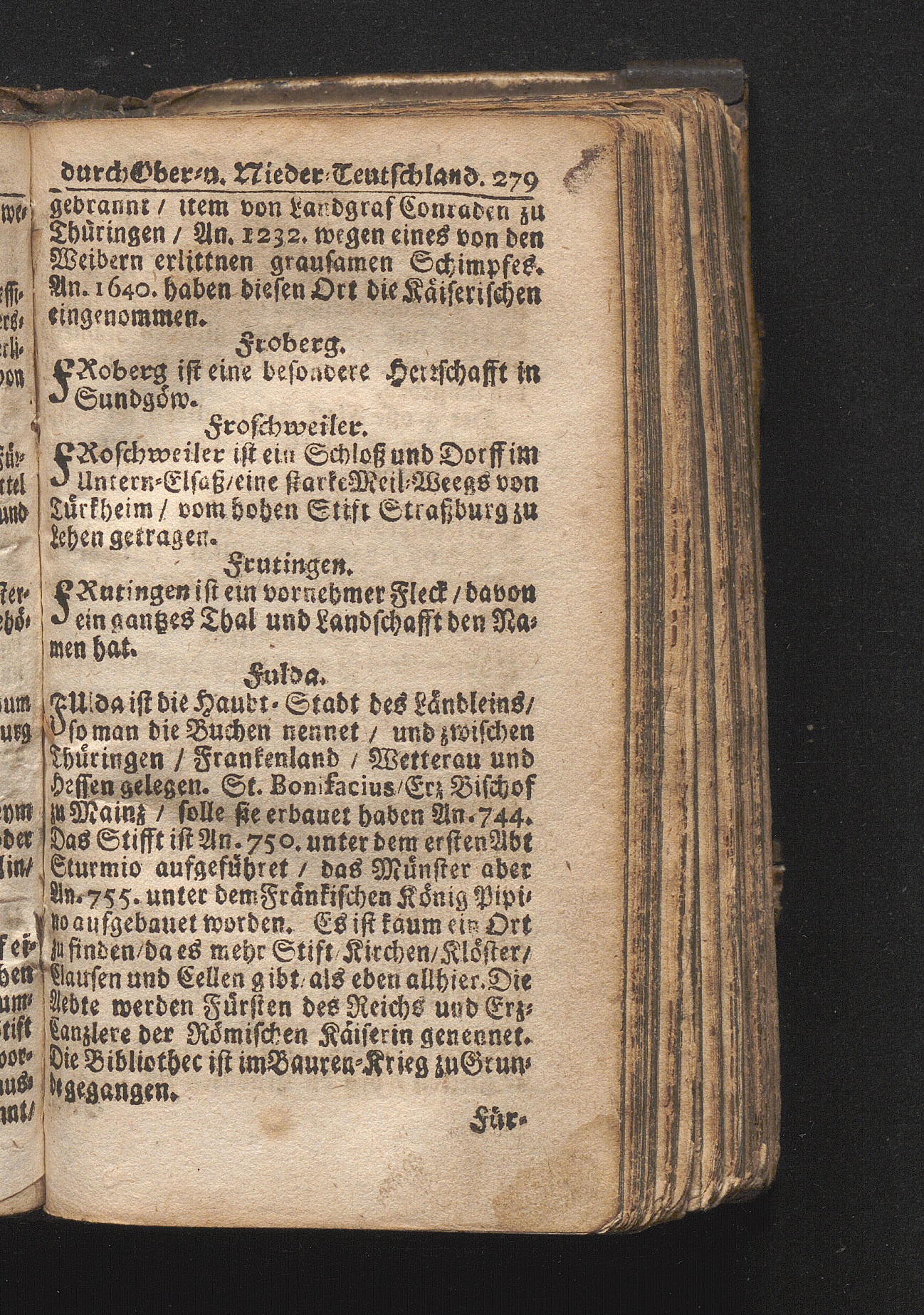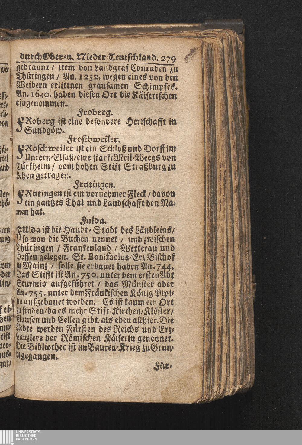 Der getreue Reiß-Gefert durch Ober- und Nieder-Teutschland : Das ist: Grundrichtige und ausführliche Abhandlung derer jenigen Residenzien/ Städte/ Schlösser/ Vestungen/ Städtlein und nahmhafften Markflecken/ welche so wol in Ober- als Nieder-Teutschland/ einem Reisenden sich hin und wieder vorstellig machen und zwar solcher Gestalt/ daß darinn derer Ursprung/ Aufnahm/ Fortification/ Raritäten/ herrliche Gebäue/ und Glück- und Unglücks-Fälle bis auf gegenwärtige Zeit fortgesetzt enthalten. Dabey auch noch über das ein absonderlicher kurz-gefasster Weegweiser angehänget zu finden/ worinnen klärlich zu sehen, wie viel Meilen ein Ort von dem andern entlegen. Alles aus denen bewährtesten Scribenten hervorgesuchet/ zum Nutz-Ergötzen mitgetheilet ...