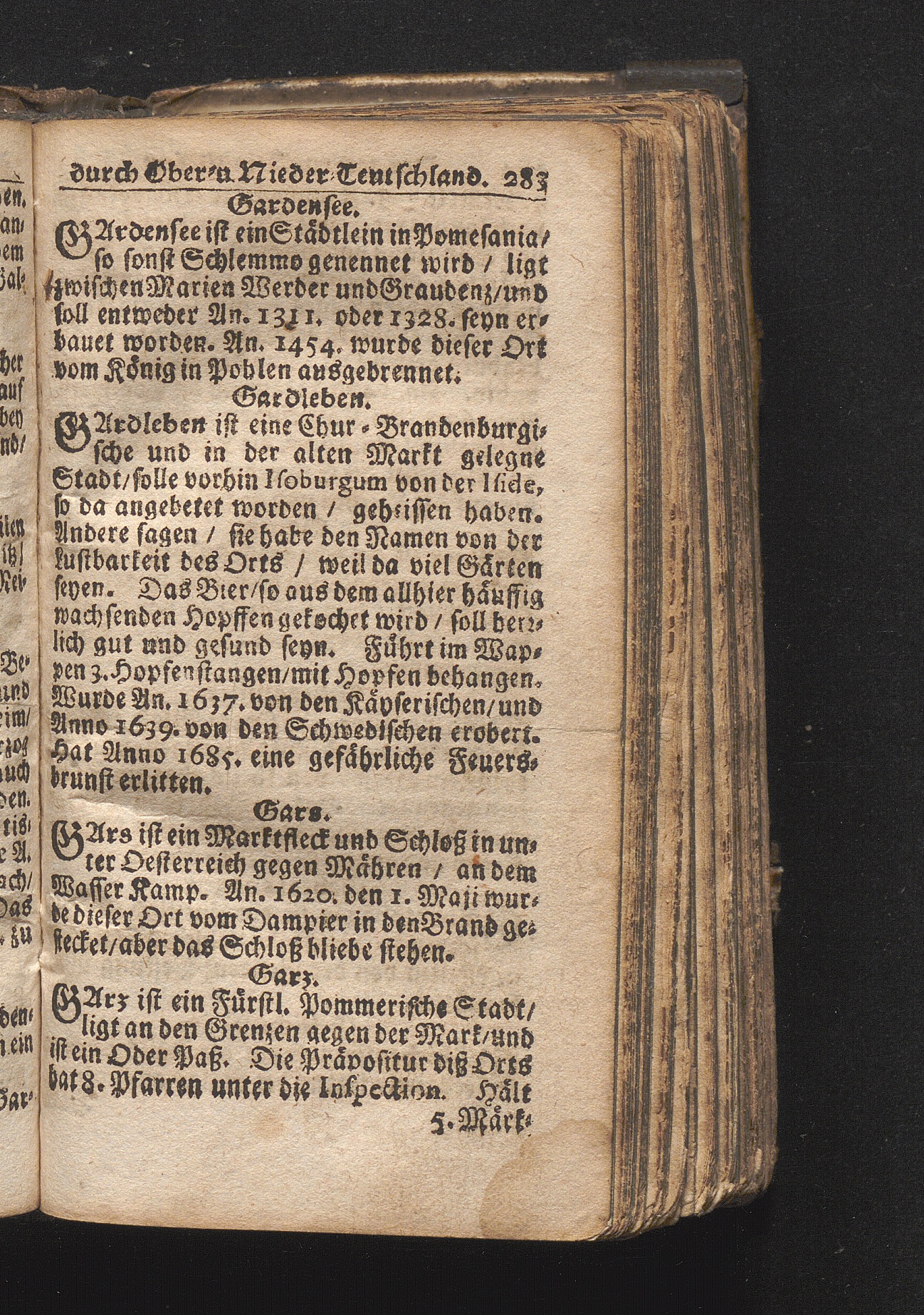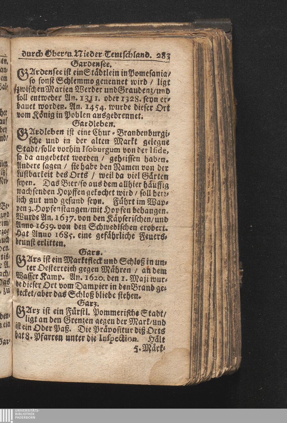 Der getreue Reiß-Gefert durch Ober- und Nieder-Teutschland : Das ist: Grundrichtige und ausführliche Abhandlung derer jenigen Residenzien/ Städte/ Schlösser/ Vestungen/ Städtlein und nahmhafften Markflecken/ welche so wol in Ober- als Nieder-Teutschland/ einem Reisenden sich hin und wieder vorstellig machen und zwar solcher Gestalt/ daß darinn derer Ursprung/ Aufnahm/ Fortification/ Raritäten/ herrliche Gebäue/ und Glück- und Unglücks-Fälle bis auf gegenwärtige Zeit fortgesetzt enthalten. Dabey auch noch über das ein absonderlicher kurz-gefasster Weegweiser angehänget zu finden/ worinnen klärlich zu sehen, wie viel Meilen ein Ort von dem andern entlegen. Alles aus denen bewährtesten Scribenten hervorgesuchet/ zum Nutz-Ergötzen mitgetheilet ...