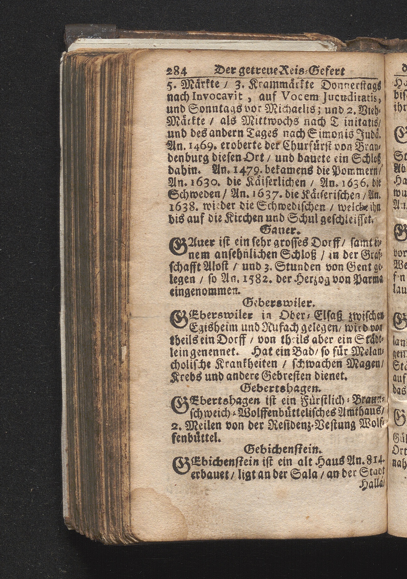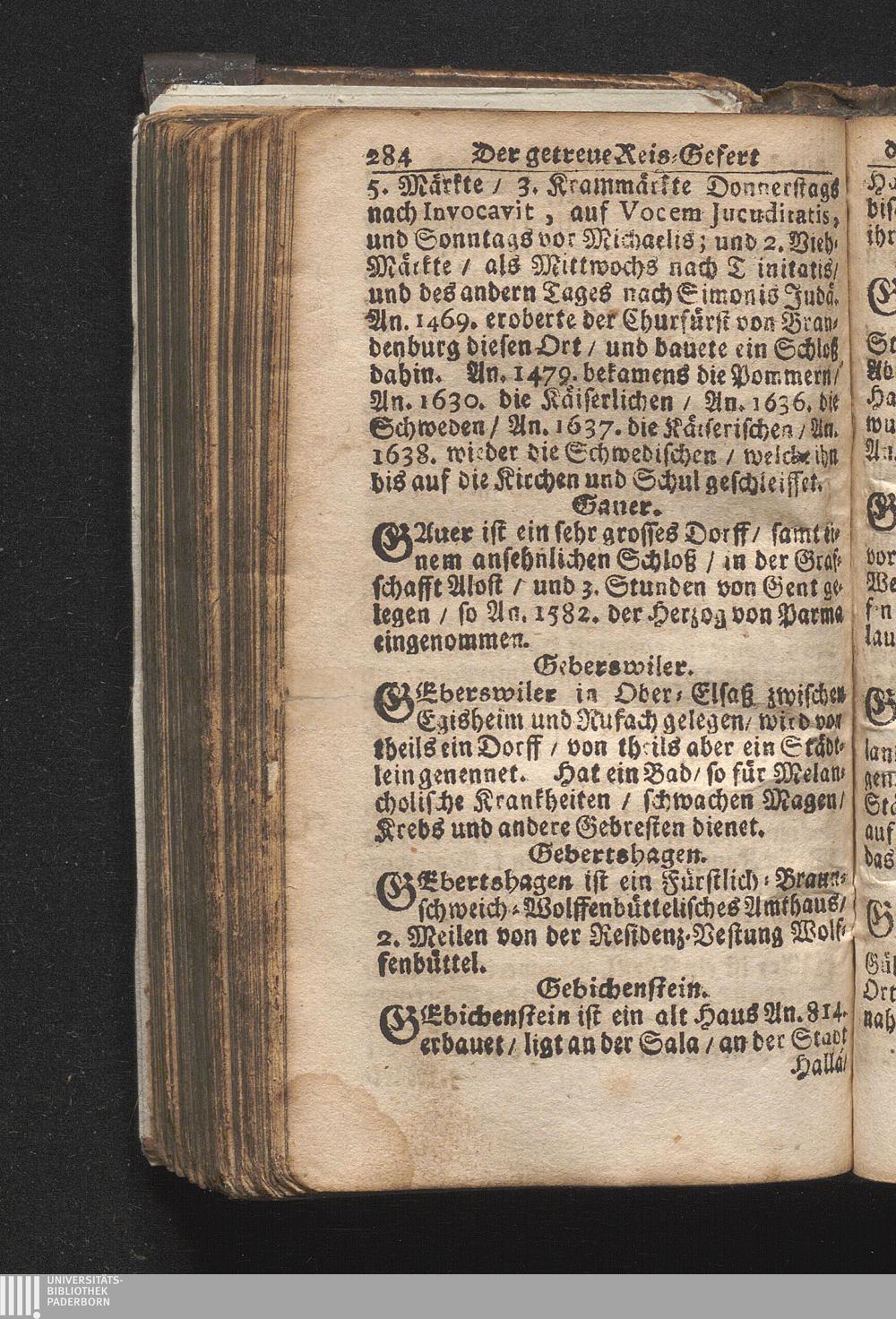 Der getreue Reiß-Gefert durch Ober- und Nieder-Teutschland : Das ist: Grundrichtige und ausführliche Abhandlung derer jenigen Residenzien/ Städte/ Schlösser/ Vestungen/ Städtlein und nahmhafften Markflecken/ welche so wol in Ober- als Nieder-Teutschland/ einem Reisenden sich hin und wieder vorstellig machen und zwar solcher Gestalt/ daß darinn derer Ursprung/ Aufnahm/ Fortification/ Raritäten/ herrliche Gebäue/ und Glück- und Unglücks-Fälle bis auf gegenwärtige Zeit fortgesetzt enthalten. Dabey auch noch über das ein absonderlicher kurz-gefasster Weegweiser angehänget zu finden/ worinnen klärlich zu sehen, wie viel Meilen ein Ort von dem andern entlegen. Alles aus denen bewährtesten Scribenten hervorgesuchet/ zum Nutz-Ergötzen mitgetheilet ...