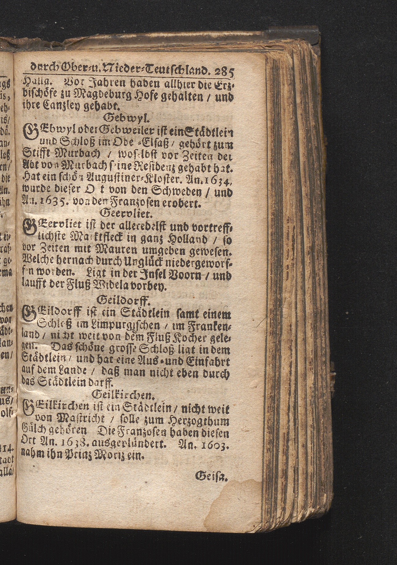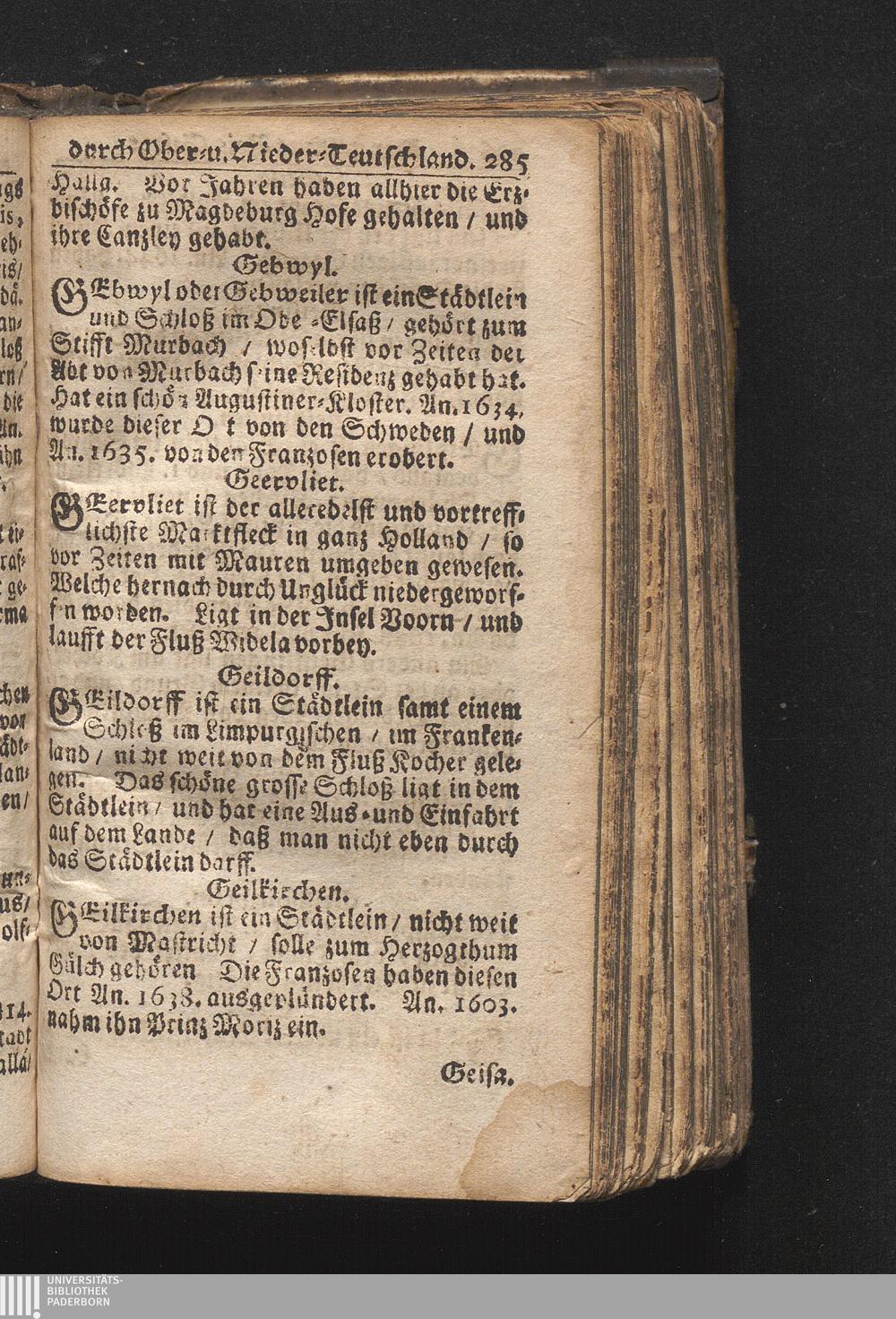 Der getreue Reiß-Gefert durch Ober- und Nieder-Teutschland : Das ist: Grundrichtige und ausführliche Abhandlung derer jenigen Residenzien/ Städte/ Schlösser/ Vestungen/ Städtlein und nahmhafften Markflecken/ welche so wol in Ober- als Nieder-Teutschland/ einem Reisenden sich hin und wieder vorstellig machen und zwar solcher Gestalt/ daß darinn derer Ursprung/ Aufnahm/ Fortification/ Raritäten/ herrliche Gebäue/ und Glück- und Unglücks-Fälle bis auf gegenwärtige Zeit fortgesetzt enthalten. Dabey auch noch über das ein absonderlicher kurz-gefasster Weegweiser angehänget zu finden/ worinnen klärlich zu sehen, wie viel Meilen ein Ort von dem andern entlegen. Alles aus denen bewährtesten Scribenten hervorgesuchet/ zum Nutz-Ergötzen mitgetheilet ...