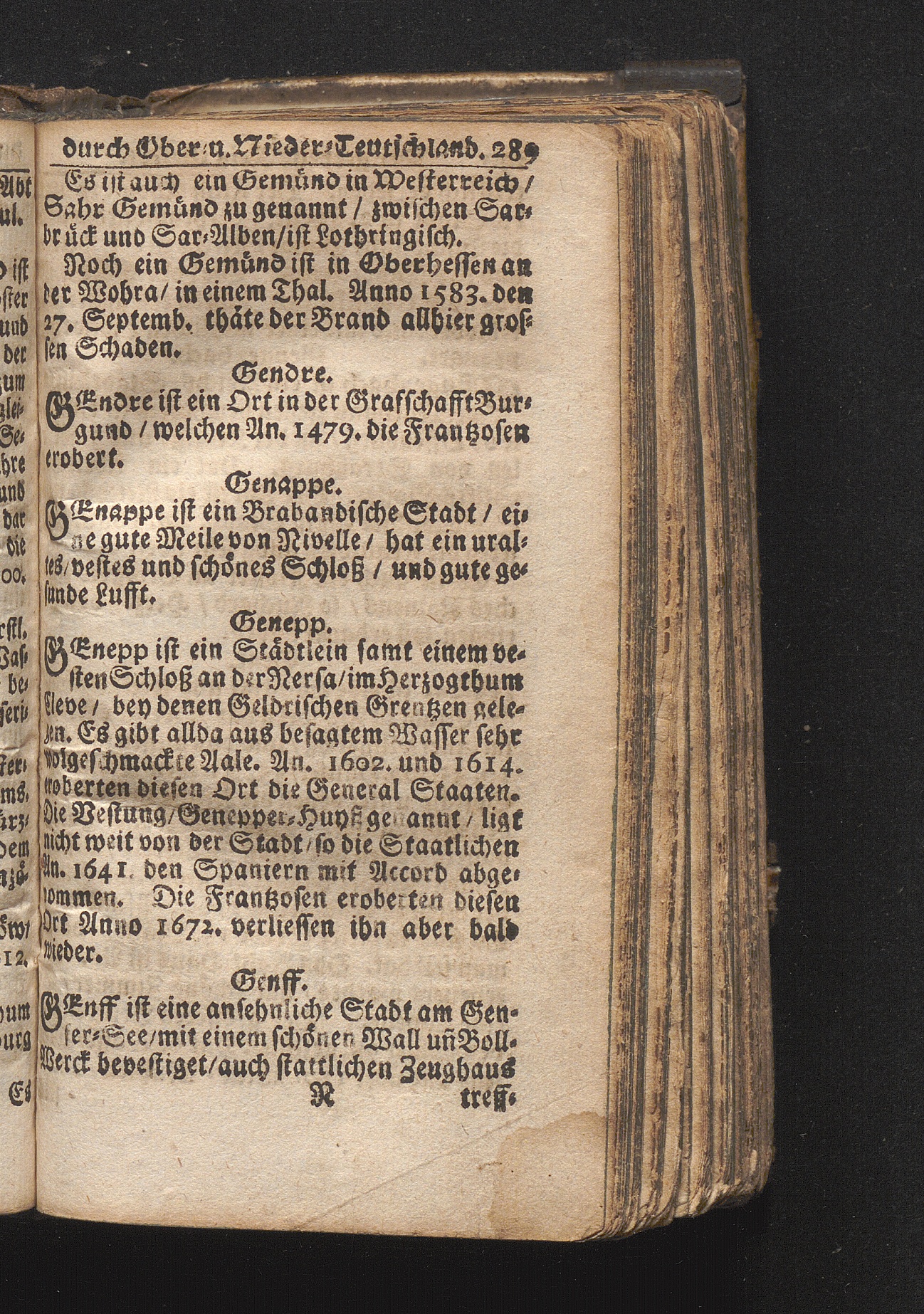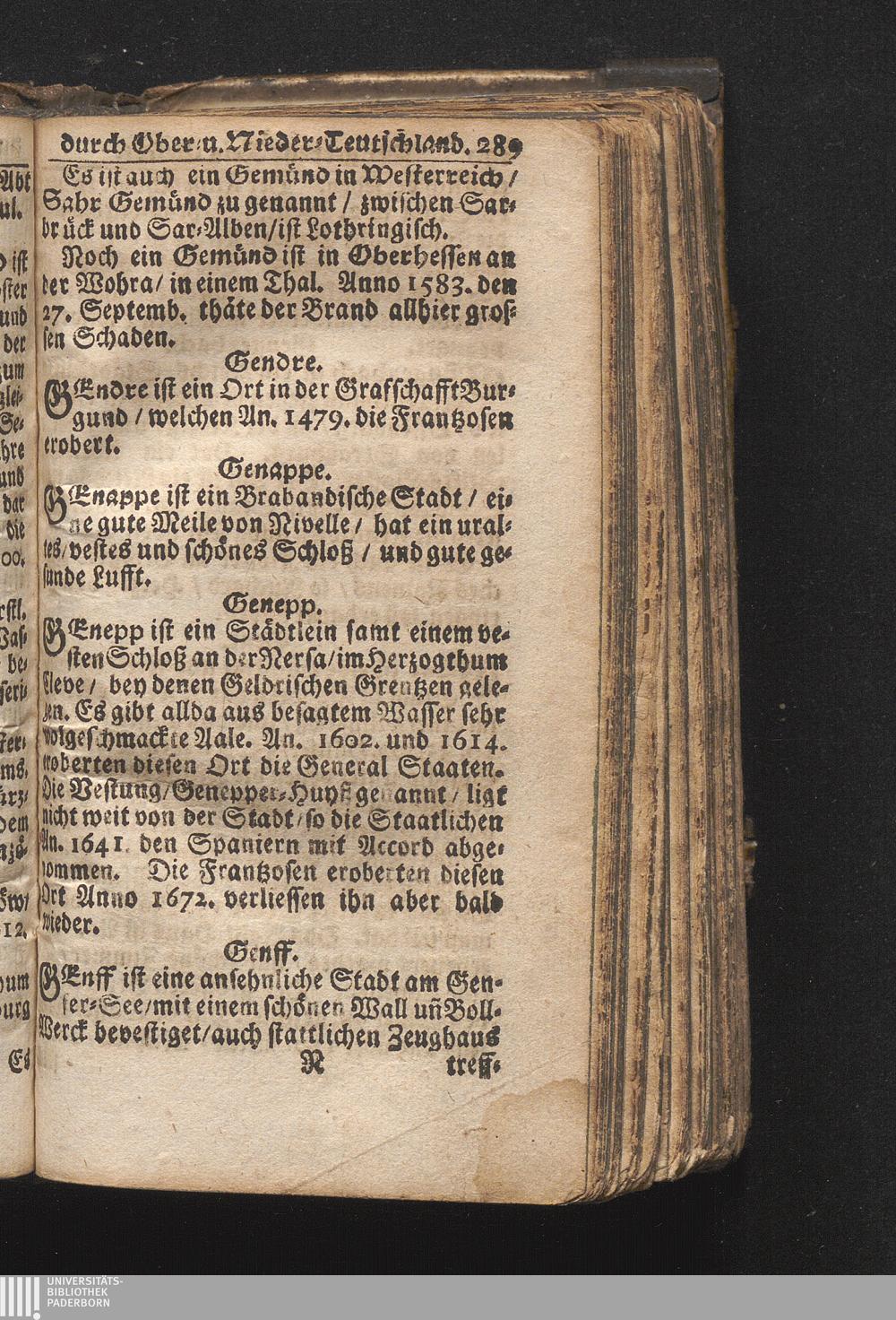 Der getreue Reiß-Gefert durch Ober- und Nieder-Teutschland : Das ist: Grundrichtige und ausführliche Abhandlung derer jenigen Residenzien/ Städte/ Schlösser/ Vestungen/ Städtlein und nahmhafften Markflecken/ welche so wol in Ober- als Nieder-Teutschland/ einem Reisenden sich hin und wieder vorstellig machen und zwar solcher Gestalt/ daß darinn derer Ursprung/ Aufnahm/ Fortification/ Raritäten/ herrliche Gebäue/ und Glück- und Unglücks-Fälle bis auf gegenwärtige Zeit fortgesetzt enthalten. Dabey auch noch über das ein absonderlicher kurz-gefasster Weegweiser angehänget zu finden/ worinnen klärlich zu sehen, wie viel Meilen ein Ort von dem andern entlegen. Alles aus denen bewährtesten Scribenten hervorgesuchet/ zum Nutz-Ergötzen mitgetheilet ...