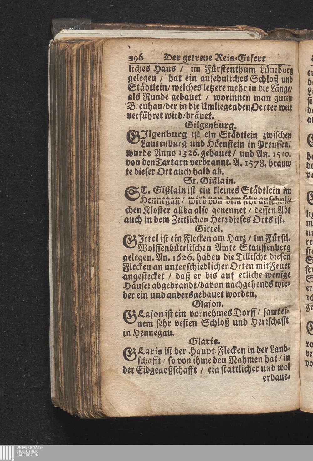 Der getreue Reiß-Gefert durch Ober- und Nieder-Teutschland : Das ist: Grundrichtige und ausführliche Abhandlung derer jenigen Residenzien/ Städte/ Schlösser/ Vestungen/ Städtlein und nahmhafften Markflecken/ welche so wol in Ober- als Nieder-Teutschland/ einem Reisenden sich hin und wieder vorstellig machen und zwar solcher Gestalt/ daß darinn derer Ursprung/ Aufnahm/ Fortification/ Raritäten/ herrliche Gebäue/ und Glück- und Unglücks-Fälle bis auf gegenwärtige Zeit fortgesetzt enthalten. Dabey auch noch über das ein absonderlicher kurz-gefasster Weegweiser angehänget zu finden/ worinnen klärlich zu sehen, wie viel Meilen ein Ort von dem andern entlegen. Alles aus denen bewährtesten Scribenten hervorgesuchet/ zum Nutz-Ergötzen mitgetheilet ...