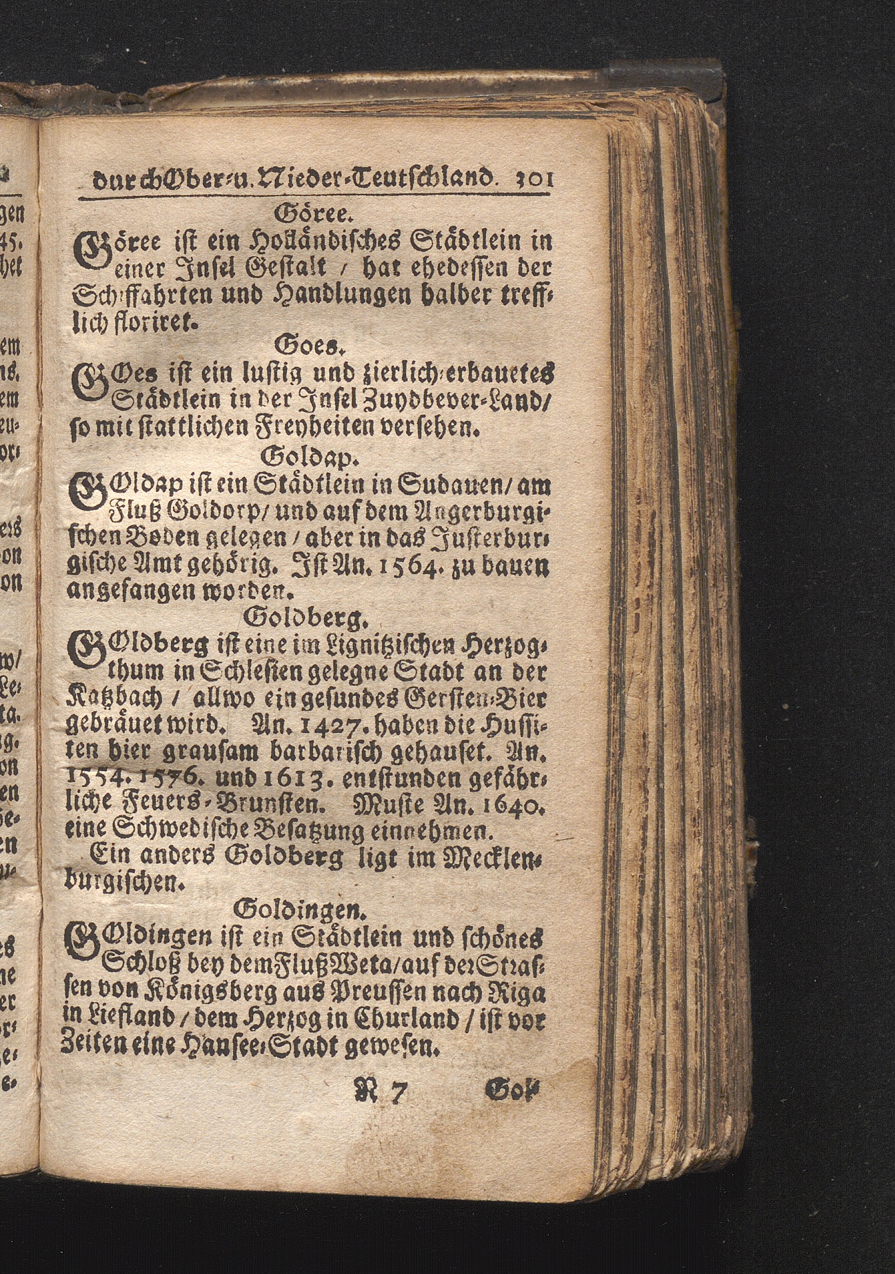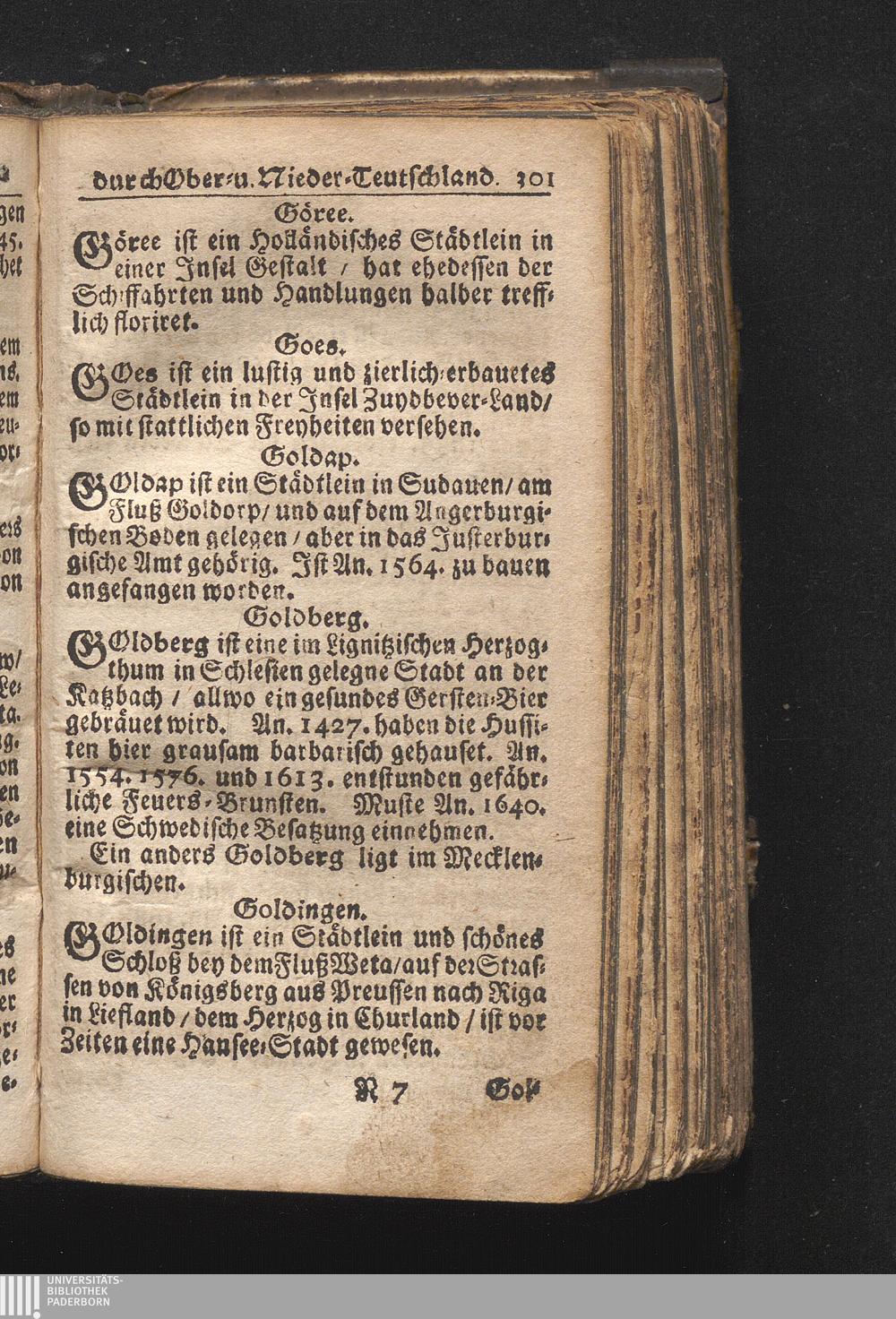 Der getreue Reiß-Gefert durch Ober- und Nieder-Teutschland : Das ist: Grundrichtige und ausführliche Abhandlung derer jenigen Residenzien/ Städte/ Schlösser/ Vestungen/ Städtlein und nahmhafften Markflecken/ welche so wol in Ober- als Nieder-Teutschland/ einem Reisenden sich hin und wieder vorstellig machen und zwar solcher Gestalt/ daß darinn derer Ursprung/ Aufnahm/ Fortification/ Raritäten/ herrliche Gebäue/ und Glück- und Unglücks-Fälle bis auf gegenwärtige Zeit fortgesetzt enthalten. Dabey auch noch über das ein absonderlicher kurz-gefasster Weegweiser angehänget zu finden/ worinnen klärlich zu sehen, wie viel Meilen ein Ort von dem andern entlegen. Alles aus denen bewährtesten Scribenten hervorgesuchet/ zum Nutz-Ergötzen mitgetheilet ...