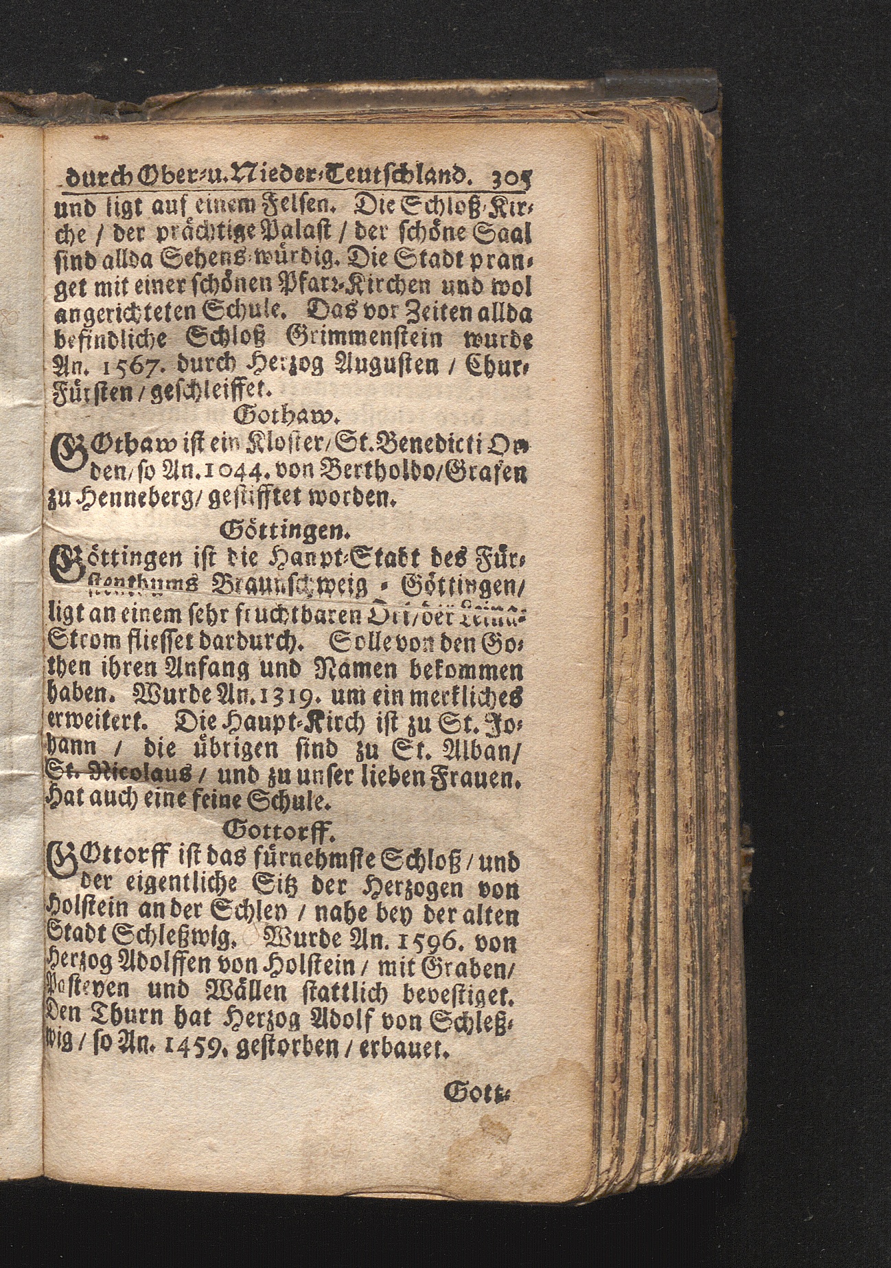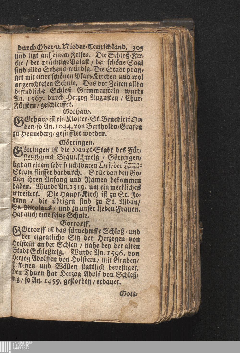 Der getreue Reiß-Gefert durch Ober- und Nieder-Teutschland : Das ist: Grundrichtige und ausführliche Abhandlung derer jenigen Residenzien/ Städte/ Schlösser/ Vestungen/ Städtlein und nahmhafften Markflecken/ welche so wol in Ober- als Nieder-Teutschland/ einem Reisenden sich hin und wieder vorstellig machen und zwar solcher Gestalt/ daß darinn derer Ursprung/ Aufnahm/ Fortification/ Raritäten/ herrliche Gebäue/ und Glück- und Unglücks-Fälle bis auf gegenwärtige Zeit fortgesetzt enthalten. Dabey auch noch über das ein absonderlicher kurz-gefasster Weegweiser angehänget zu finden/ worinnen klärlich zu sehen, wie viel Meilen ein Ort von dem andern entlegen. Alles aus denen bewährtesten Scribenten hervorgesuchet/ zum Nutz-Ergötzen mitgetheilet ...