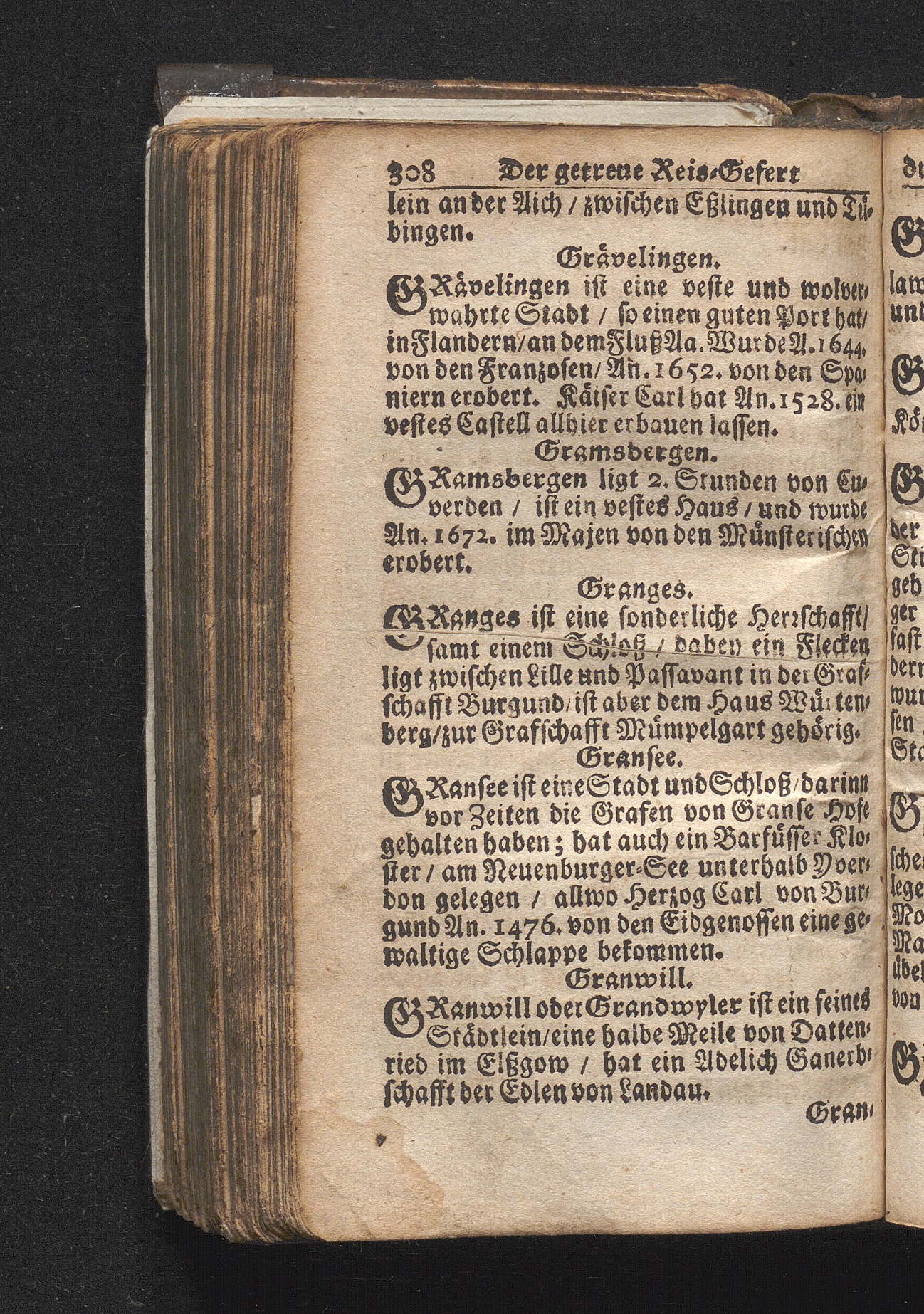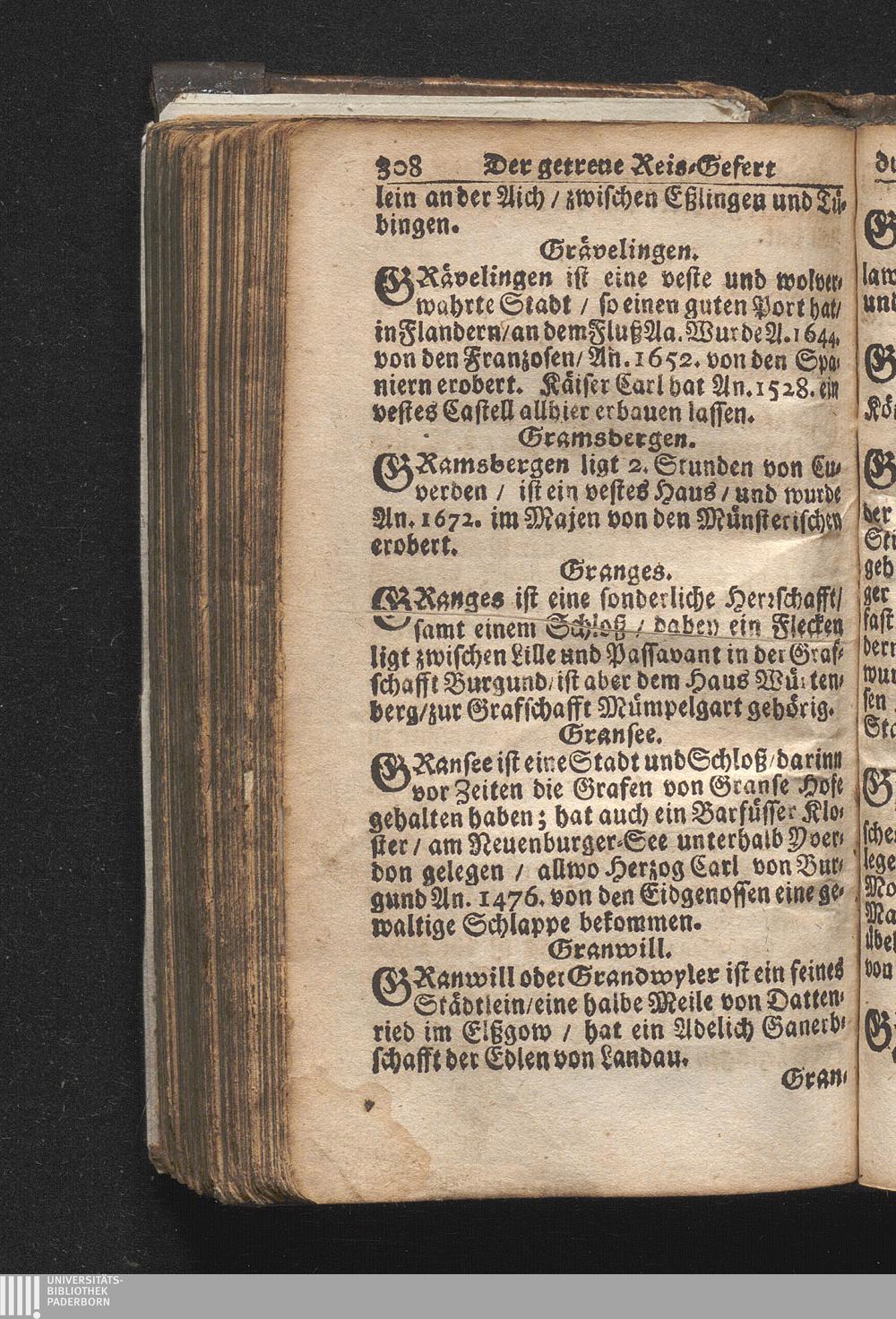 Der getreue Reiß-Gefert durch Ober- und Nieder-Teutschland : Das ist: Grundrichtige und ausführliche Abhandlung derer jenigen Residenzien/ Städte/ Schlösser/ Vestungen/ Städtlein und nahmhafften Markflecken/ welche so wol in Ober- als Nieder-Teutschland/ einem Reisenden sich hin und wieder vorstellig machen und zwar solcher Gestalt/ daß darinn derer Ursprung/ Aufnahm/ Fortification/ Raritäten/ herrliche Gebäue/ und Glück- und Unglücks-Fälle bis auf gegenwärtige Zeit fortgesetzt enthalten. Dabey auch noch über das ein absonderlicher kurz-gefasster Weegweiser angehänget zu finden/ worinnen klärlich zu sehen, wie viel Meilen ein Ort von dem andern entlegen. Alles aus denen bewährtesten Scribenten hervorgesuchet/ zum Nutz-Ergötzen mitgetheilet ...