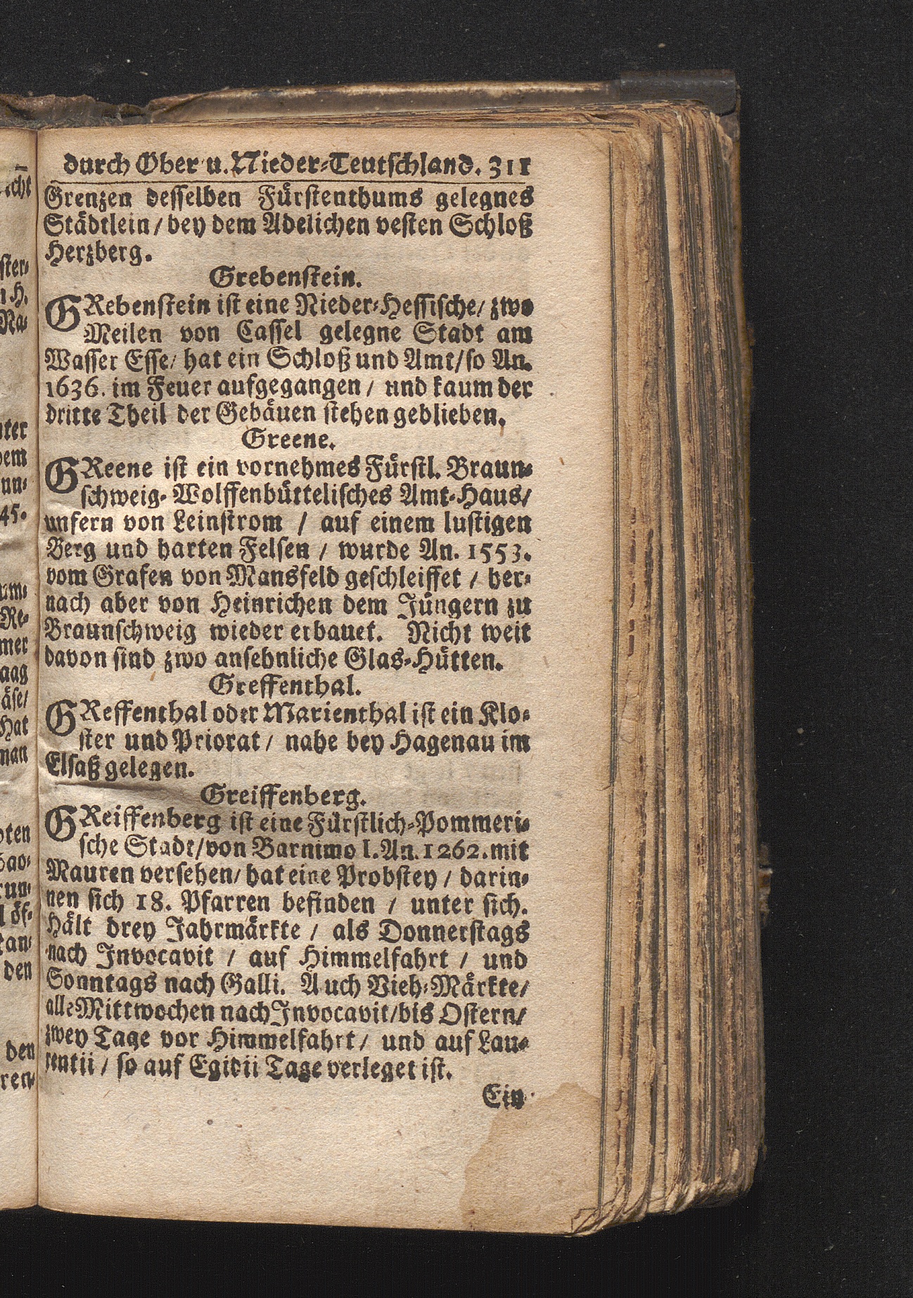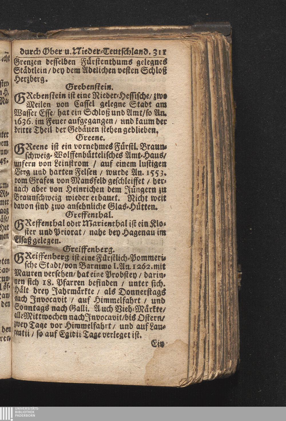 Der getreue Reiß-Gefert durch Ober- und Nieder-Teutschland : Das ist: Grundrichtige und ausführliche Abhandlung derer jenigen Residenzien/ Städte/ Schlösser/ Vestungen/ Städtlein und nahmhafften Markflecken/ welche so wol in Ober- als Nieder-Teutschland/ einem Reisenden sich hin und wieder vorstellig machen und zwar solcher Gestalt/ daß darinn derer Ursprung/ Aufnahm/ Fortification/ Raritäten/ herrliche Gebäue/ und Glück- und Unglücks-Fälle bis auf gegenwärtige Zeit fortgesetzt enthalten. Dabey auch noch über das ein absonderlicher kurz-gefasster Weegweiser angehänget zu finden/ worinnen klärlich zu sehen, wie viel Meilen ein Ort von dem andern entlegen. Alles aus denen bewährtesten Scribenten hervorgesuchet/ zum Nutz-Ergötzen mitgetheilet ...