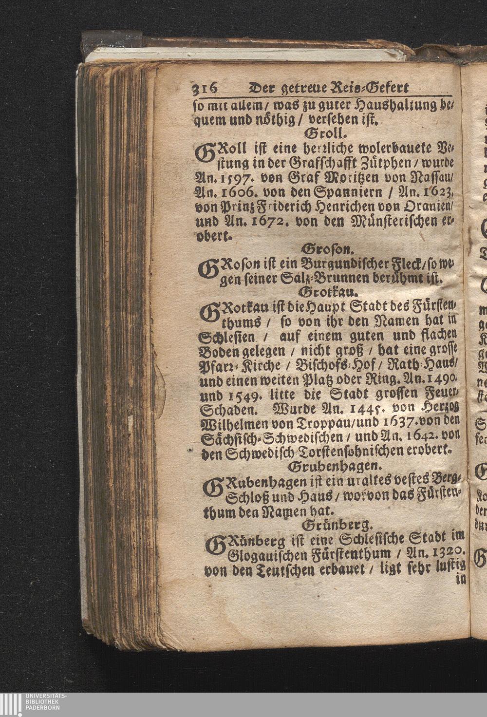 Der getreue Reiß-Gefert durch Ober- und Nieder-Teutschland : Das ist: Grundrichtige und ausführliche Abhandlung derer jenigen Residenzien/ Städte/ Schlösser/ Vestungen/ Städtlein und nahmhafften Markflecken/ welche so wol in Ober- als Nieder-Teutschland/ einem Reisenden sich hin und wieder vorstellig machen und zwar solcher Gestalt/ daß darinn derer Ursprung/ Aufnahm/ Fortification/ Raritäten/ herrliche Gebäue/ und Glück- und Unglücks-Fälle bis auf gegenwärtige Zeit fortgesetzt enthalten. Dabey auch noch über das ein absonderlicher kurz-gefasster Weegweiser angehänget zu finden/ worinnen klärlich zu sehen, wie viel Meilen ein Ort von dem andern entlegen. Alles aus denen bewährtesten Scribenten hervorgesuchet/ zum Nutz-Ergötzen mitgetheilet ...