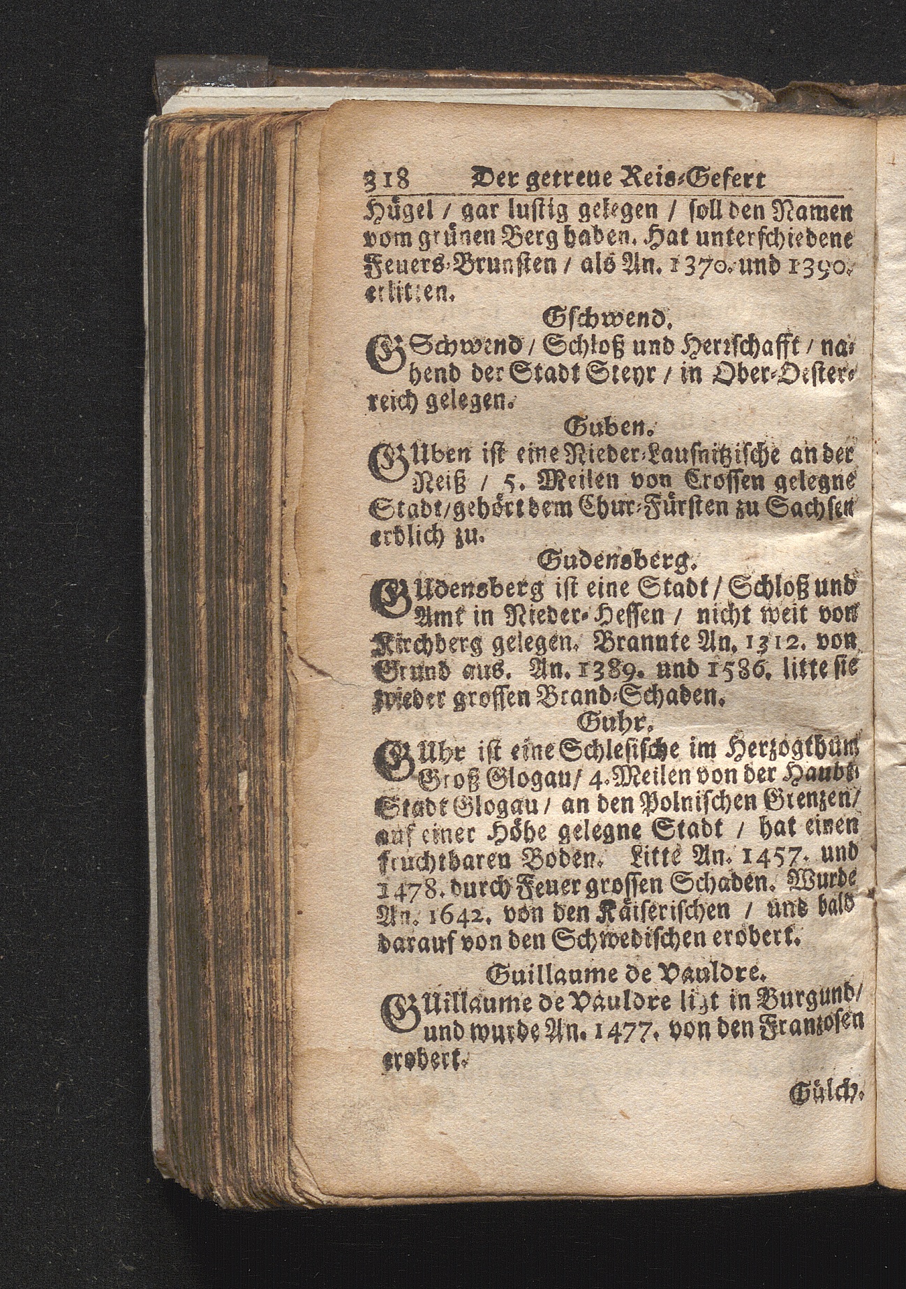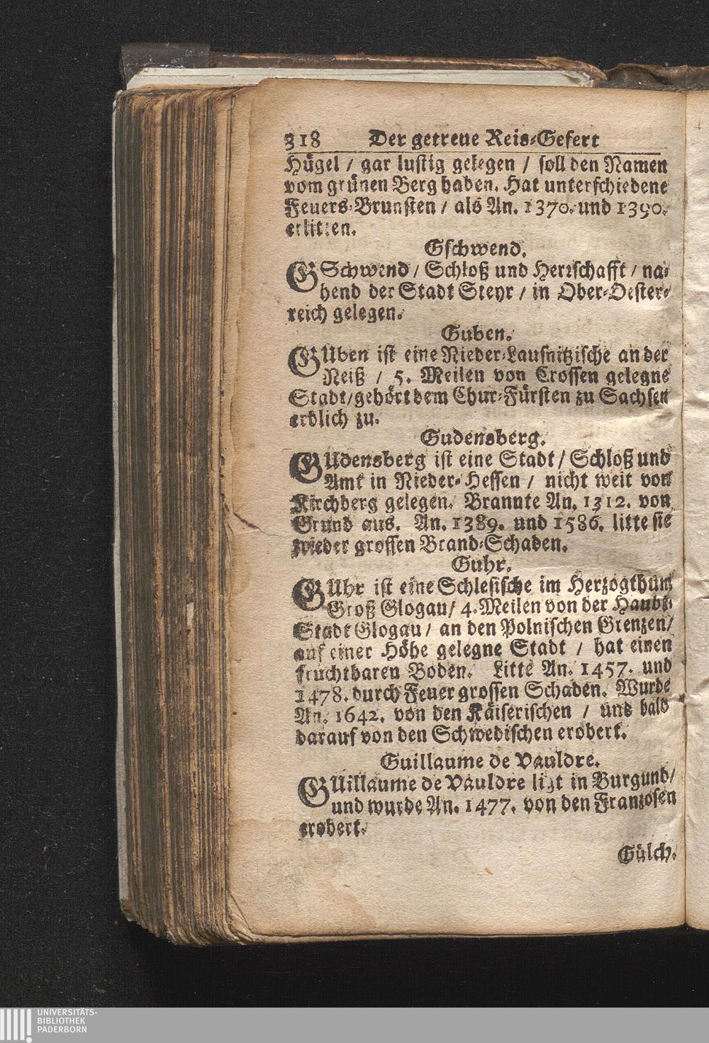 Der getreue Reiß-Gefert durch Ober- und Nieder-Teutschland : Das ist: Grundrichtige und ausführliche Abhandlung derer jenigen Residenzien/ Städte/ Schlösser/ Vestungen/ Städtlein und nahmhafften Markflecken/ welche so wol in Ober- als Nieder-Teutschland/ einem Reisenden sich hin und wieder vorstellig machen und zwar solcher Gestalt/ daß darinn derer Ursprung/ Aufnahm/ Fortification/ Raritäten/ herrliche Gebäue/ und Glück- und Unglücks-Fälle bis auf gegenwärtige Zeit fortgesetzt enthalten. Dabey auch noch über das ein absonderlicher kurz-gefasster Weegweiser angehänget zu finden/ worinnen klärlich zu sehen, wie viel Meilen ein Ort von dem andern entlegen. Alles aus denen bewährtesten Scribenten hervorgesuchet/ zum Nutz-Ergötzen mitgetheilet ...