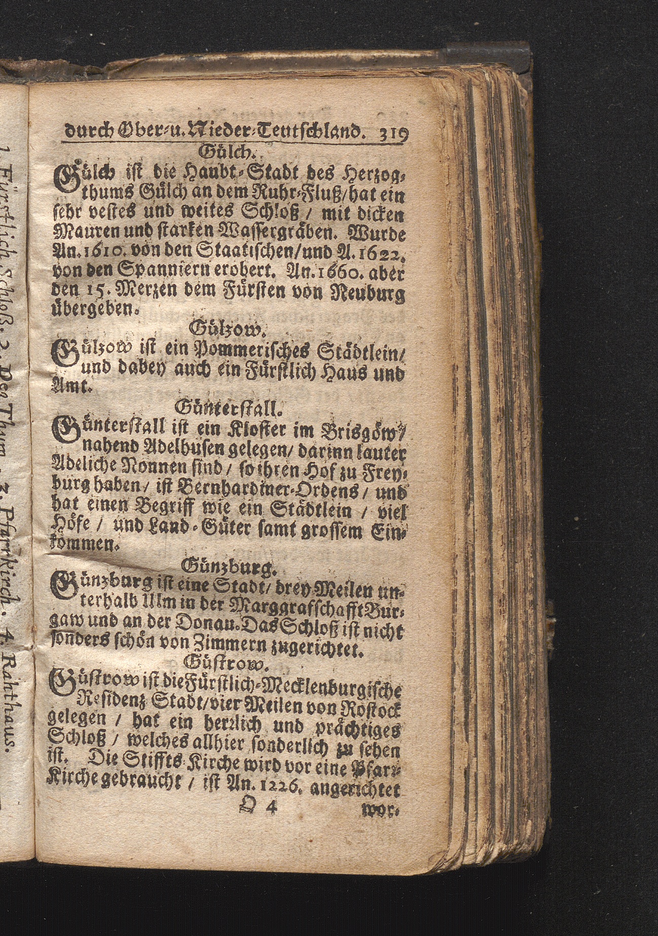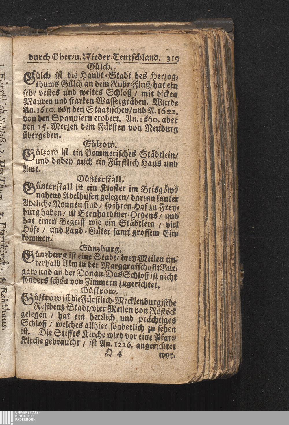 Der getreue Reiß-Gefert durch Ober- und Nieder-Teutschland : Das ist: Grundrichtige und ausführliche Abhandlung derer jenigen Residenzien/ Städte/ Schlösser/ Vestungen/ Städtlein und nahmhafften Markflecken/ welche so wol in Ober- als Nieder-Teutschland/ einem Reisenden sich hin und wieder vorstellig machen und zwar solcher Gestalt/ daß darinn derer Ursprung/ Aufnahm/ Fortification/ Raritäten/ herrliche Gebäue/ und Glück- und Unglücks-Fälle bis auf gegenwärtige Zeit fortgesetzt enthalten. Dabey auch noch über das ein absonderlicher kurz-gefasster Weegweiser angehänget zu finden/ worinnen klärlich zu sehen, wie viel Meilen ein Ort von dem andern entlegen. Alles aus denen bewährtesten Scribenten hervorgesuchet/ zum Nutz-Ergötzen mitgetheilet ...