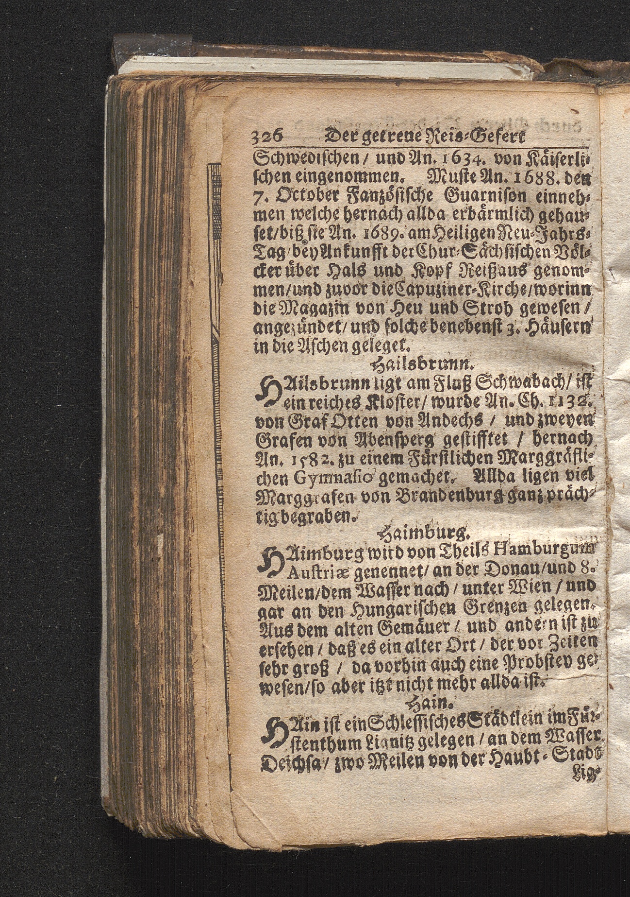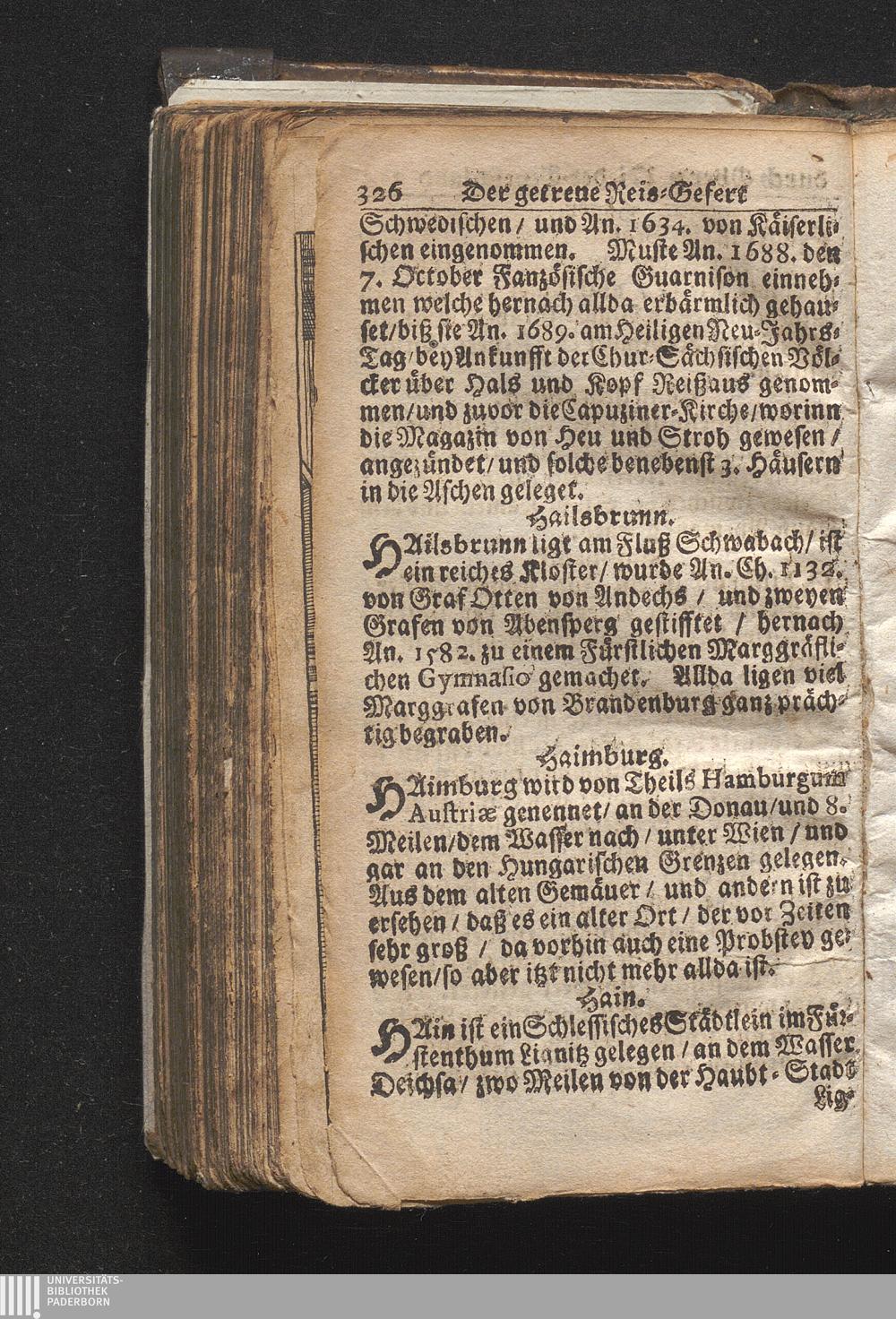 Der getreue Reiß-Gefert durch Ober- und Nieder-Teutschland : Das ist: Grundrichtige und ausführliche Abhandlung derer jenigen Residenzien/ Städte/ Schlösser/ Vestungen/ Städtlein und nahmhafften Markflecken/ welche so wol in Ober- als Nieder-Teutschland/ einem Reisenden sich hin und wieder vorstellig machen und zwar solcher Gestalt/ daß darinn derer Ursprung/ Aufnahm/ Fortification/ Raritäten/ herrliche Gebäue/ und Glück- und Unglücks-Fälle bis auf gegenwärtige Zeit fortgesetzt enthalten. Dabey auch noch über das ein absonderlicher kurz-gefasster Weegweiser angehänget zu finden/ worinnen klärlich zu sehen, wie viel Meilen ein Ort von dem andern entlegen. Alles aus denen bewährtesten Scribenten hervorgesuchet/ zum Nutz-Ergötzen mitgetheilet ...