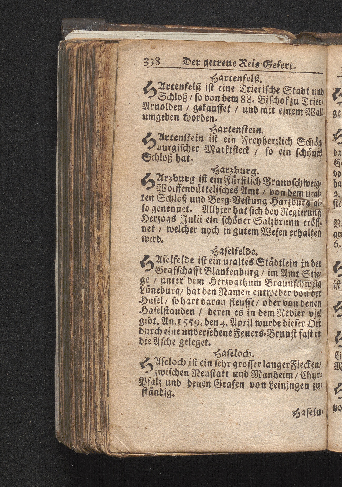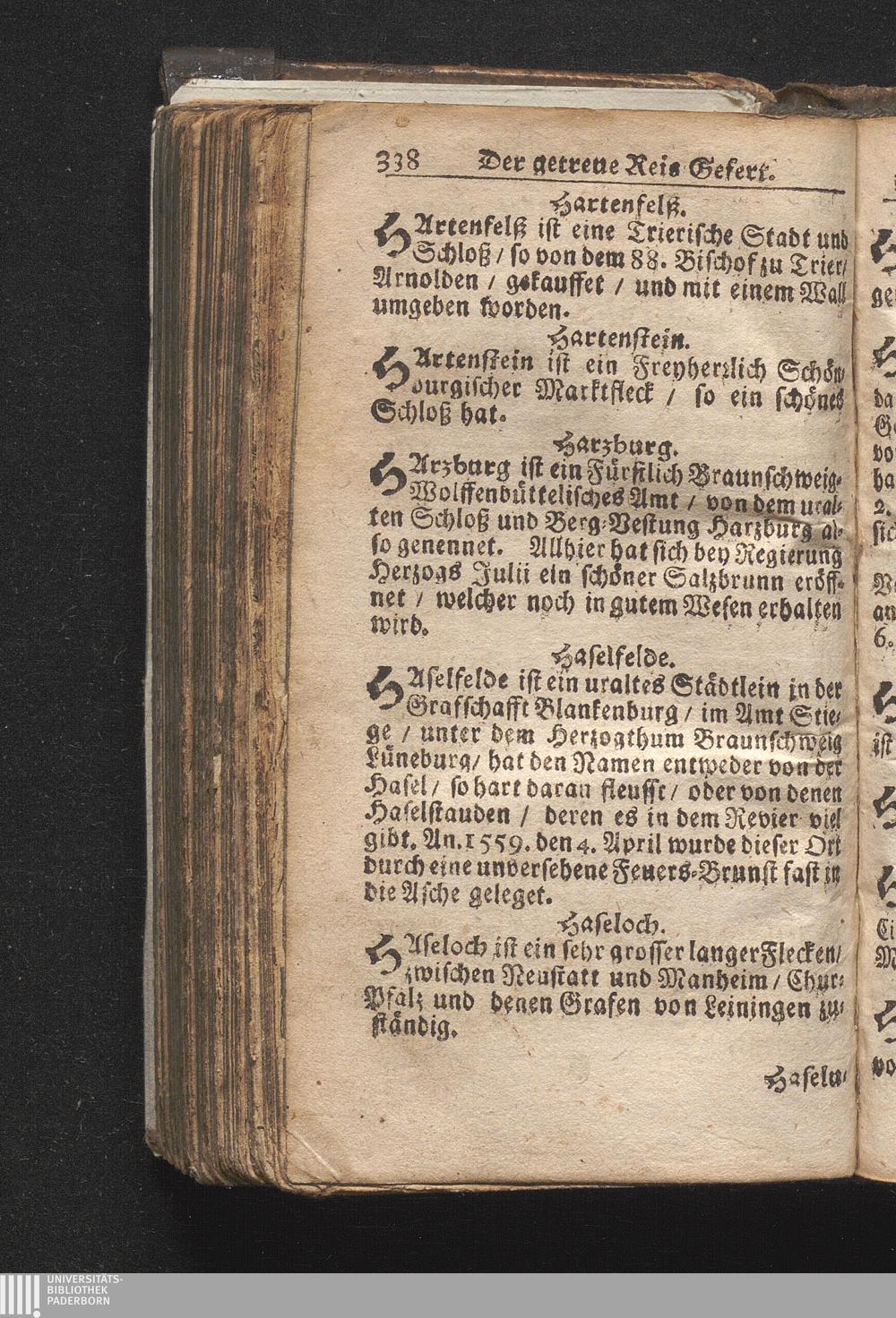 Der getreue Reiß-Gefert durch Ober- und Nieder-Teutschland : Das ist: Grundrichtige und ausführliche Abhandlung derer jenigen Residenzien/ Städte/ Schlösser/ Vestungen/ Städtlein und nahmhafften Markflecken/ welche so wol in Ober- als Nieder-Teutschland/ einem Reisenden sich hin und wieder vorstellig machen und zwar solcher Gestalt/ daß darinn derer Ursprung/ Aufnahm/ Fortification/ Raritäten/ herrliche Gebäue/ und Glück- und Unglücks-Fälle bis auf gegenwärtige Zeit fortgesetzt enthalten. Dabey auch noch über das ein absonderlicher kurz-gefasster Weegweiser angehänget zu finden/ worinnen klärlich zu sehen, wie viel Meilen ein Ort von dem andern entlegen. Alles aus denen bewährtesten Scribenten hervorgesuchet/ zum Nutz-Ergötzen mitgetheilet ...