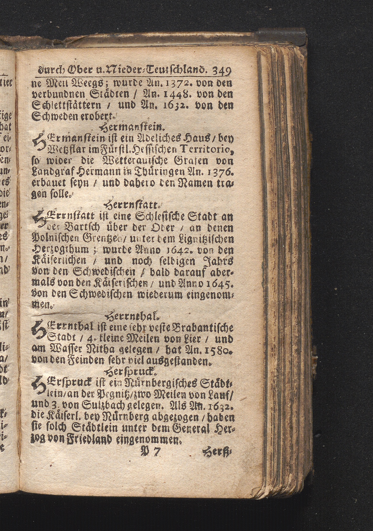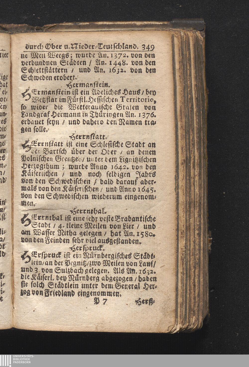 Der getreue Reiß-Gefert durch Ober- und Nieder-Teutschland : Das ist: Grundrichtige und ausführliche Abhandlung derer jenigen Residenzien/ Städte/ Schlösser/ Vestungen/ Städtlein und nahmhafften Markflecken/ welche so wol in Ober- als Nieder-Teutschland/ einem Reisenden sich hin und wieder vorstellig machen und zwar solcher Gestalt/ daß darinn derer Ursprung/ Aufnahm/ Fortification/ Raritäten/ herrliche Gebäue/ und Glück- und Unglücks-Fälle bis auf gegenwärtige Zeit fortgesetzt enthalten. Dabey auch noch über das ein absonderlicher kurz-gefasster Weegweiser angehänget zu finden/ worinnen klärlich zu sehen, wie viel Meilen ein Ort von dem andern entlegen. Alles aus denen bewährtesten Scribenten hervorgesuchet/ zum Nutz-Ergötzen mitgetheilet ...
