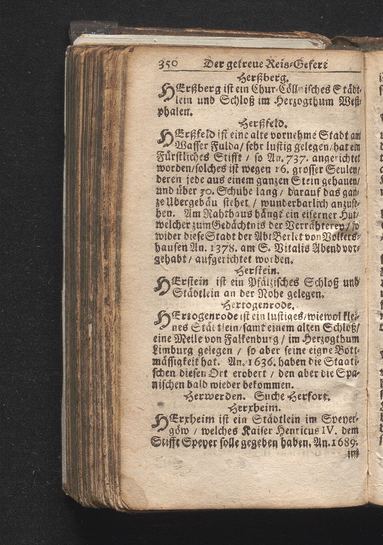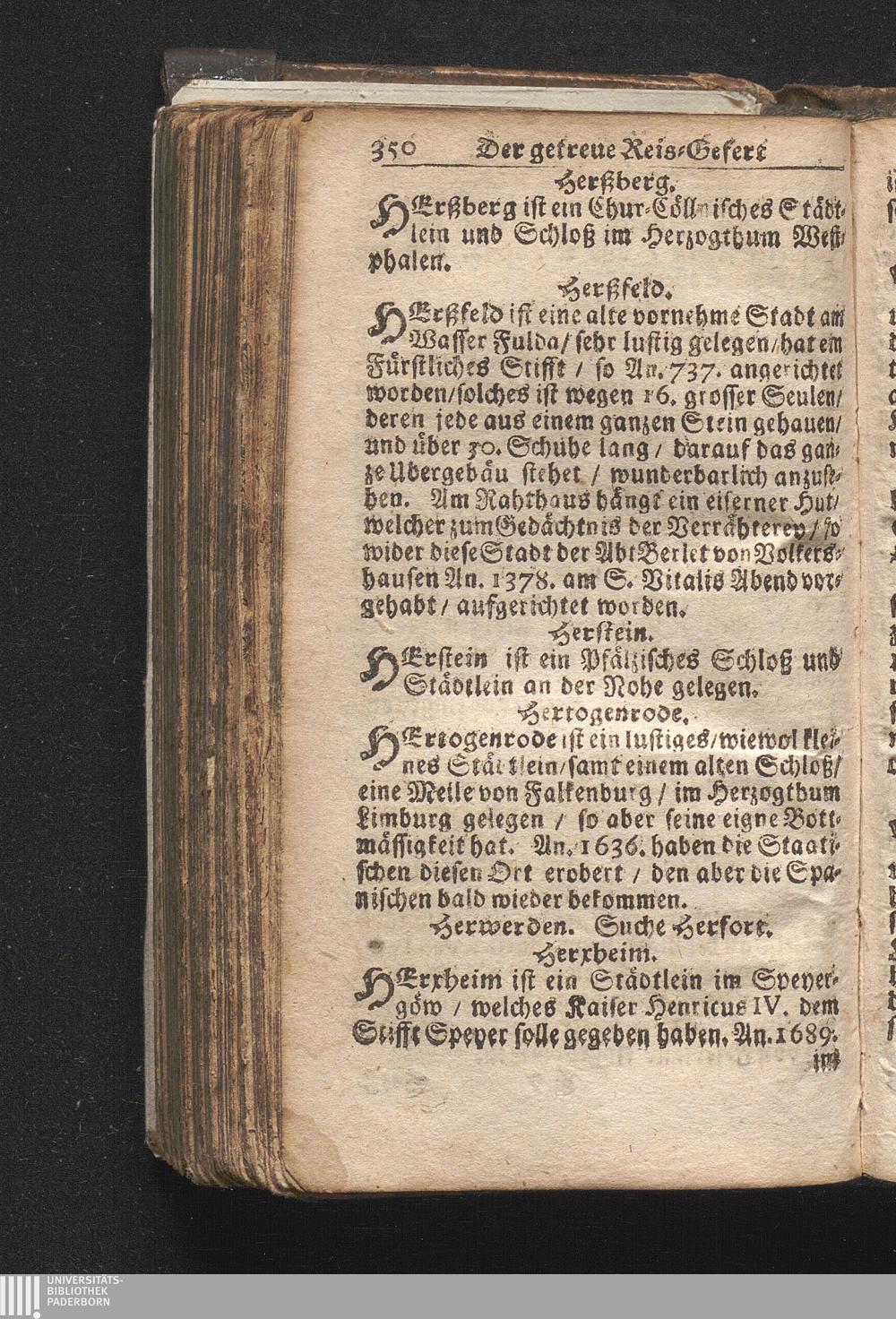 Der getreue Reiß-Gefert durch Ober- und Nieder-Teutschland : Das ist: Grundrichtige und ausführliche Abhandlung derer jenigen Residenzien/ Städte/ Schlösser/ Vestungen/ Städtlein und nahmhafften Markflecken/ welche so wol in Ober- als Nieder-Teutschland/ einem Reisenden sich hin und wieder vorstellig machen und zwar solcher Gestalt/ daß darinn derer Ursprung/ Aufnahm/ Fortification/ Raritäten/ herrliche Gebäue/ und Glück- und Unglücks-Fälle bis auf gegenwärtige Zeit fortgesetzt enthalten. Dabey auch noch über das ein absonderlicher kurz-gefasster Weegweiser angehänget zu finden/ worinnen klärlich zu sehen, wie viel Meilen ein Ort von dem andern entlegen. Alles aus denen bewährtesten Scribenten hervorgesuchet/ zum Nutz-Ergötzen mitgetheilet ...