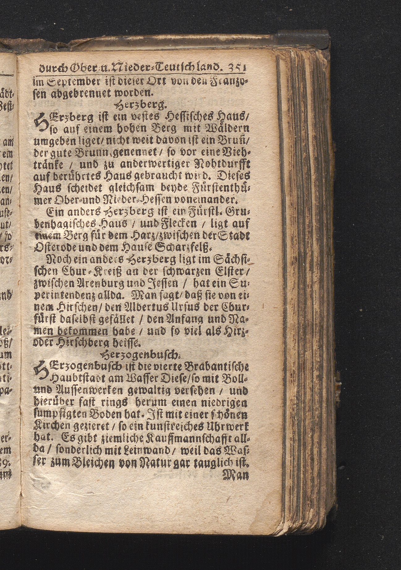 Der getreue Reiß-Gefert durch Ober- und Nieder-Teutschland : Das ist: Grundrichtige und ausführliche Abhandlung derer jenigen Residenzien/ Städte/ Schlösser/ Vestungen/ Städtlein und nahmhafften Markflecken/ welche so wol in Ober- als Nieder-Teutschland/ einem Reisenden sich hin und wieder vorstellig machen und zwar solcher Gestalt/ daß darinn derer Ursprung/ Aufnahm/ Fortification/ Raritäten/ herrliche Gebäue/ und Glück- und Unglücks-Fälle bis auf gegenwärtige Zeit fortgesetzt enthalten. Dabey auch noch über das ein absonderlicher kurz-gefasster Weegweiser angehänget zu finden/ worinnen klärlich zu sehen, wie viel Meilen ein Ort von dem andern entlegen. Alles aus denen bewährtesten Scribenten hervorgesuchet/ zum Nutz-Ergötzen mitgetheilet ...