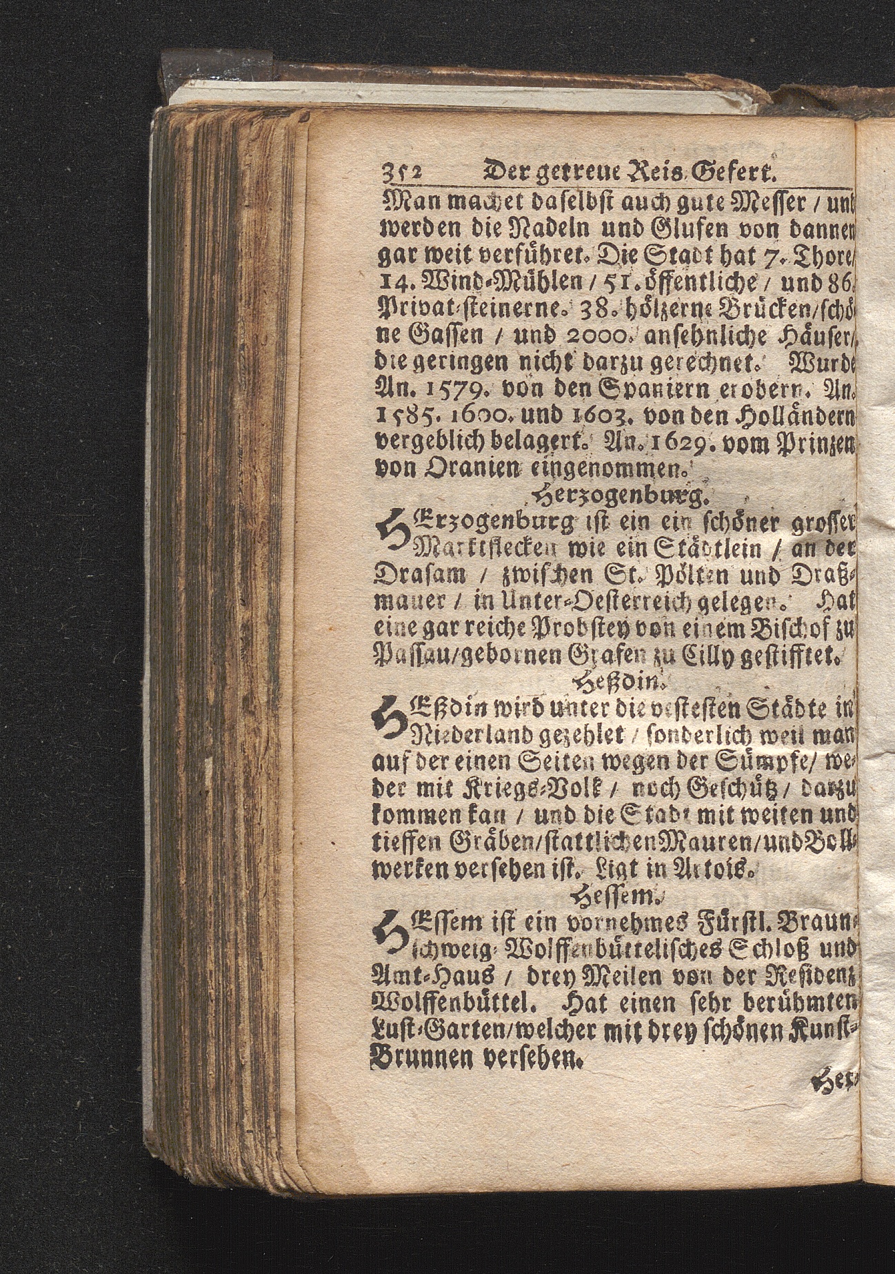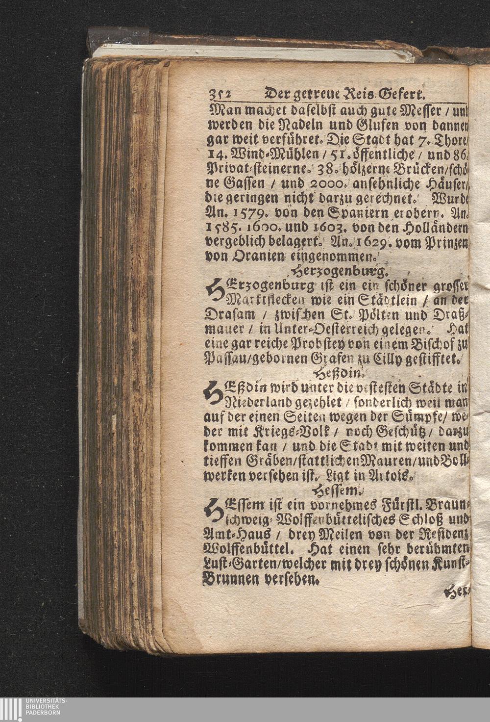 Der getreue Reiß-Gefert durch Ober- und Nieder-Teutschland : Das ist: Grundrichtige und ausführliche Abhandlung derer jenigen Residenzien/ Städte/ Schlösser/ Vestungen/ Städtlein und nahmhafften Markflecken/ welche so wol in Ober- als Nieder-Teutschland/ einem Reisenden sich hin und wieder vorstellig machen und zwar solcher Gestalt/ daß darinn derer Ursprung/ Aufnahm/ Fortification/ Raritäten/ herrliche Gebäue/ und Glück- und Unglücks-Fälle bis auf gegenwärtige Zeit fortgesetzt enthalten. Dabey auch noch über das ein absonderlicher kurz-gefasster Weegweiser angehänget zu finden/ worinnen klärlich zu sehen, wie viel Meilen ein Ort von dem andern entlegen. Alles aus denen bewährtesten Scribenten hervorgesuchet/ zum Nutz-Ergötzen mitgetheilet ...