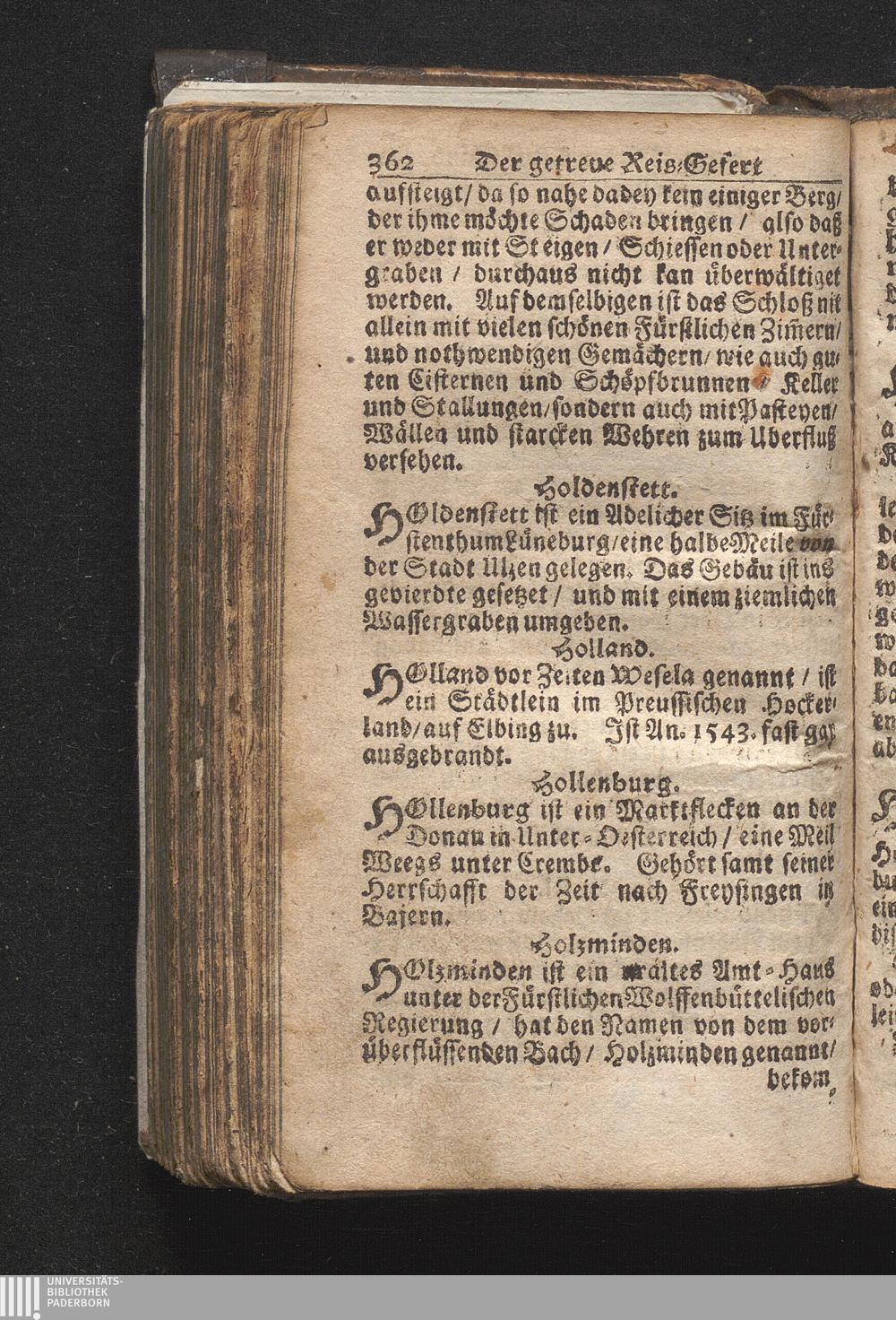 Der getreue Reiß-Gefert durch Ober- und Nieder-Teutschland : Das ist: Grundrichtige und ausführliche Abhandlung derer jenigen Residenzien/ Städte/ Schlösser/ Vestungen/ Städtlein und nahmhafften Markflecken/ welche so wol in Ober- als Nieder-Teutschland/ einem Reisenden sich hin und wieder vorstellig machen und zwar solcher Gestalt/ daß darinn derer Ursprung/ Aufnahm/ Fortification/ Raritäten/ herrliche Gebäue/ und Glück- und Unglücks-Fälle bis auf gegenwärtige Zeit fortgesetzt enthalten. Dabey auch noch über das ein absonderlicher kurz-gefasster Weegweiser angehänget zu finden/ worinnen klärlich zu sehen, wie viel Meilen ein Ort von dem andern entlegen. Alles aus denen bewährtesten Scribenten hervorgesuchet/ zum Nutz-Ergötzen mitgetheilet ...