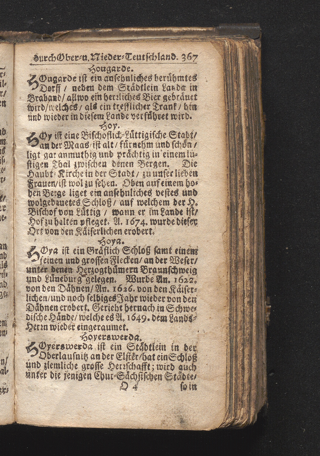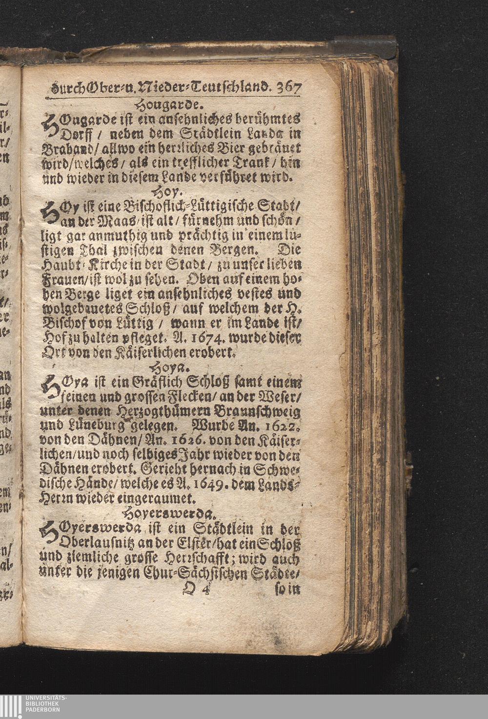 Der getreue Reiß-Gefert durch Ober- und Nieder-Teutschland : Das ist: Grundrichtige und ausführliche Abhandlung derer jenigen Residenzien/ Städte/ Schlösser/ Vestungen/ Städtlein und nahmhafften Markflecken/ welche so wol in Ober- als Nieder-Teutschland/ einem Reisenden sich hin und wieder vorstellig machen und zwar solcher Gestalt/ daß darinn derer Ursprung/ Aufnahm/ Fortification/ Raritäten/ herrliche Gebäue/ und Glück- und Unglücks-Fälle bis auf gegenwärtige Zeit fortgesetzt enthalten. Dabey auch noch über das ein absonderlicher kurz-gefasster Weegweiser angehänget zu finden/ worinnen klärlich zu sehen, wie viel Meilen ein Ort von dem andern entlegen. Alles aus denen bewährtesten Scribenten hervorgesuchet/ zum Nutz-Ergötzen mitgetheilet ...