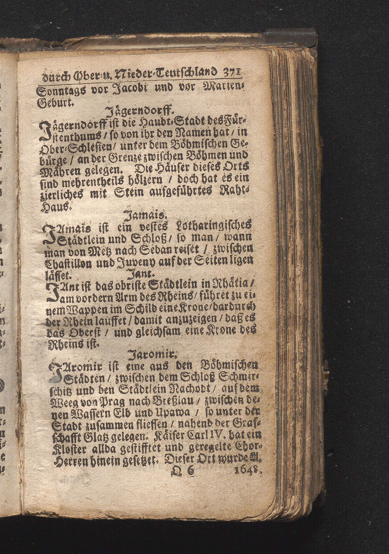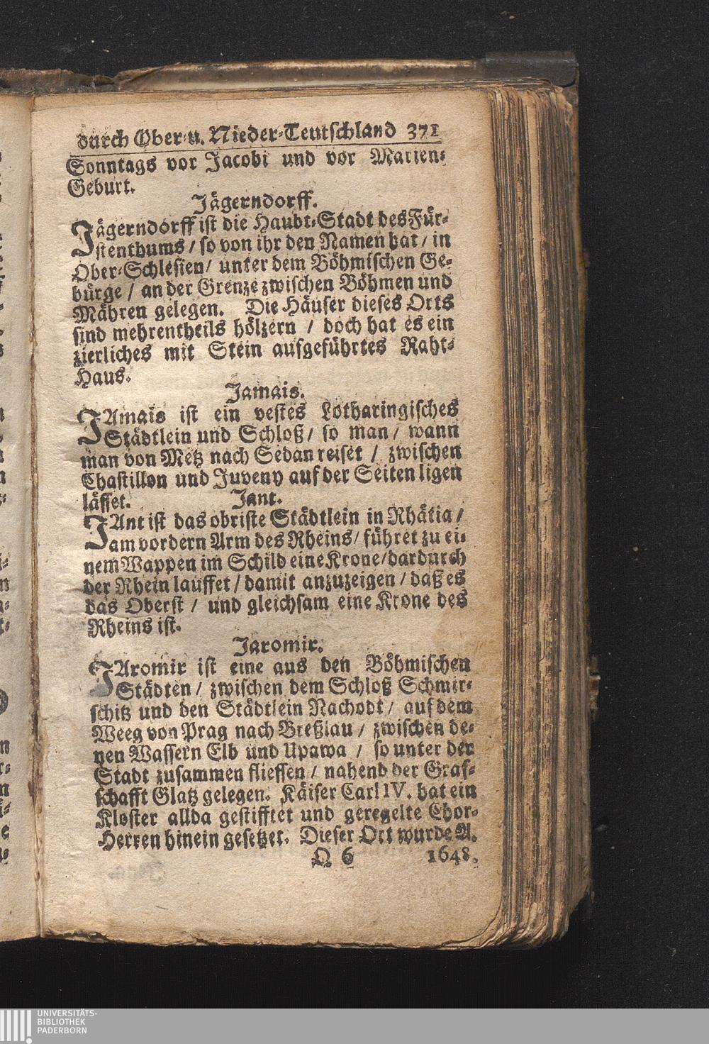 Der getreue Reiß-Gefert durch Ober- und Nieder-Teutschland : Das ist: Grundrichtige und ausführliche Abhandlung derer jenigen Residenzien/ Städte/ Schlösser/ Vestungen/ Städtlein und nahmhafften Markflecken/ welche so wol in Ober- als Nieder-Teutschland/ einem Reisenden sich hin und wieder vorstellig machen und zwar solcher Gestalt/ daß darinn derer Ursprung/ Aufnahm/ Fortification/ Raritäten/ herrliche Gebäue/ und Glück- und Unglücks-Fälle bis auf gegenwärtige Zeit fortgesetzt enthalten. Dabey auch noch über das ein absonderlicher kurz-gefasster Weegweiser angehänget zu finden/ worinnen klärlich zu sehen, wie viel Meilen ein Ort von dem andern entlegen. Alles aus denen bewährtesten Scribenten hervorgesuchet/ zum Nutz-Ergötzen mitgetheilet ...