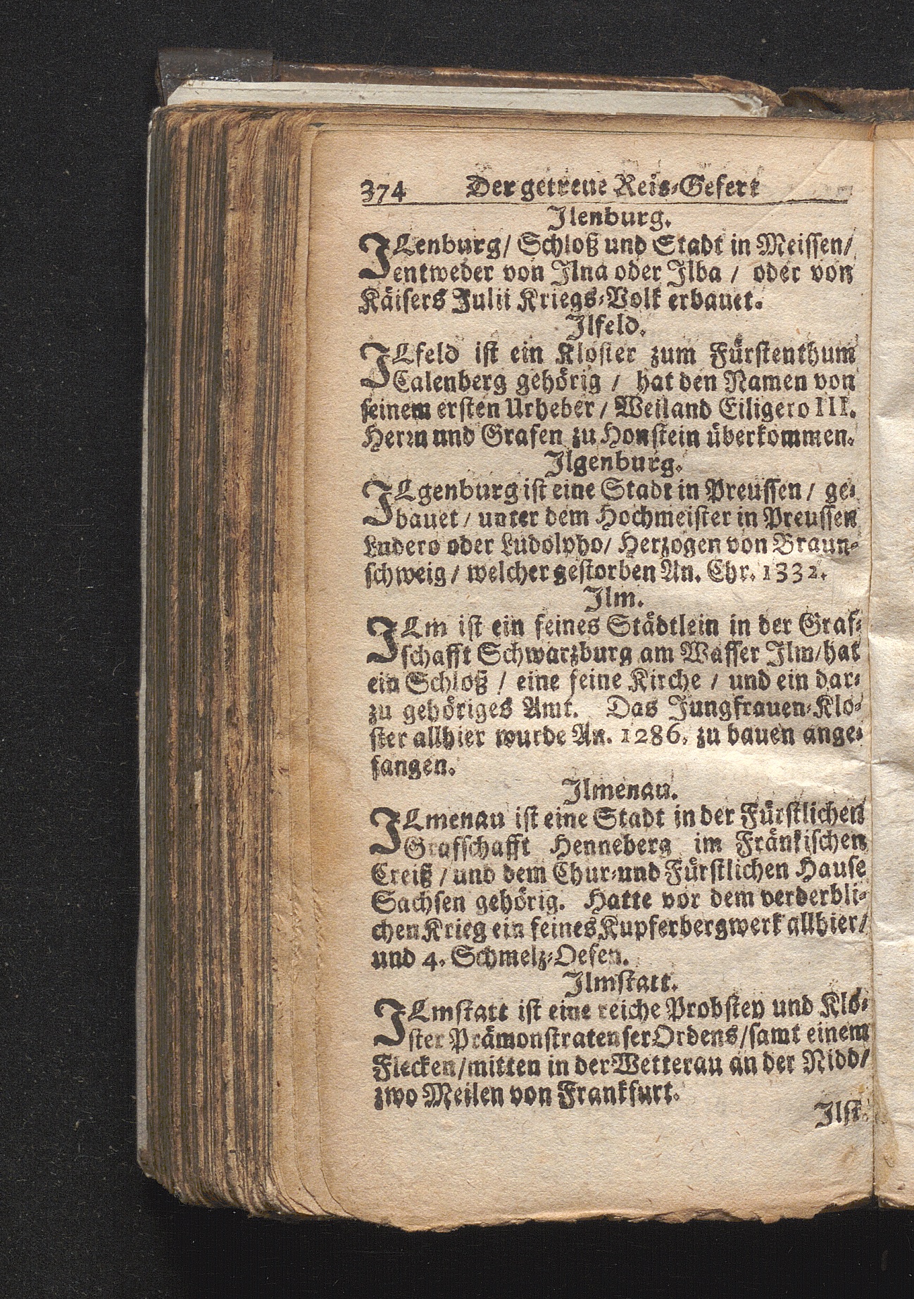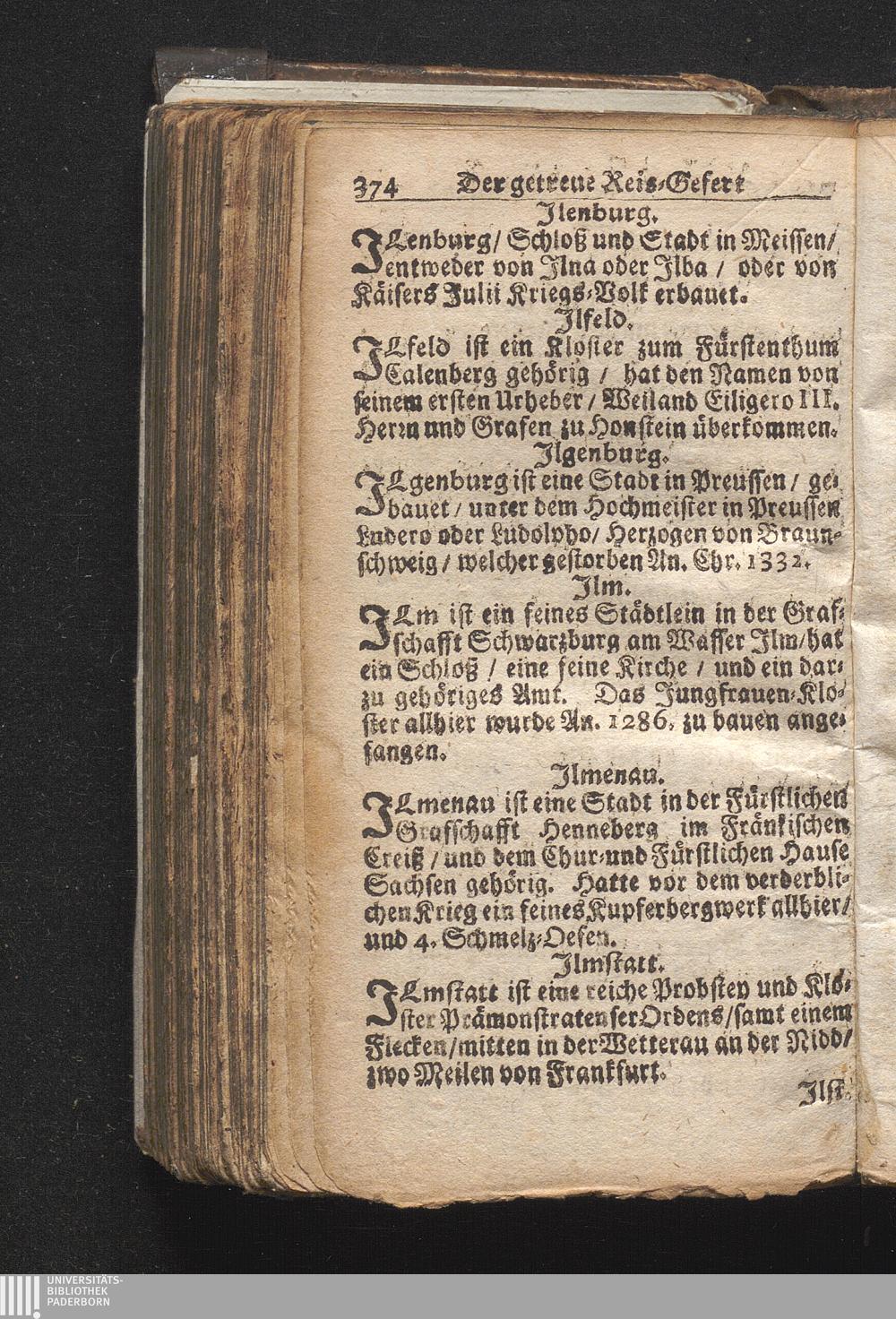Der getreue Reiß-Gefert durch Ober- und Nieder-Teutschland : Das ist: Grundrichtige und ausführliche Abhandlung derer jenigen Residenzien/ Städte/ Schlösser/ Vestungen/ Städtlein und nahmhafften Markflecken/ welche so wol in Ober- als Nieder-Teutschland/ einem Reisenden sich hin und wieder vorstellig machen und zwar solcher Gestalt/ daß darinn derer Ursprung/ Aufnahm/ Fortification/ Raritäten/ herrliche Gebäue/ und Glück- und Unglücks-Fälle bis auf gegenwärtige Zeit fortgesetzt enthalten. Dabey auch noch über das ein absonderlicher kurz-gefasster Weegweiser angehänget zu finden/ worinnen klärlich zu sehen, wie viel Meilen ein Ort von dem andern entlegen. Alles aus denen bewährtesten Scribenten hervorgesuchet/ zum Nutz-Ergötzen mitgetheilet ...
