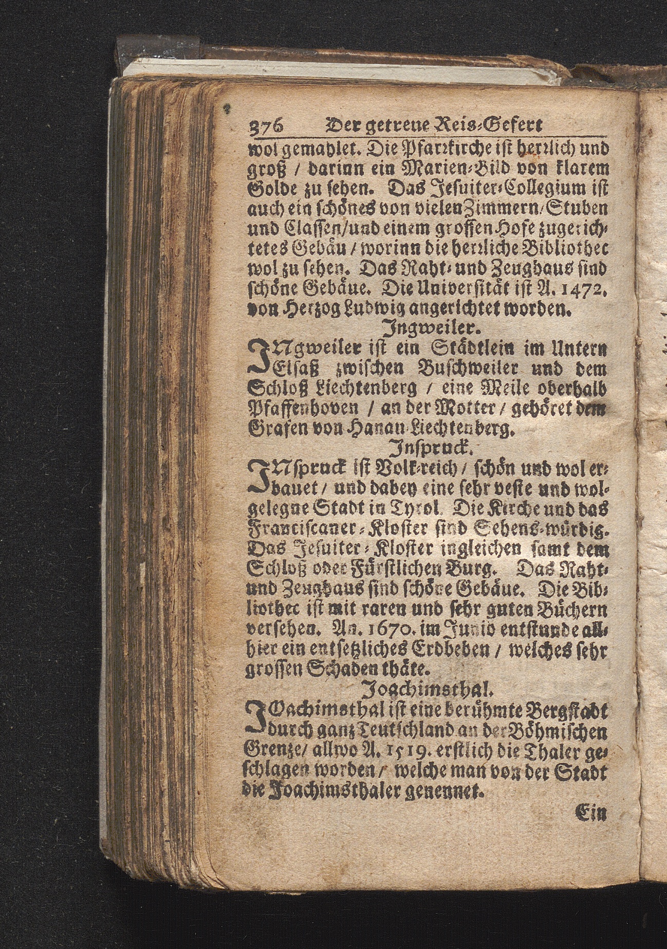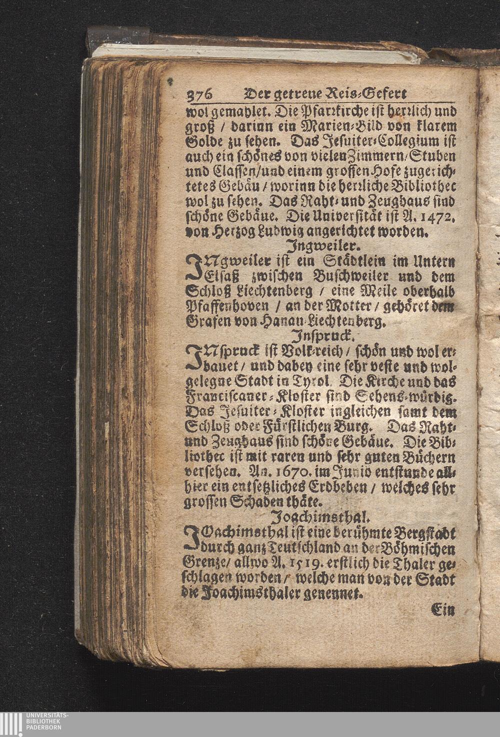 Der getreue Reiß-Gefert durch Ober- und Nieder-Teutschland : Das ist: Grundrichtige und ausführliche Abhandlung derer jenigen Residenzien/ Städte/ Schlösser/ Vestungen/ Städtlein und nahmhafften Markflecken/ welche so wol in Ober- als Nieder-Teutschland/ einem Reisenden sich hin und wieder vorstellig machen und zwar solcher Gestalt/ daß darinn derer Ursprung/ Aufnahm/ Fortification/ Raritäten/ herrliche Gebäue/ und Glück- und Unglücks-Fälle bis auf gegenwärtige Zeit fortgesetzt enthalten. Dabey auch noch über das ein absonderlicher kurz-gefasster Weegweiser angehänget zu finden/ worinnen klärlich zu sehen, wie viel Meilen ein Ort von dem andern entlegen. Alles aus denen bewährtesten Scribenten hervorgesuchet/ zum Nutz-Ergötzen mitgetheilet ...