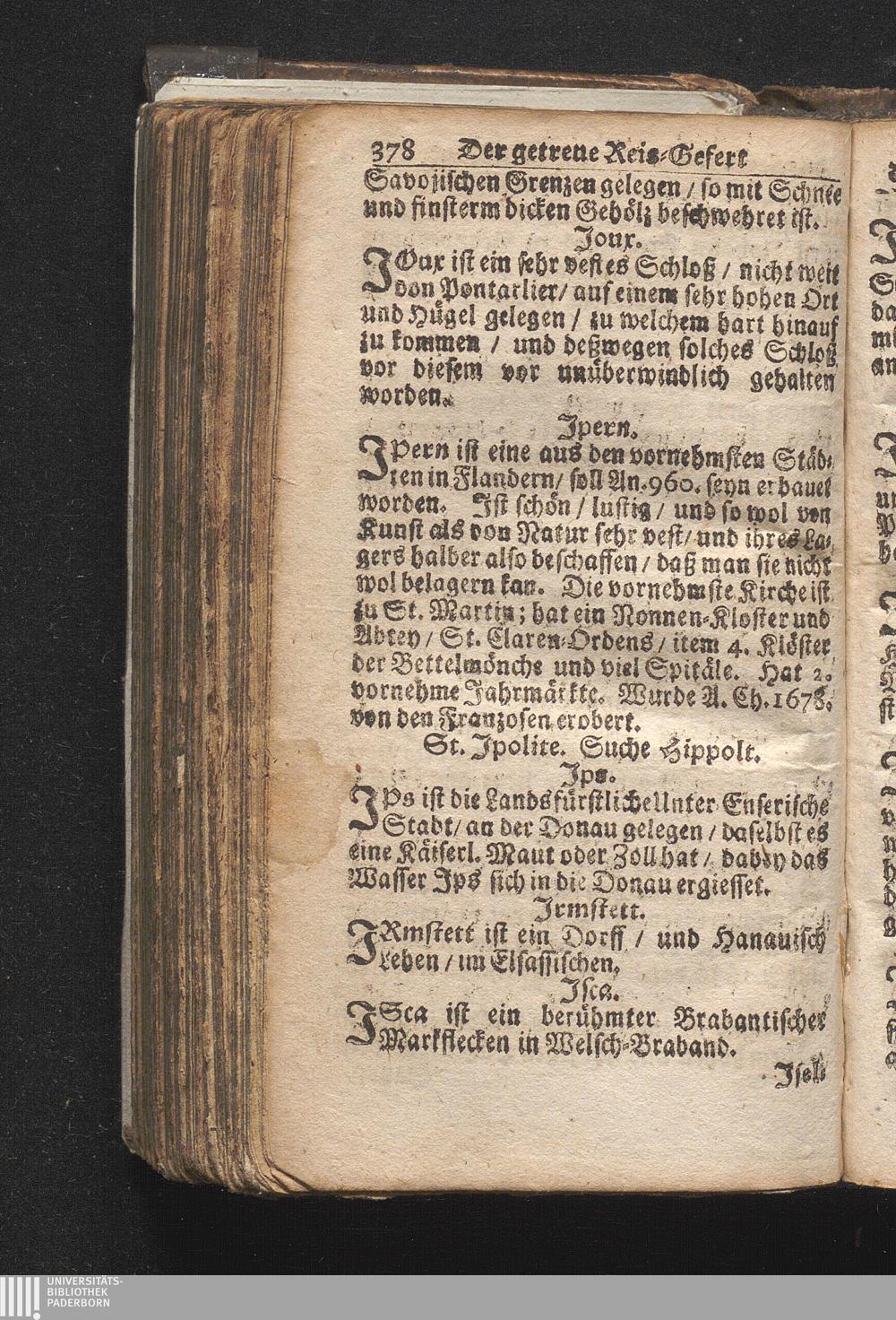Der getreue Reiß-Gefert durch Ober- und Nieder-Teutschland : Das ist: Grundrichtige und ausführliche Abhandlung derer jenigen Residenzien/ Städte/ Schlösser/ Vestungen/ Städtlein und nahmhafften Markflecken/ welche so wol in Ober- als Nieder-Teutschland/ einem Reisenden sich hin und wieder vorstellig machen und zwar solcher Gestalt/ daß darinn derer Ursprung/ Aufnahm/ Fortification/ Raritäten/ herrliche Gebäue/ und Glück- und Unglücks-Fälle bis auf gegenwärtige Zeit fortgesetzt enthalten. Dabey auch noch über das ein absonderlicher kurz-gefasster Weegweiser angehänget zu finden/ worinnen klärlich zu sehen, wie viel Meilen ein Ort von dem andern entlegen. Alles aus denen bewährtesten Scribenten hervorgesuchet/ zum Nutz-Ergötzen mitgetheilet ...