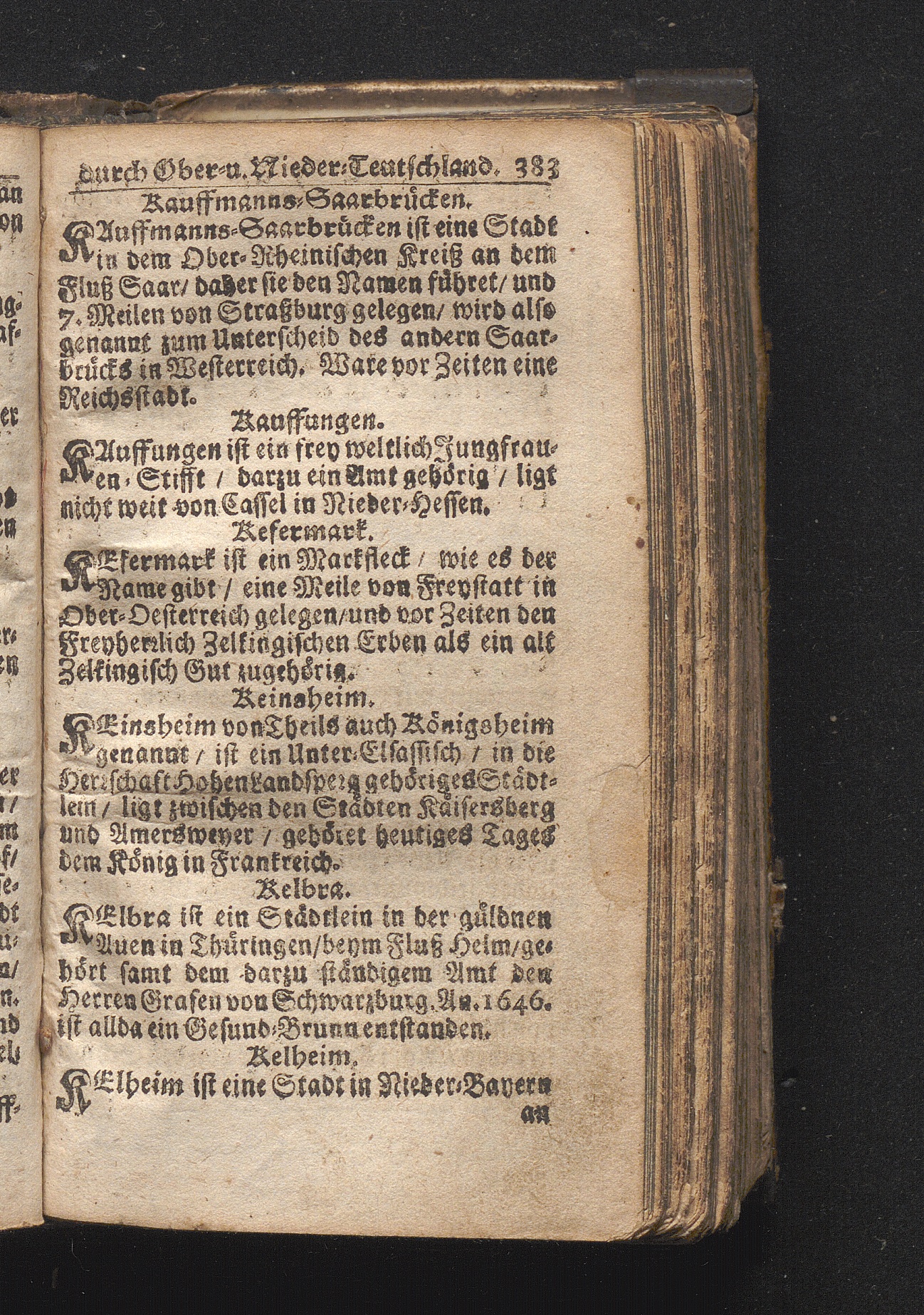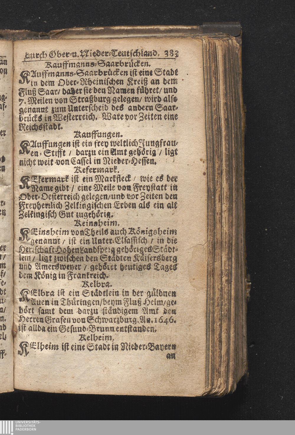Der getreue Reiß-Gefert durch Ober- und Nieder-Teutschland : Das ist: Grundrichtige und ausführliche Abhandlung derer jenigen Residenzien/ Städte/ Schlösser/ Vestungen/ Städtlein und nahmhafften Markflecken/ welche so wol in Ober- als Nieder-Teutschland/ einem Reisenden sich hin und wieder vorstellig machen und zwar solcher Gestalt/ daß darinn derer Ursprung/ Aufnahm/ Fortification/ Raritäten/ herrliche Gebäue/ und Glück- und Unglücks-Fälle bis auf gegenwärtige Zeit fortgesetzt enthalten. Dabey auch noch über das ein absonderlicher kurz-gefasster Weegweiser angehänget zu finden/ worinnen klärlich zu sehen, wie viel Meilen ein Ort von dem andern entlegen. Alles aus denen bewährtesten Scribenten hervorgesuchet/ zum Nutz-Ergötzen mitgetheilet ...