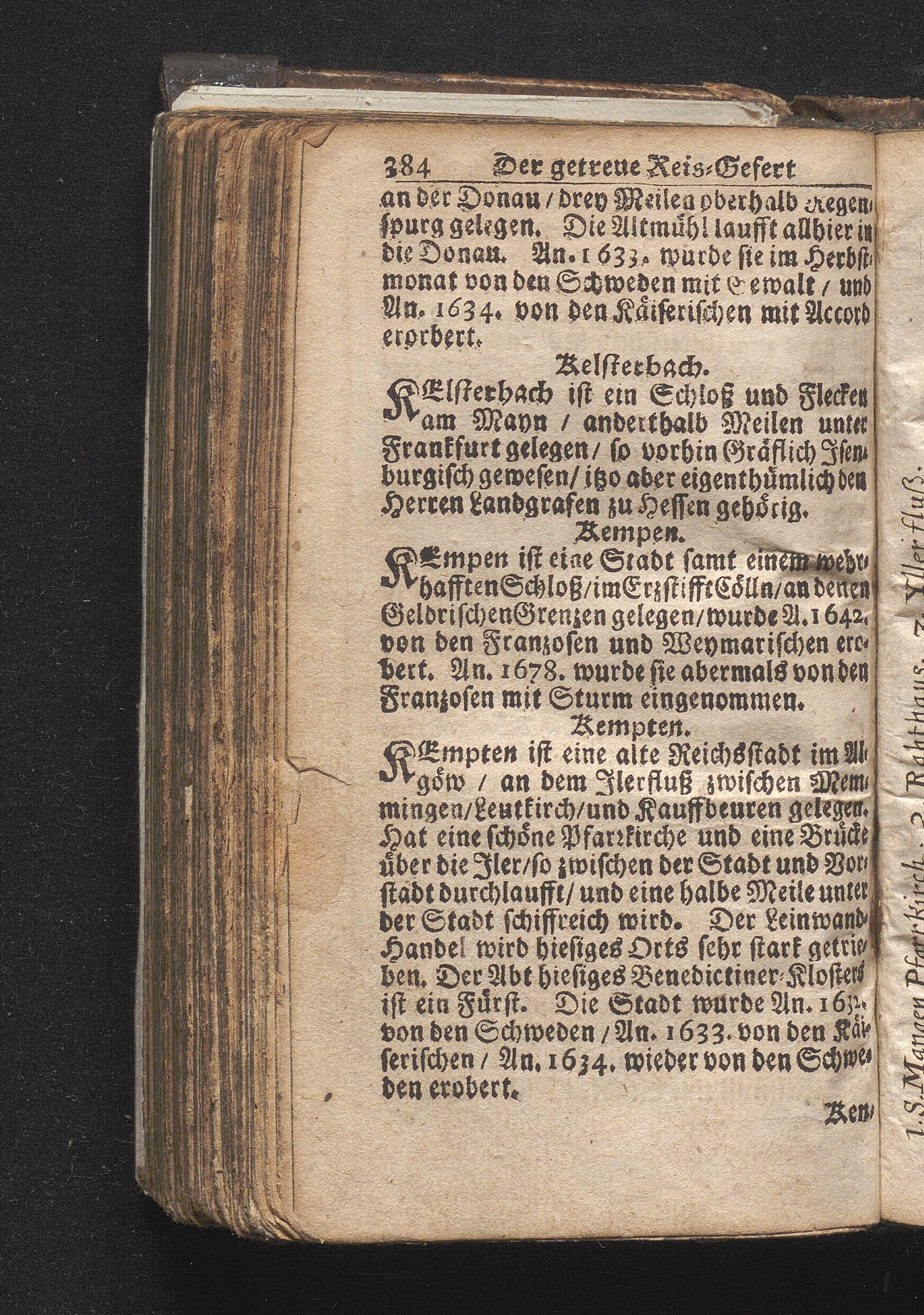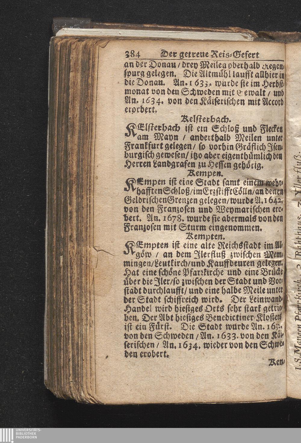Der getreue Reiß-Gefert durch Ober- und Nieder-Teutschland : Das ist: Grundrichtige und ausführliche Abhandlung derer jenigen Residenzien/ Städte/ Schlösser/ Vestungen/ Städtlein und nahmhafften Markflecken/ welche so wol in Ober- als Nieder-Teutschland/ einem Reisenden sich hin und wieder vorstellig machen und zwar solcher Gestalt/ daß darinn derer Ursprung/ Aufnahm/ Fortification/ Raritäten/ herrliche Gebäue/ und Glück- und Unglücks-Fälle bis auf gegenwärtige Zeit fortgesetzt enthalten. Dabey auch noch über das ein absonderlicher kurz-gefasster Weegweiser angehänget zu finden/ worinnen klärlich zu sehen, wie viel Meilen ein Ort von dem andern entlegen. Alles aus denen bewährtesten Scribenten hervorgesuchet/ zum Nutz-Ergötzen mitgetheilet ...